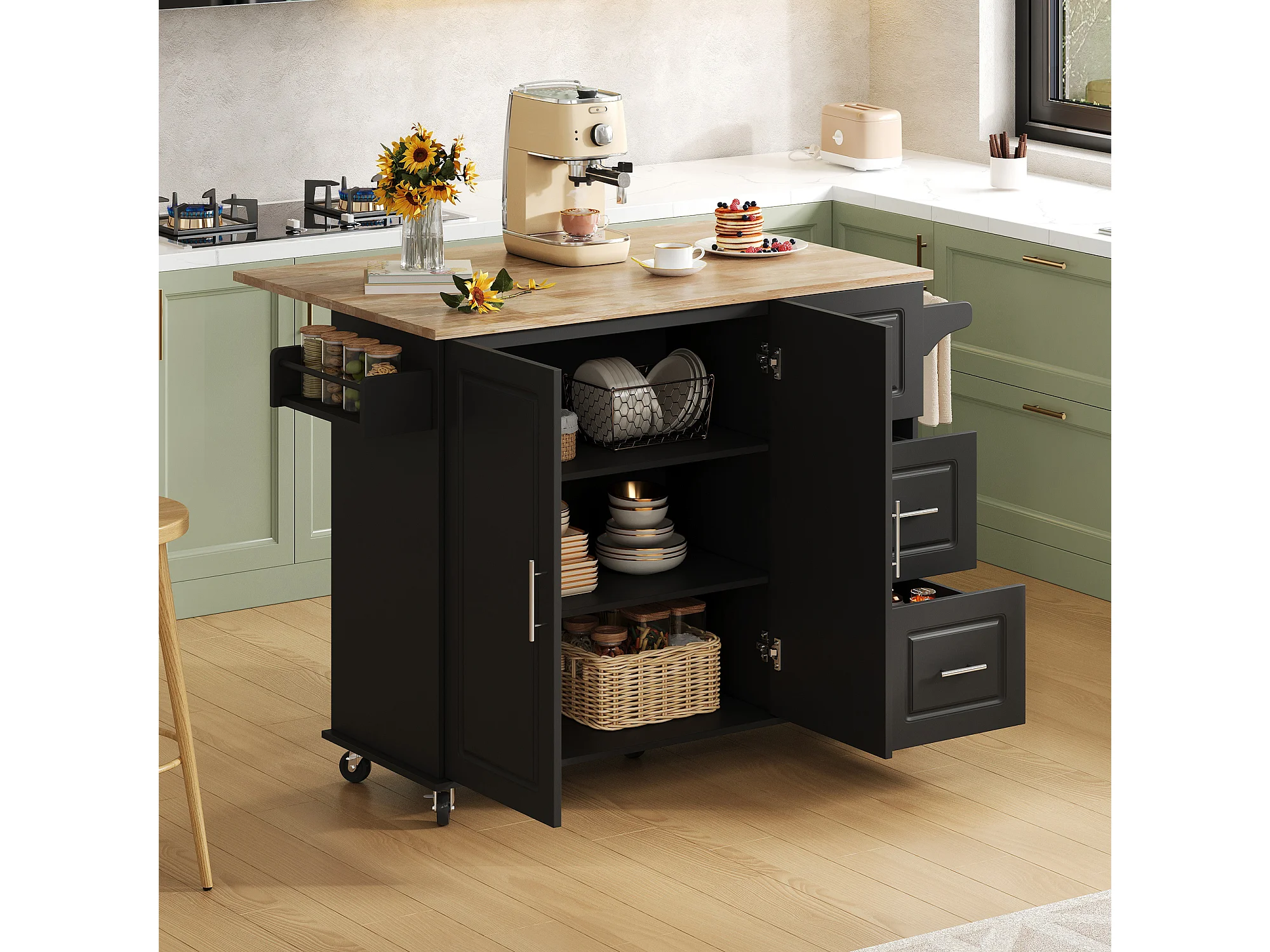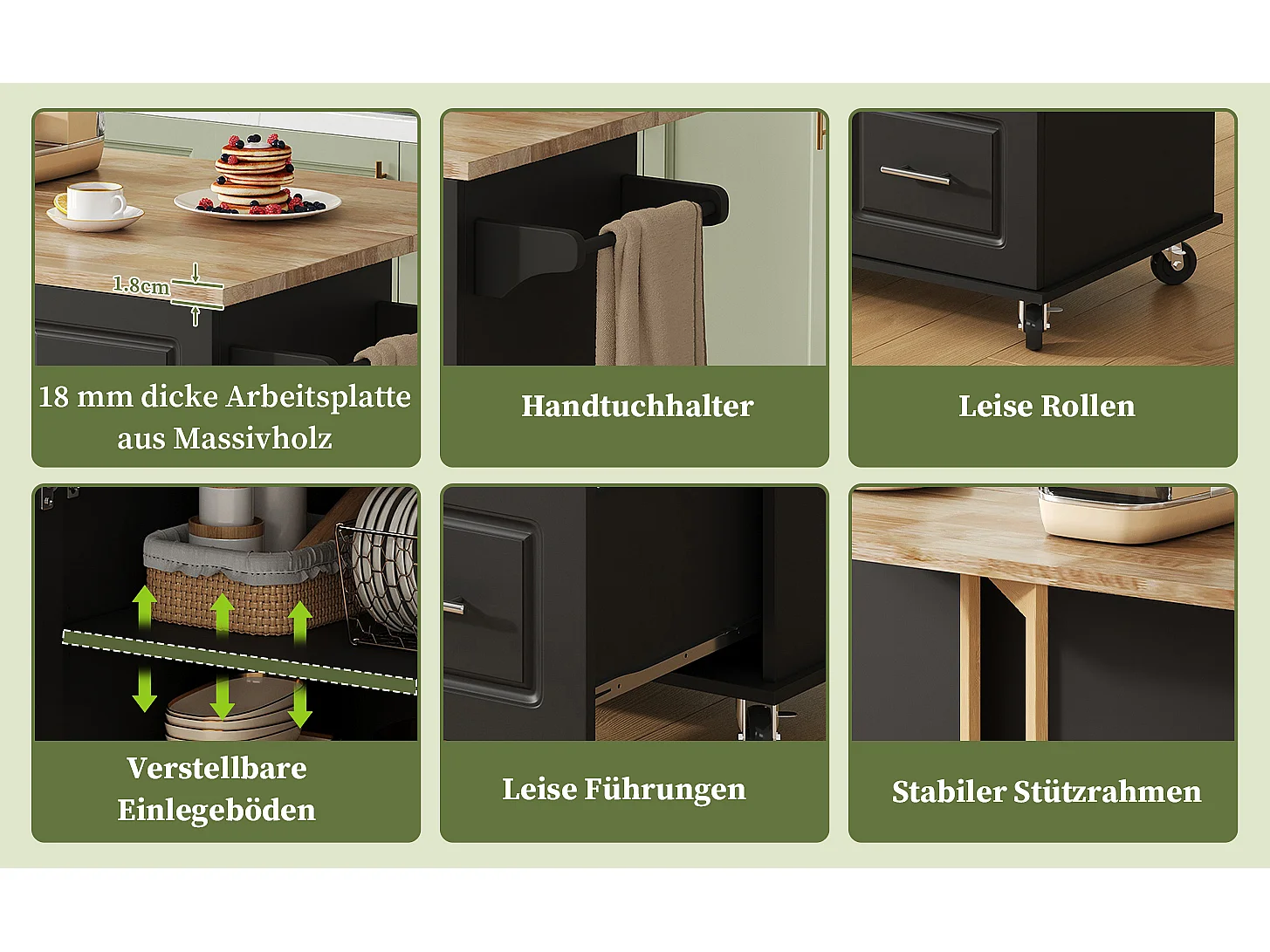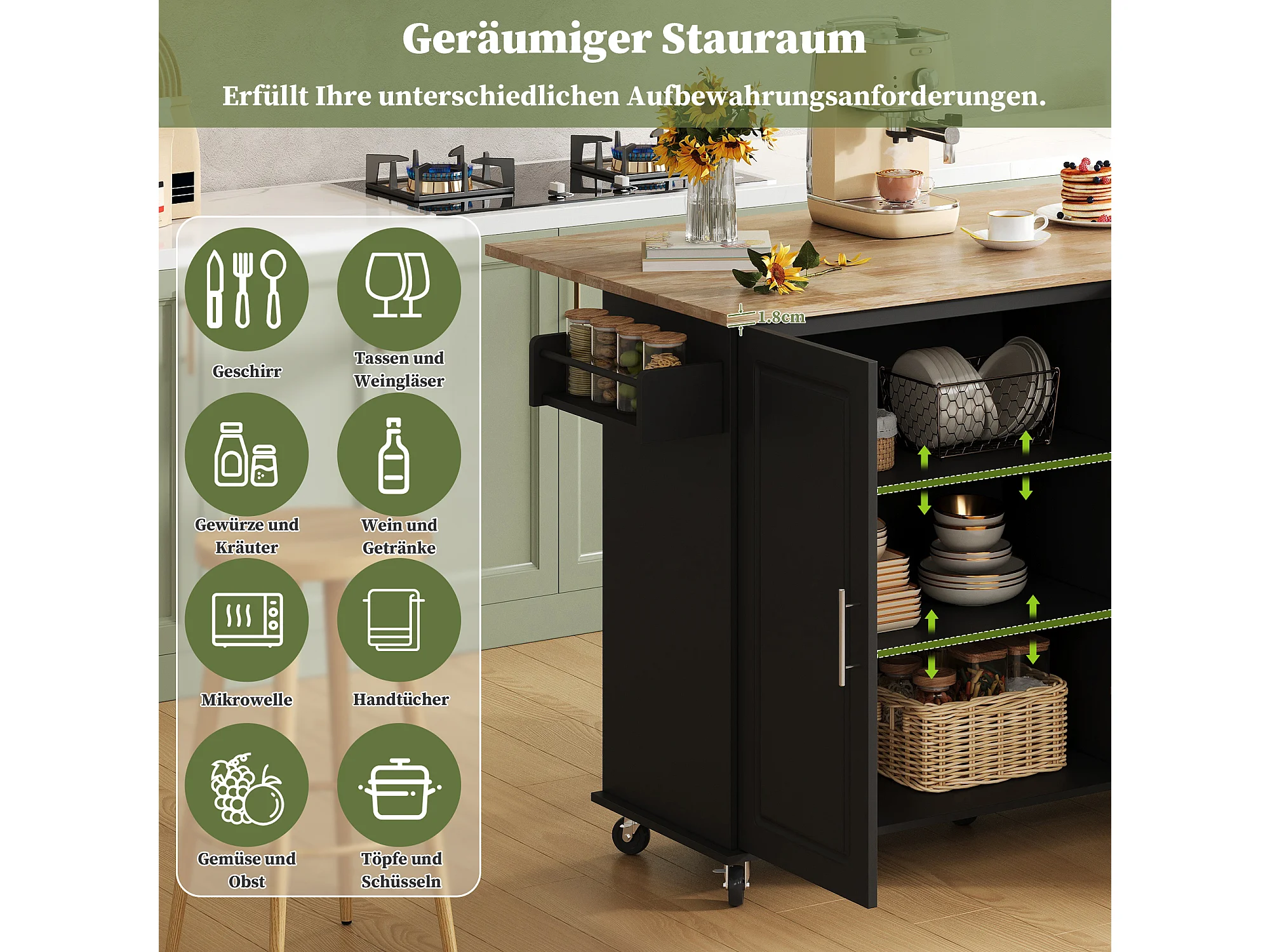 Verplaatsbaar keukeneiland - 137 x 43 (76) x 92 cm - inklapbaar blad - met 3 lades + 2 deuren - MDF - zwart