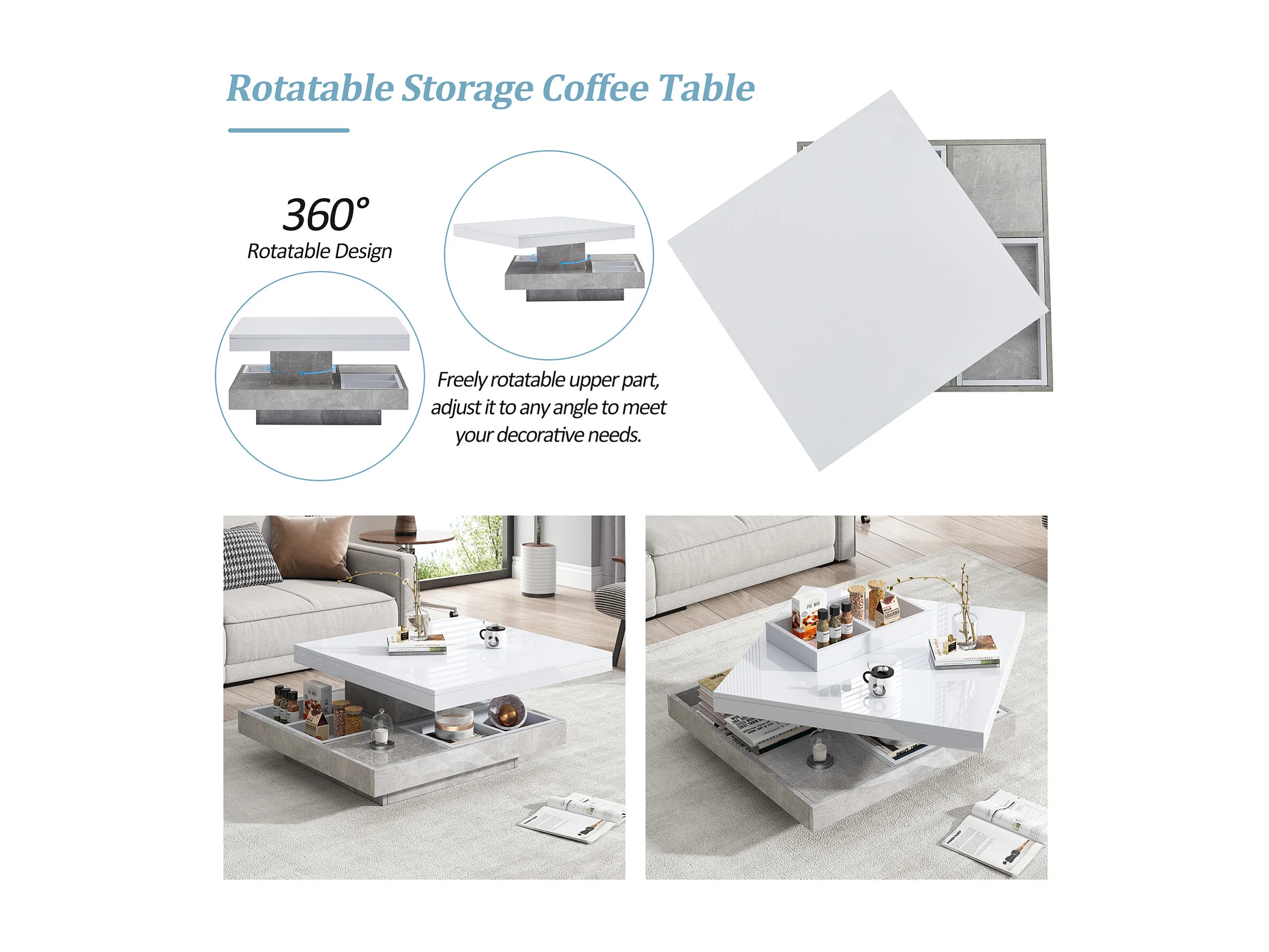 Salontafel met opbergruimte 70x70x36 cm - glanzend blad 360° draaibaar - Wit & Grijs