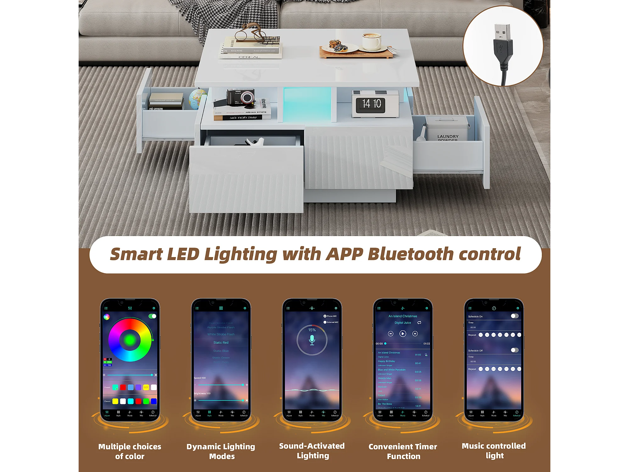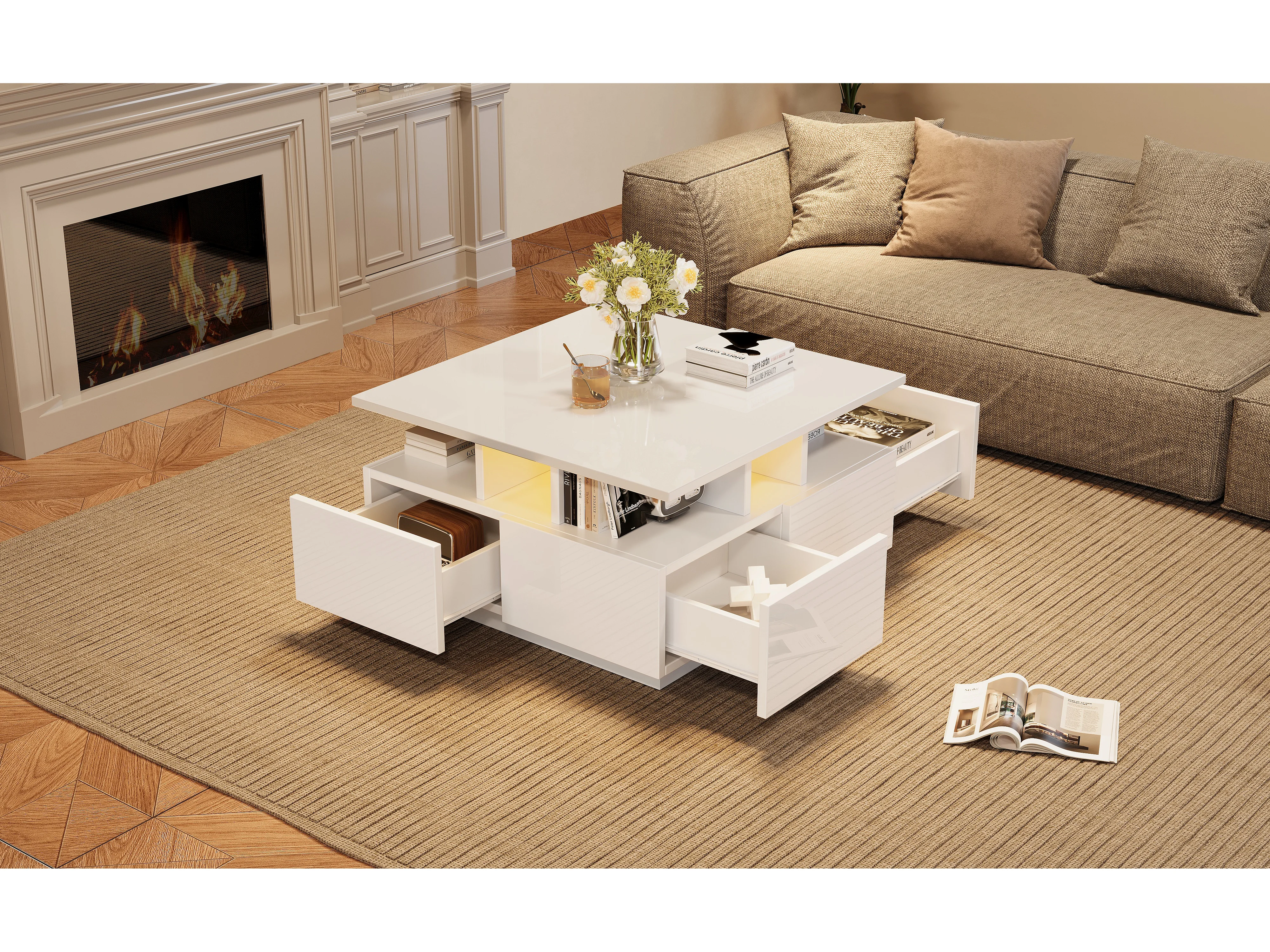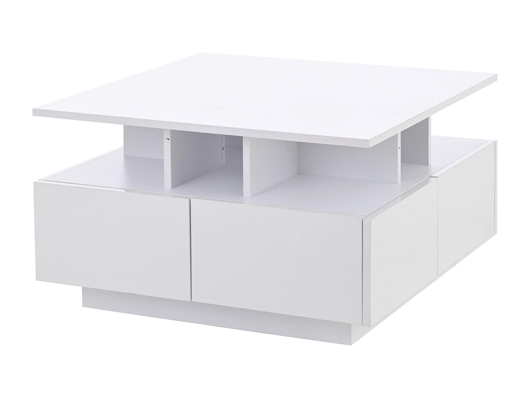 Vierkante salontafel met 4 lades en ledverlichting - Glanzend witte afwerking