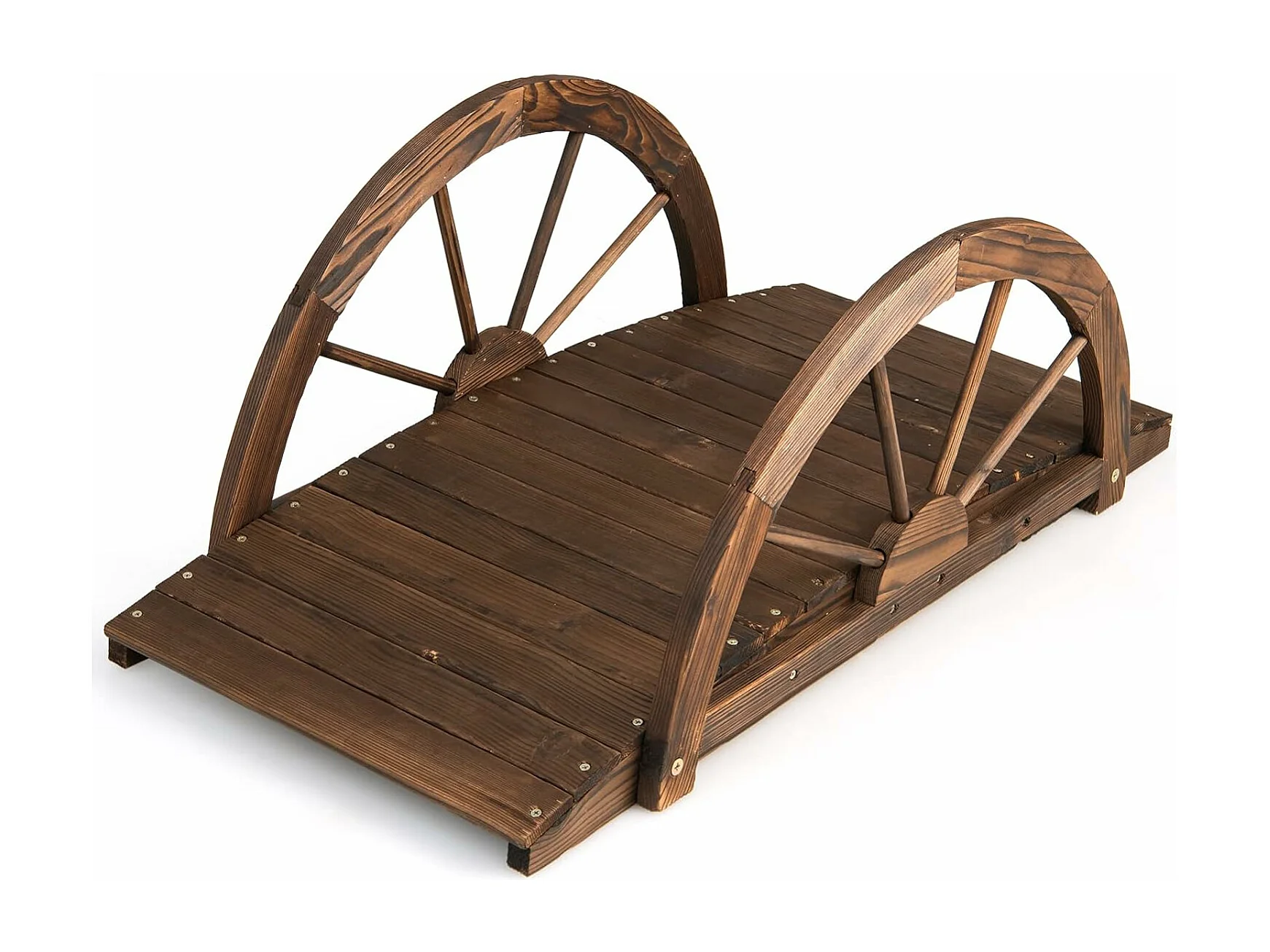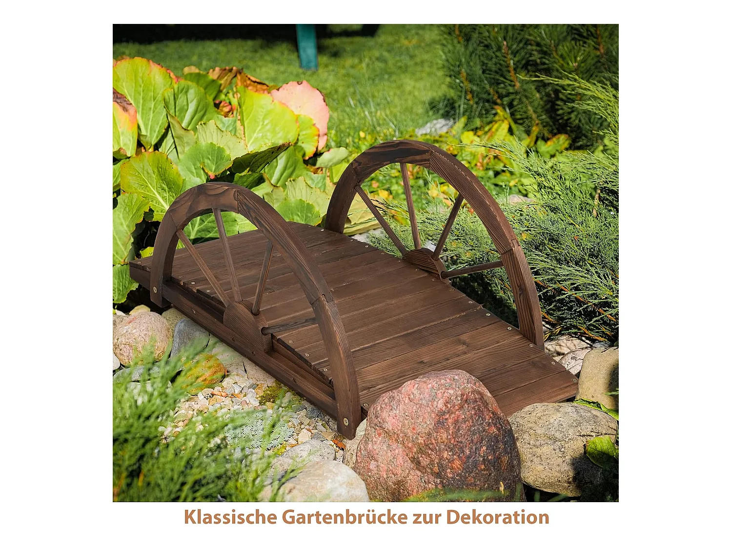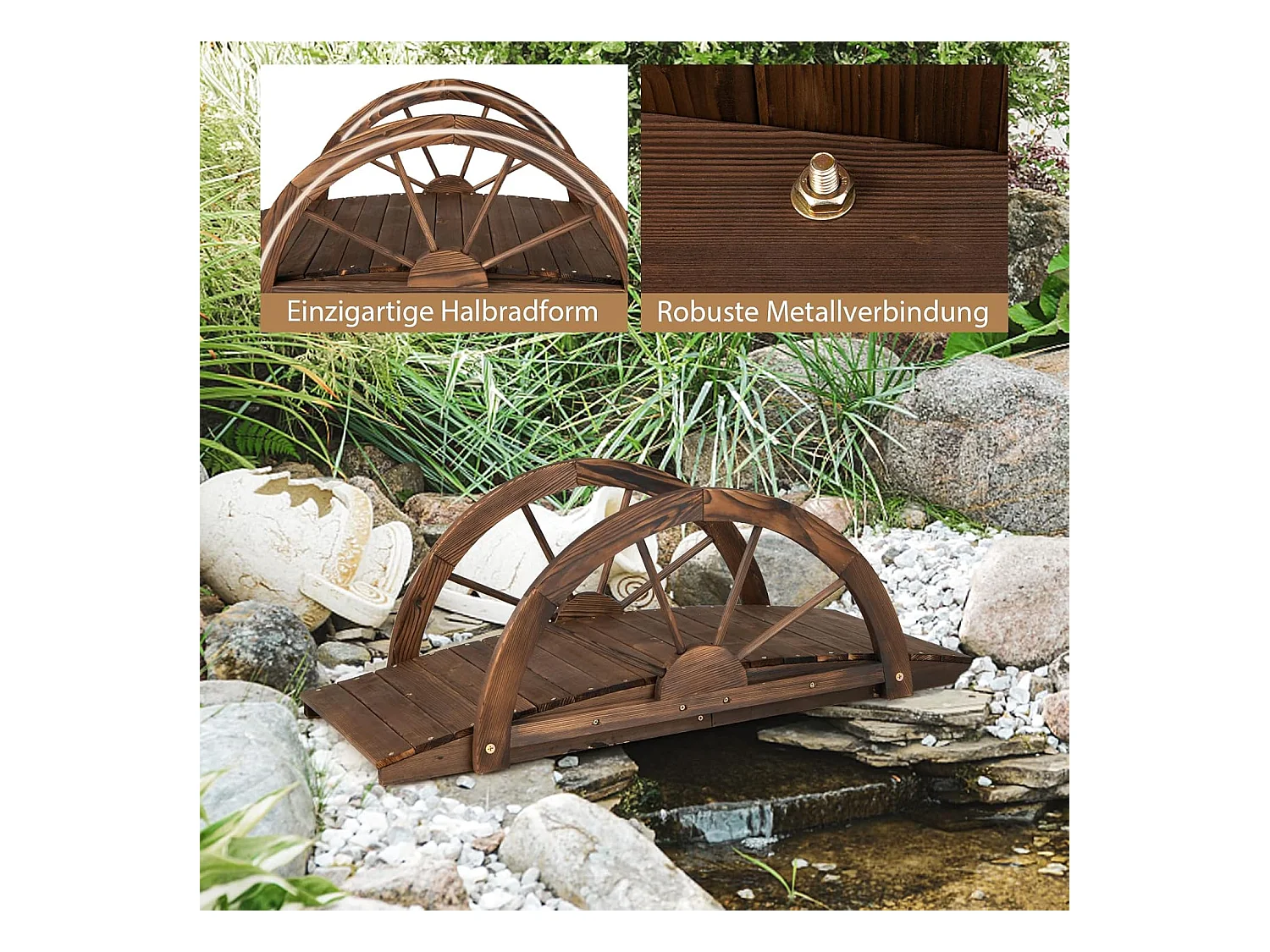 Vijverbrug, tuinbrug, houten brug met dubbele halfronde leuningen, decoratieve brug van dennenhout, sierbrug voor tuin, vijver, 101 x 48,5 x 38 cm ZB32026
