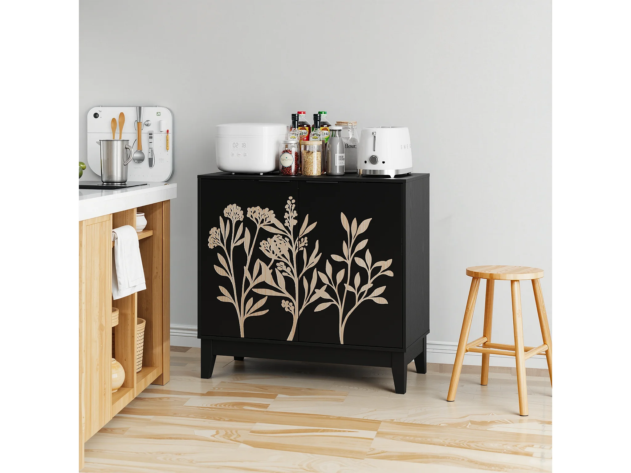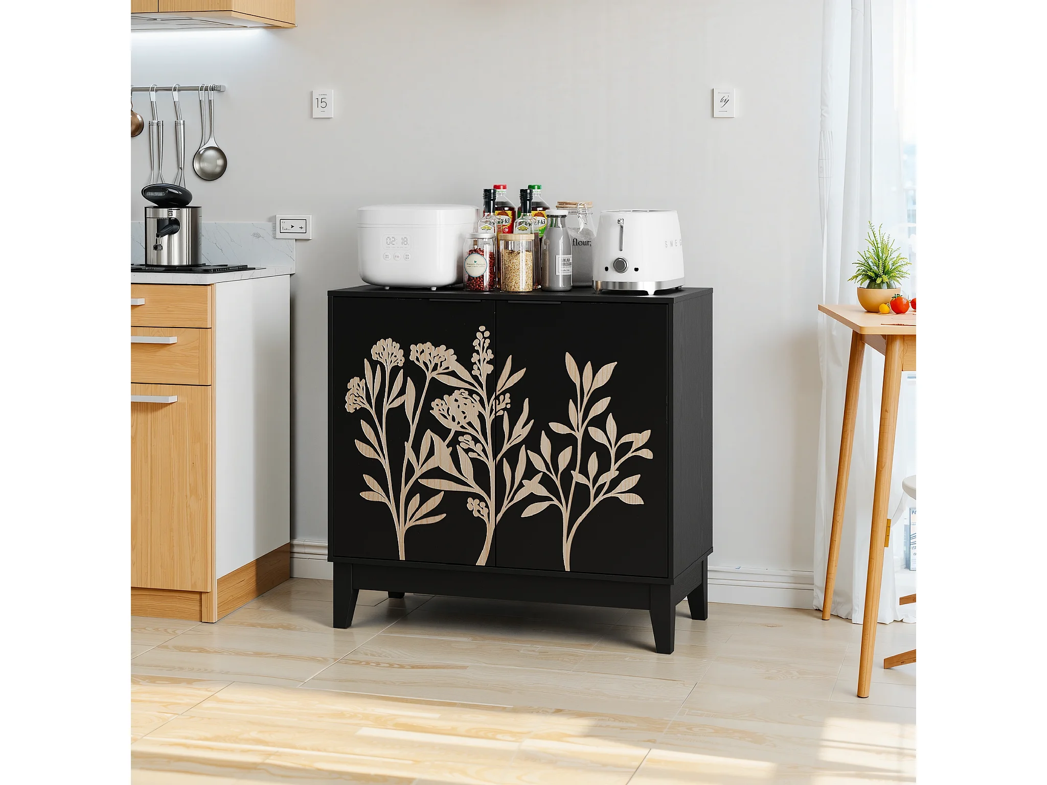 Vintage dressoir met bloemensnijwerk, MDF, zwart (80x38x76 cm)