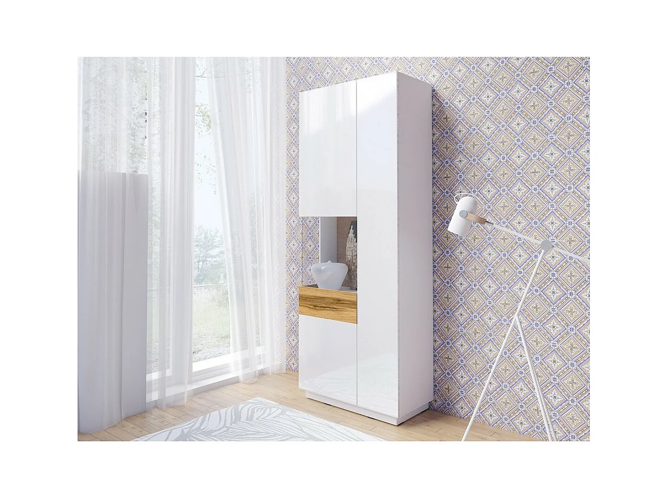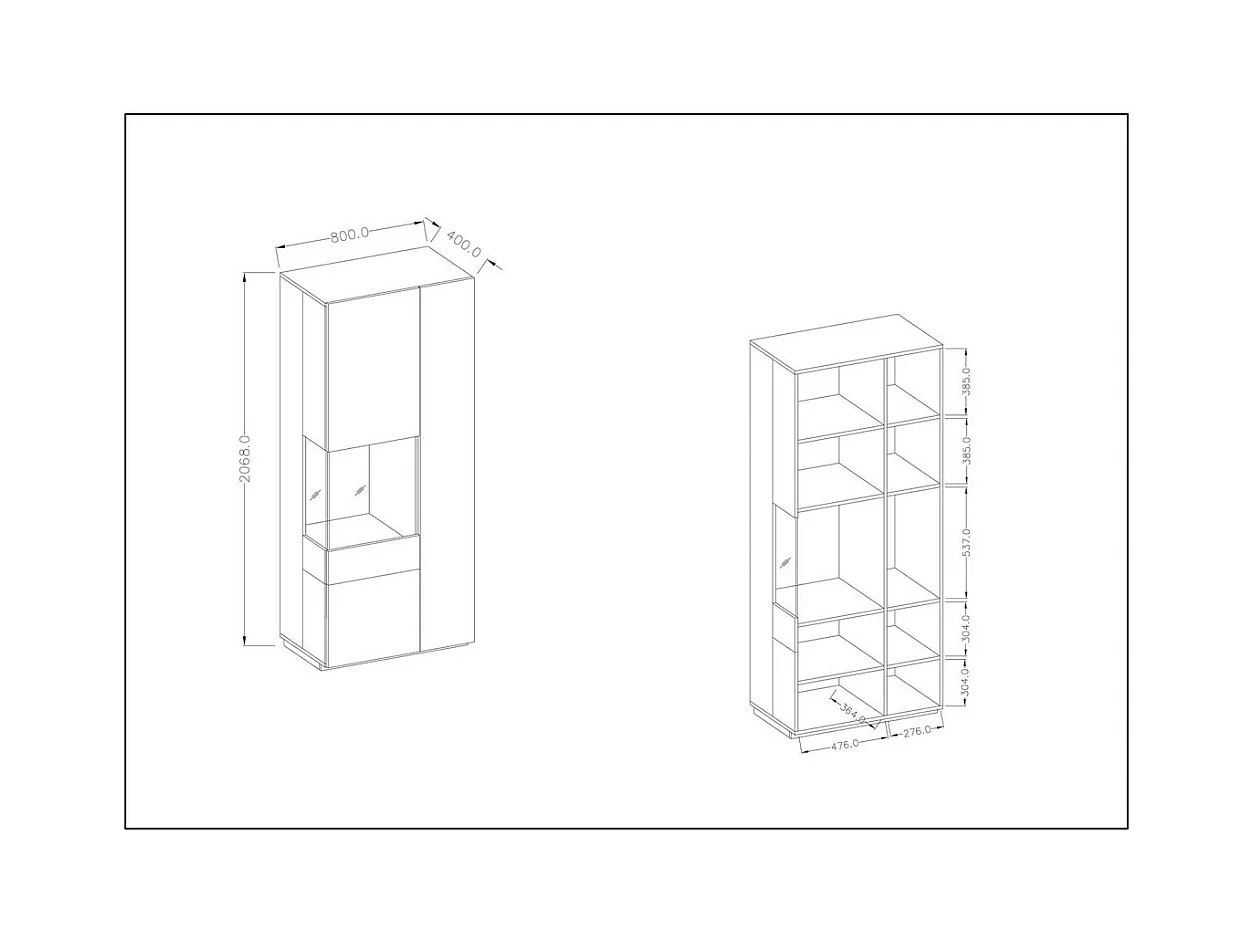 Vitrine, boekenkast, servieskast KILES in grijs, wit en eiken. Model met vitrine aan de linkerkant. Ingebouwde LED.