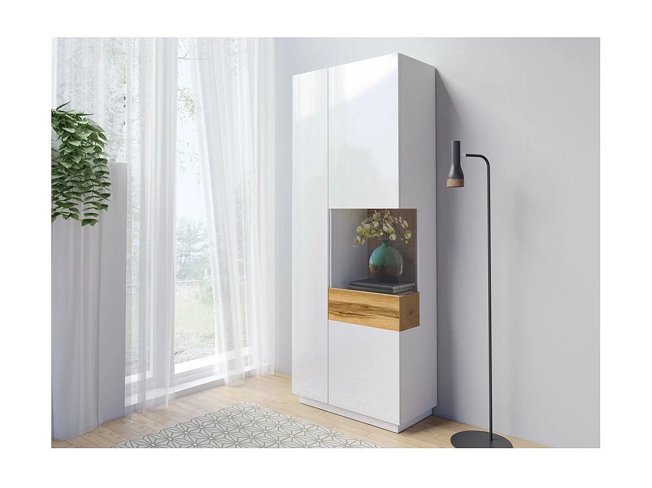 Vitrine, boekenkast, servieskast KILES in wit en eiken kleur. Model rechte vitrine.