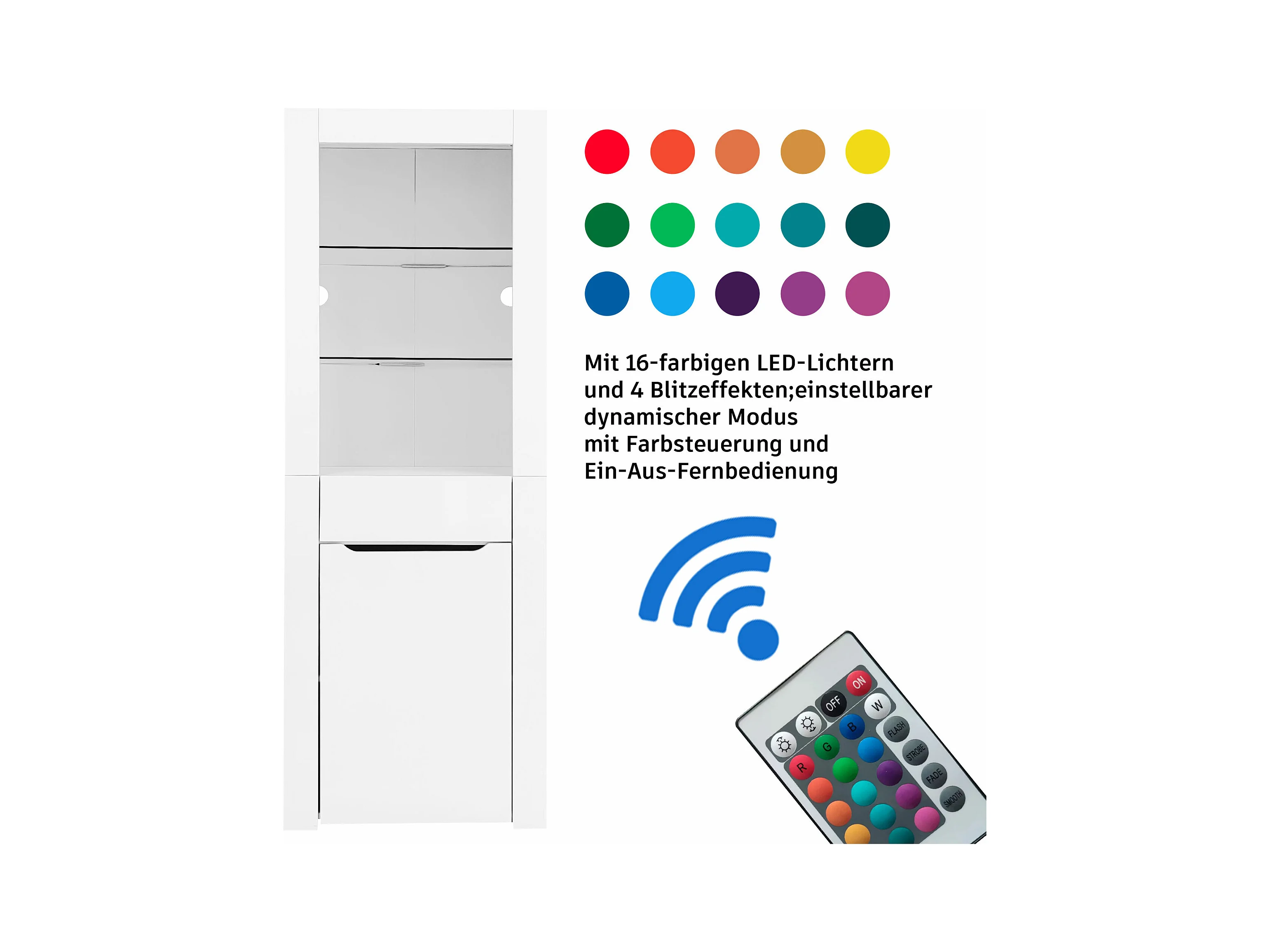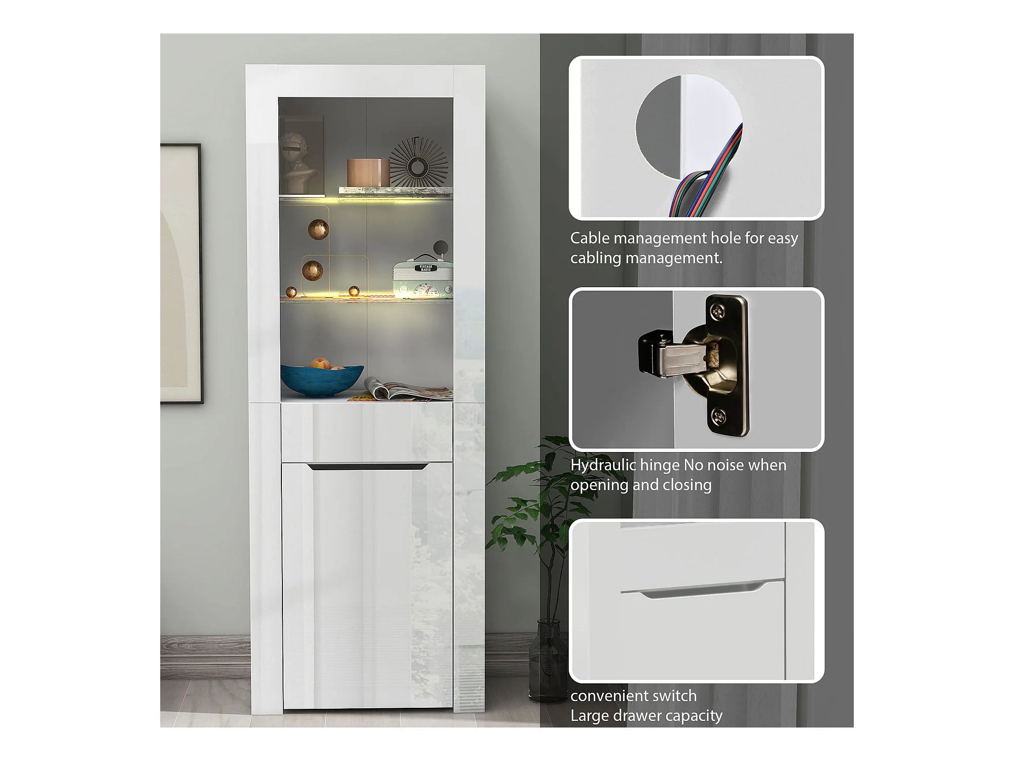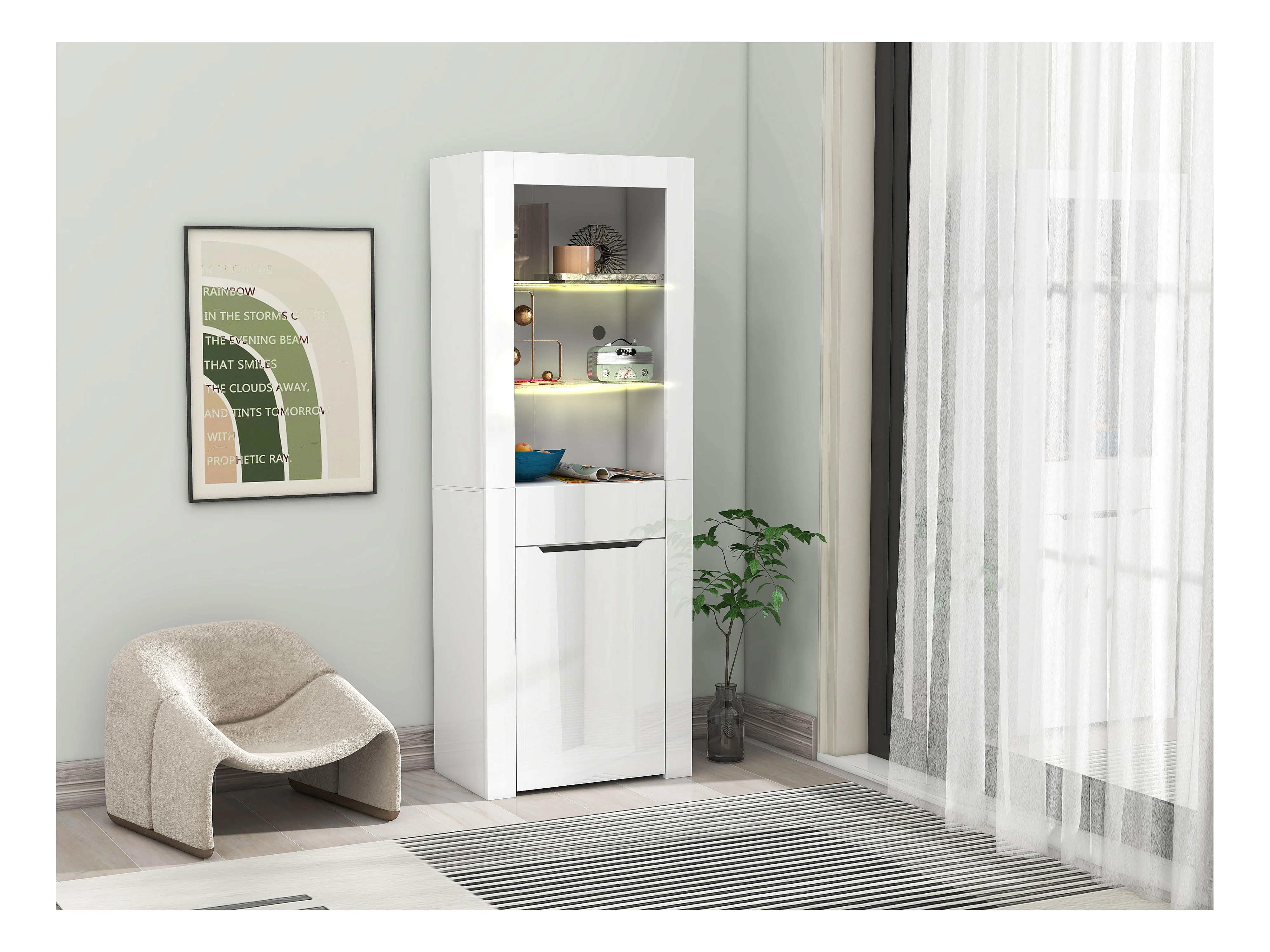 Vitrine met 1 deur en 1 lade - LED's - 3 planken - 60 x 35,5 x 165 cm - Spaanplaat - Glanzend wit