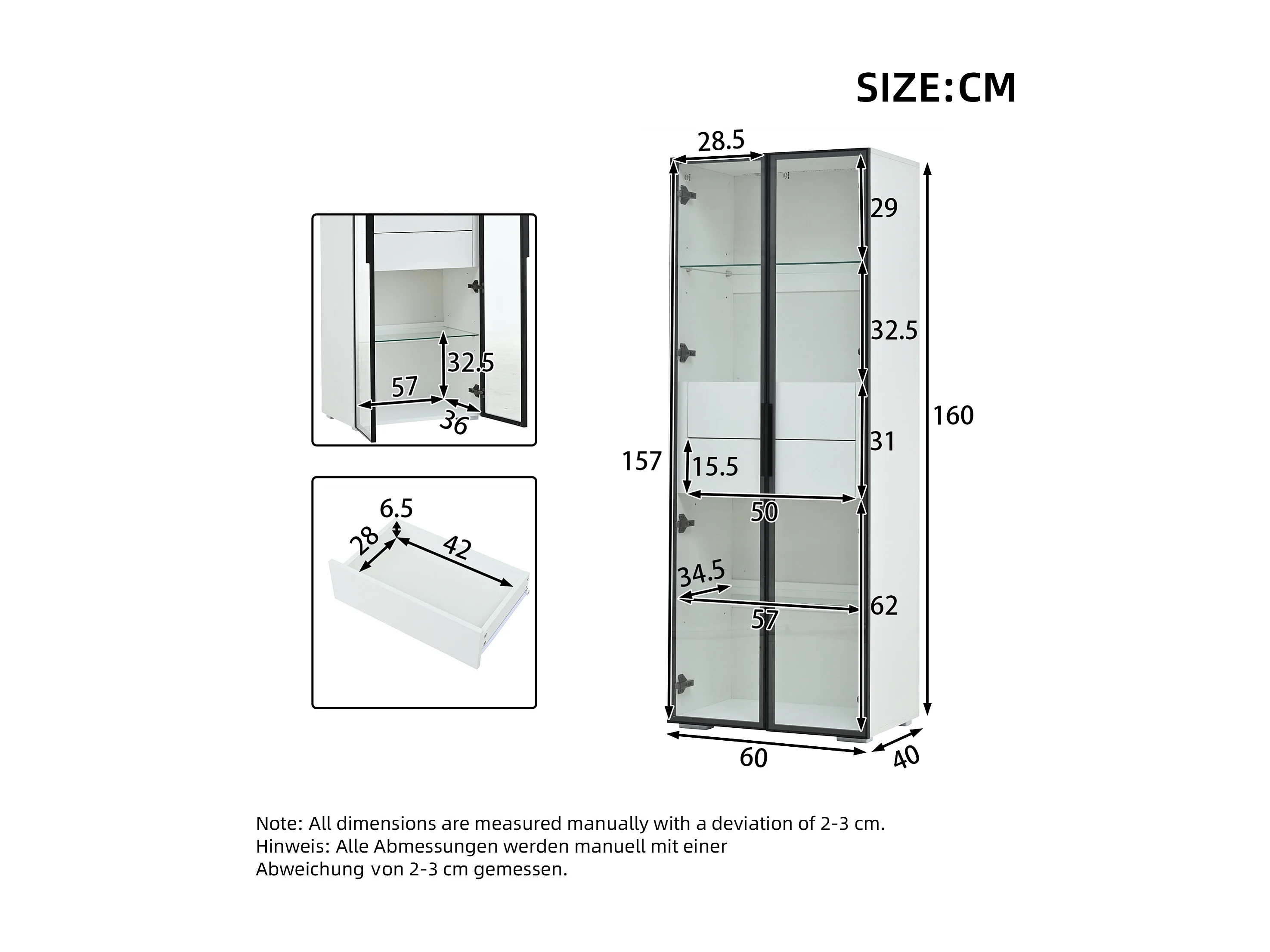Vitrinekast 60x40x171 cm met ledverlichting. Twee lades en drie opbergvakken. Witte spaanplaatpanelen. Geschikt voor woon- en eetkamer.