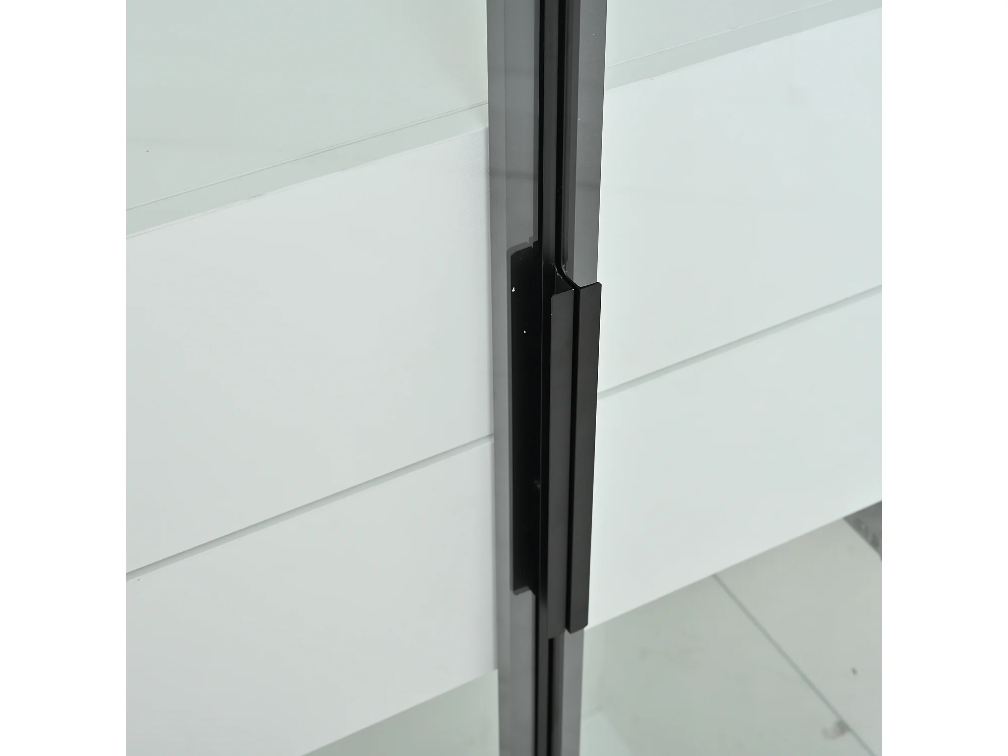 Vitrinekast van gehard glas met 2 lagen, deur, wit metalen frame en geïntegreerde ledverlichting – modern en elegant design