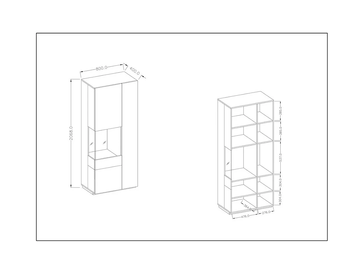 Vitrinekast, boekenkast, servieskast KILES in antracietgrijs en eiken. Model met de vitrine aan de linkerkant.