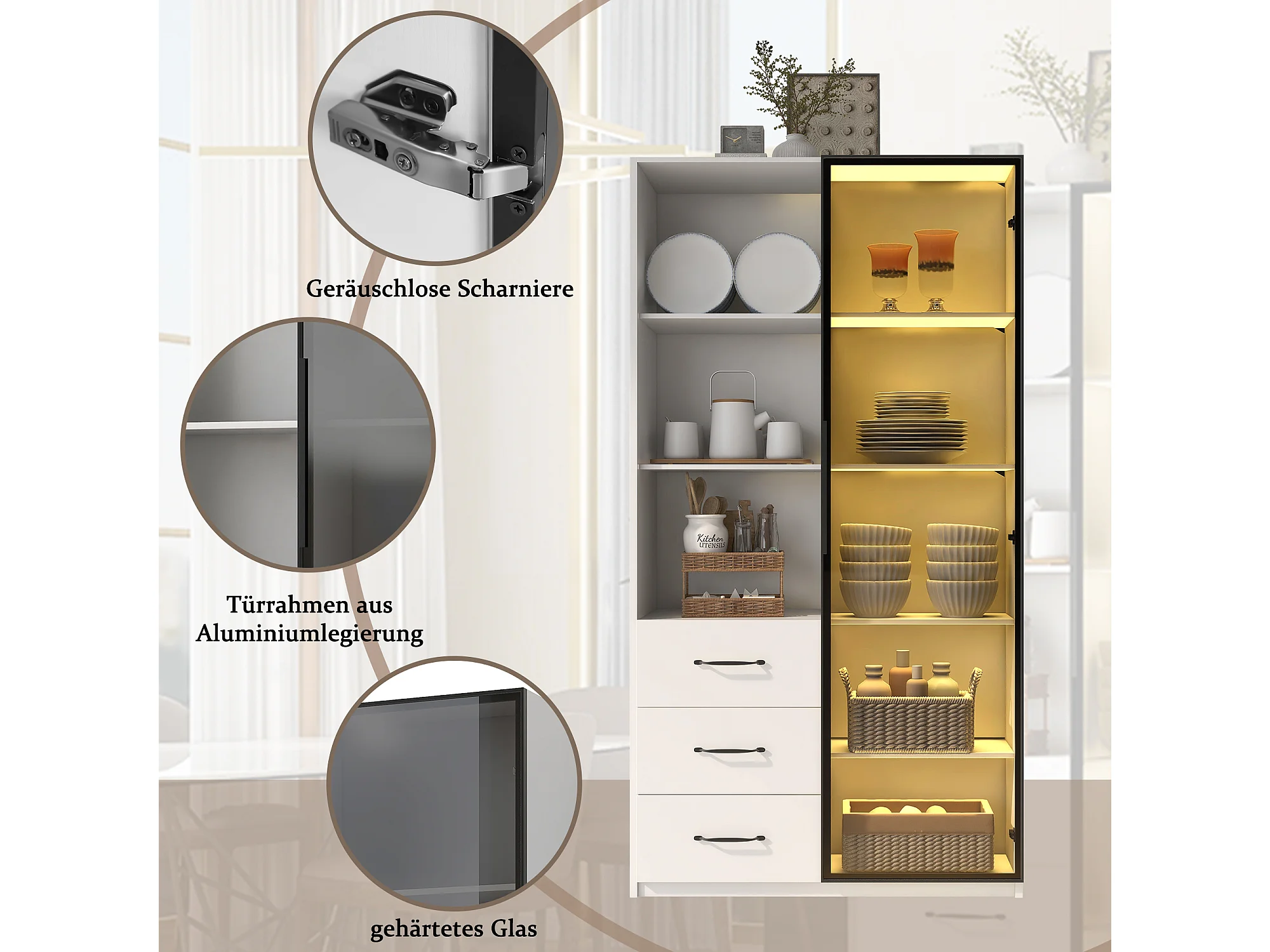 Vitrinekast met boekenplank - 80 x 40 x 160 cm - met deur van gehard glas + LED-verlichting + 3 lades - spaanplaat - wit