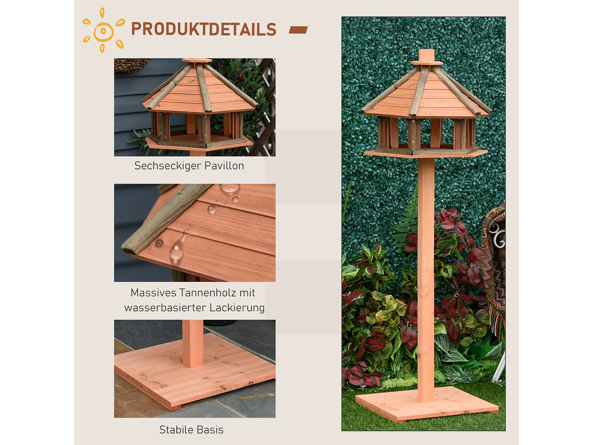 Zeshoekige voederbak met zinken dak, stabiele voet, dennenhout, naturel (40x40x113cm)