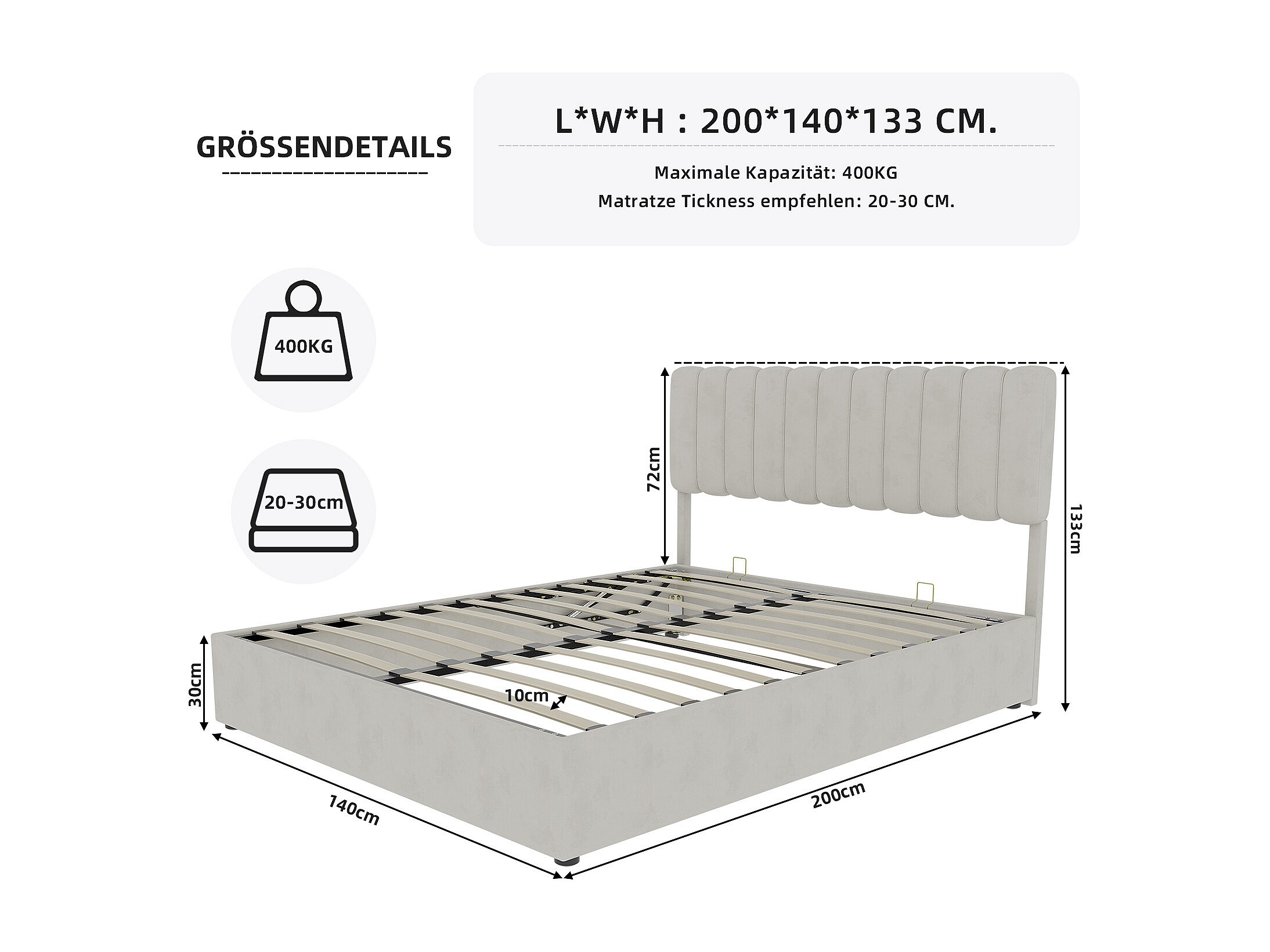 Opbergbed 140 x 200 cm - Tweepersoonsbed met zacht hoofdeinde en opbergruimte - beige fluweel - matras niet inbegrepen