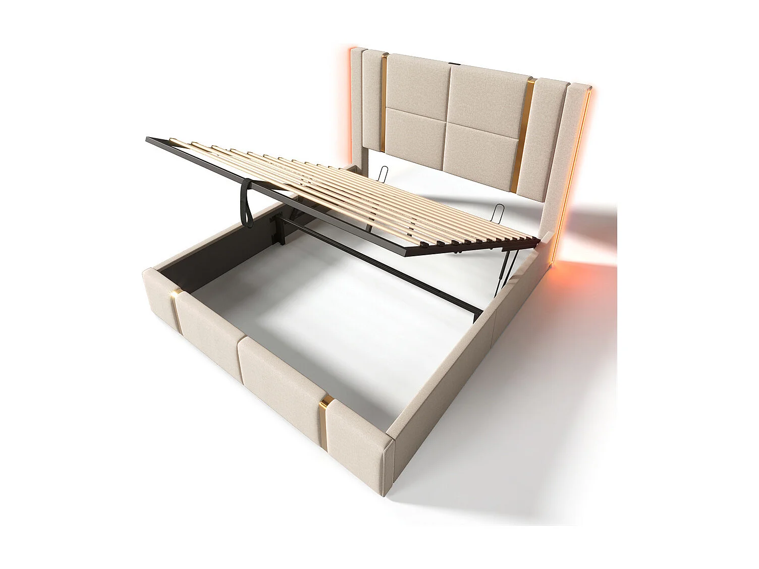 Hydraulisch gestoffeerd bed 140x200cm, tweepersoonsbed, opbergruimte aan het hoofdeinde met USB- en Type C-aansluiting, linnen, beige