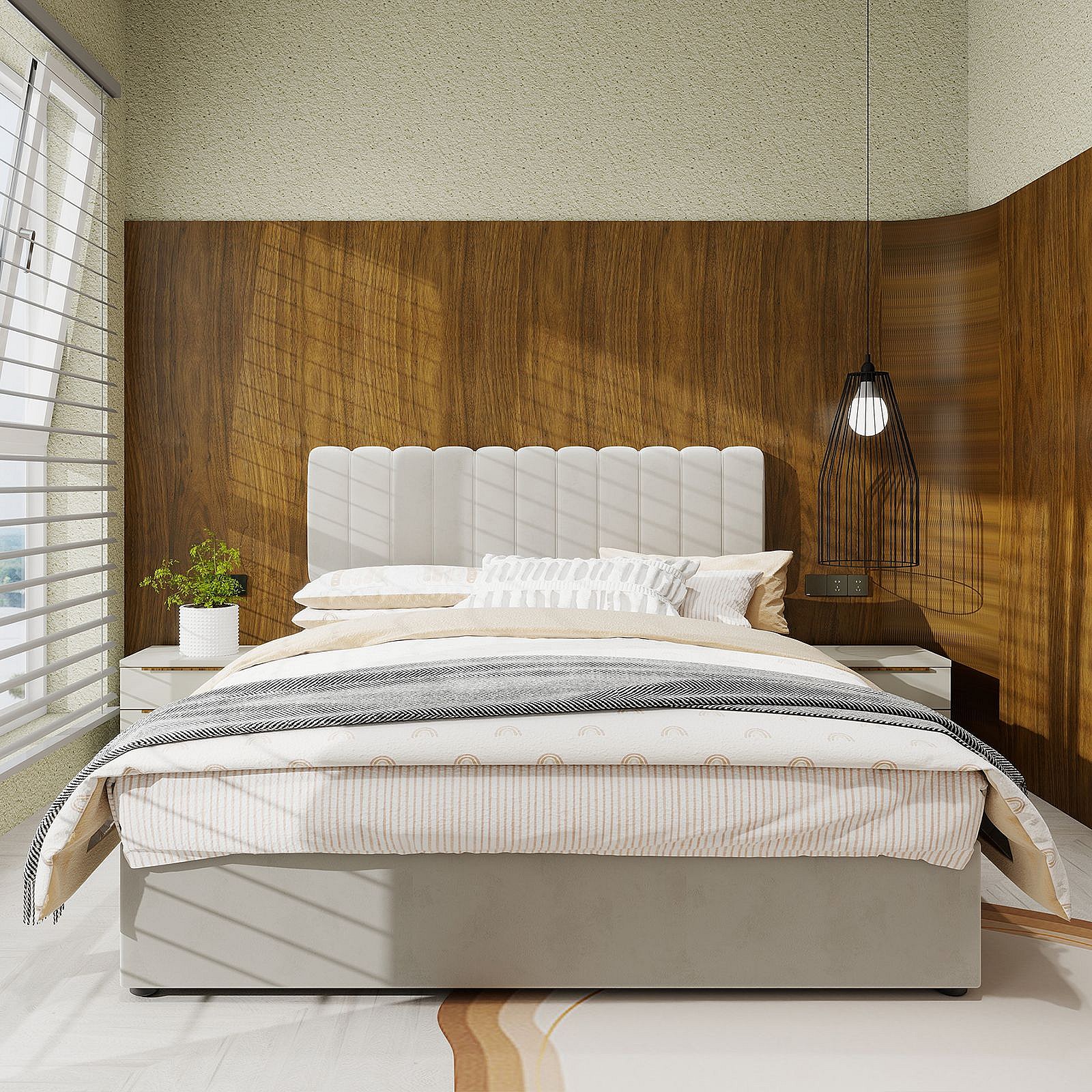 Volwassen bed 160 x 200 cm - Bed met zacht hoofdeinde en opbergruimte - beige fluweel - matras niet inbegrepen