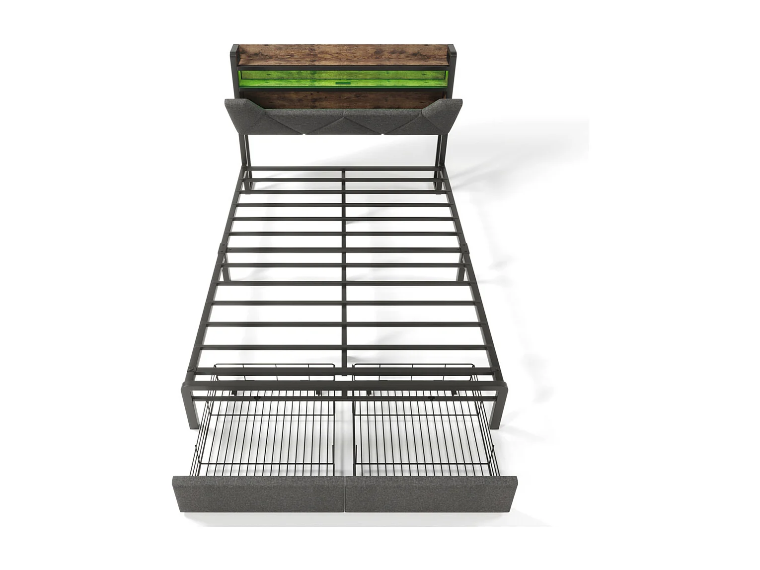 Volwassen bed 160x200 cm met metalen frame gestoffeerd bed met LED-verlichting en lades tweepersoonsbed grijs linnen