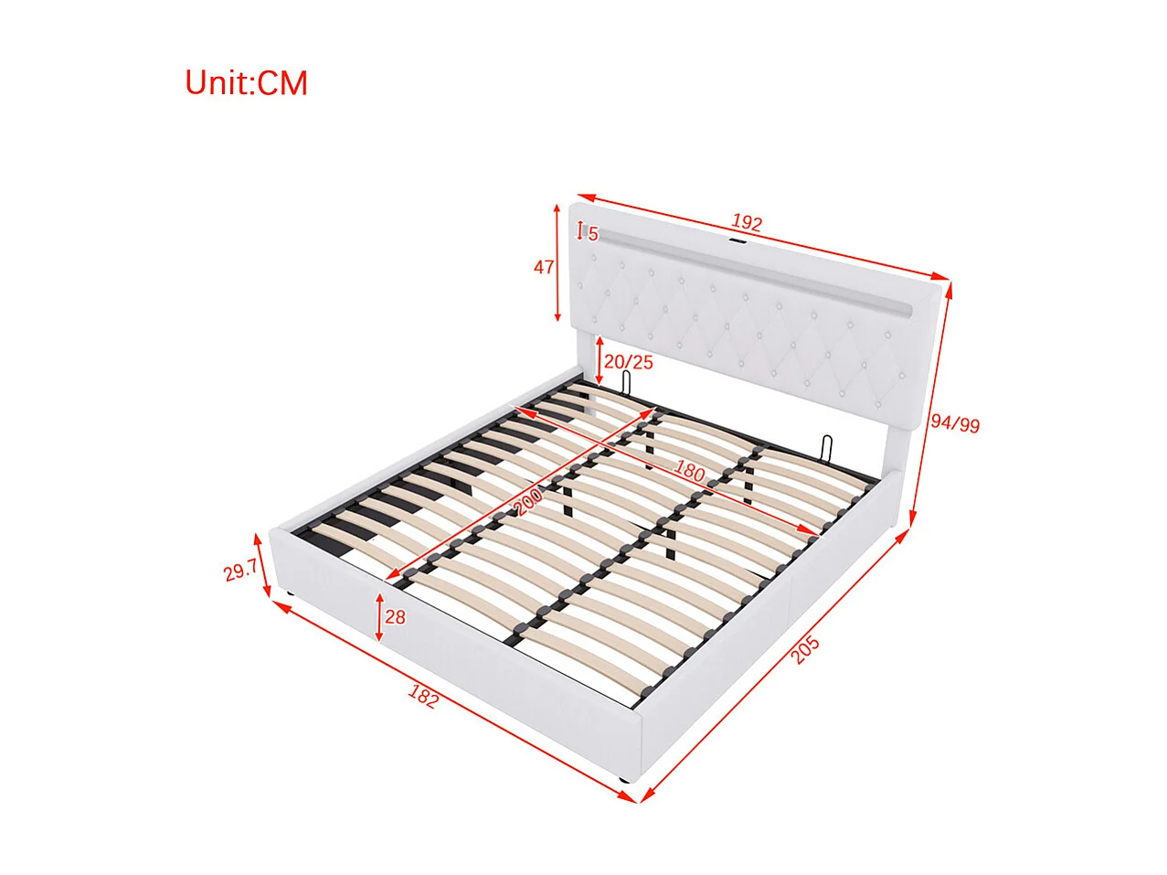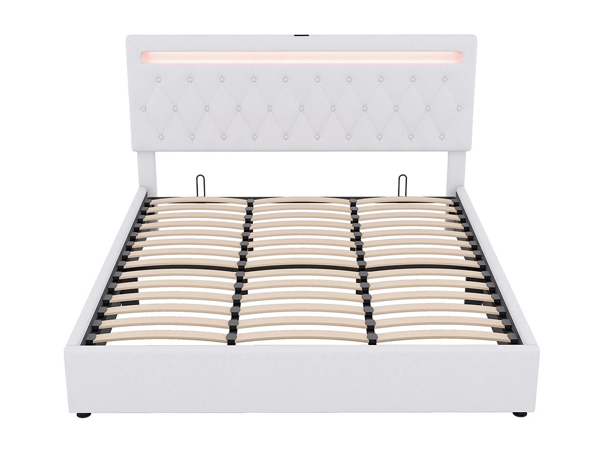 Vlak bed 180x200cm, met hydraulisch mechanisme, gekleurd sfeerlicht, USB, linnen stof, wit (205x192x99 cm)