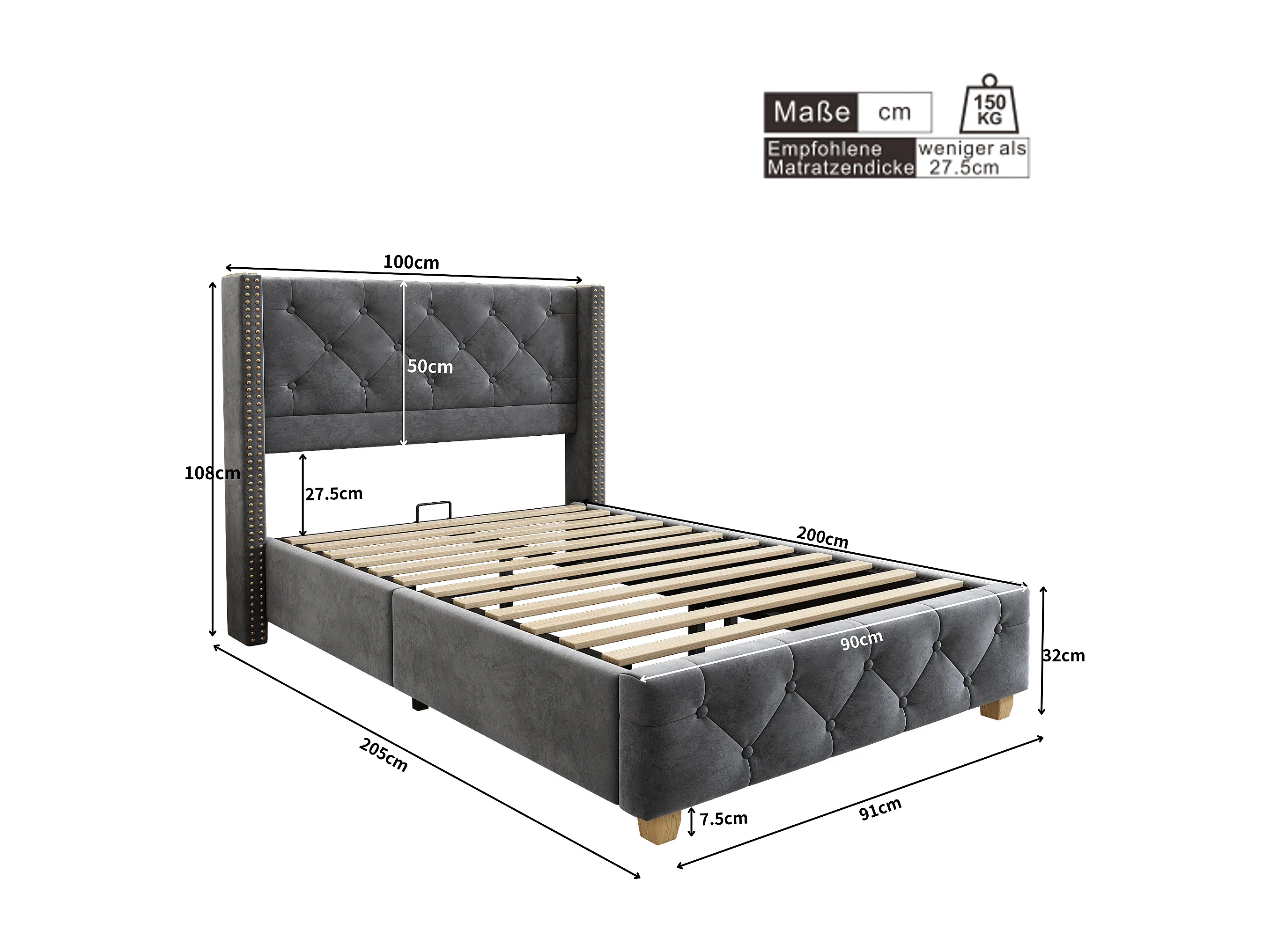 Volwassen bed 90x200 cm, grijs linnen, eenpersoonsbed met gestoffeerd hoofdbord en lattenbodem - zonder matras