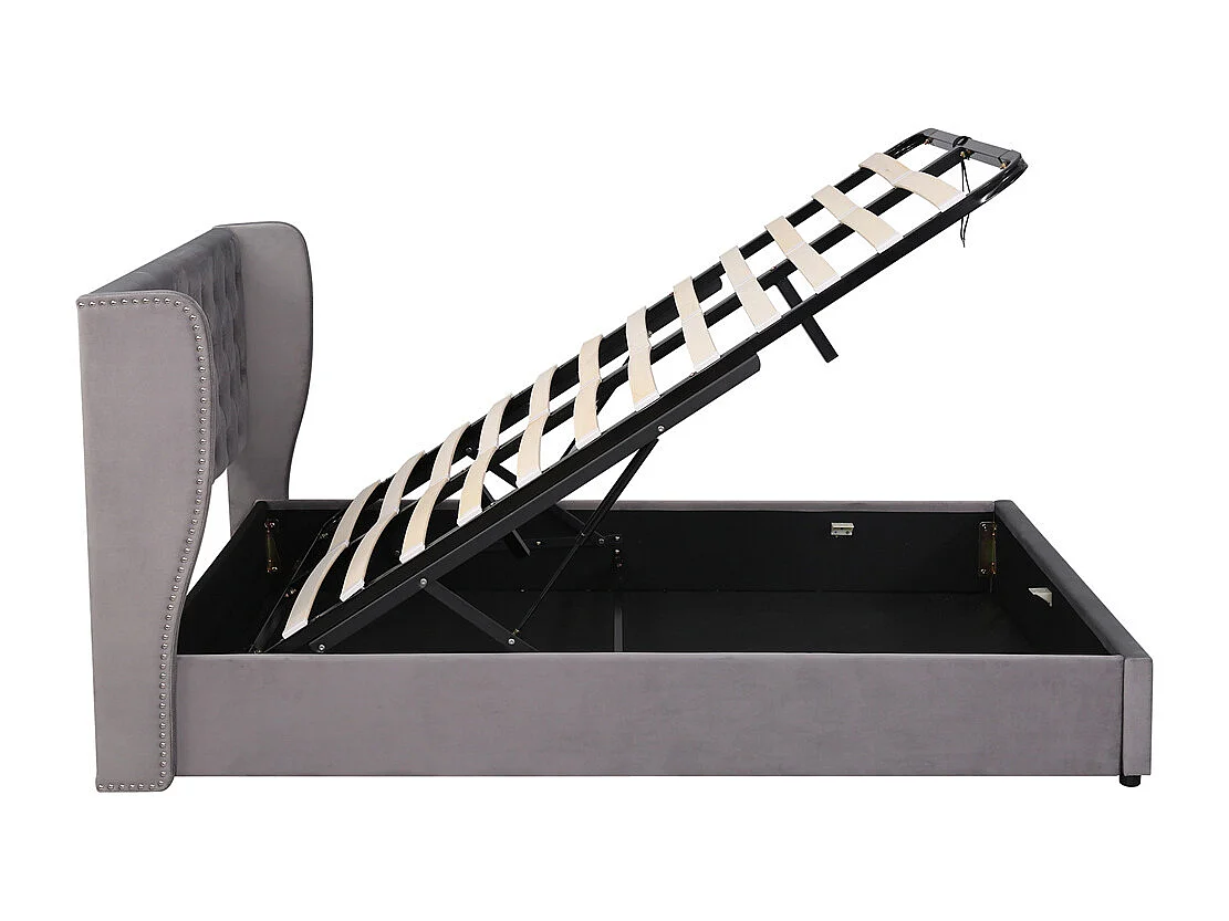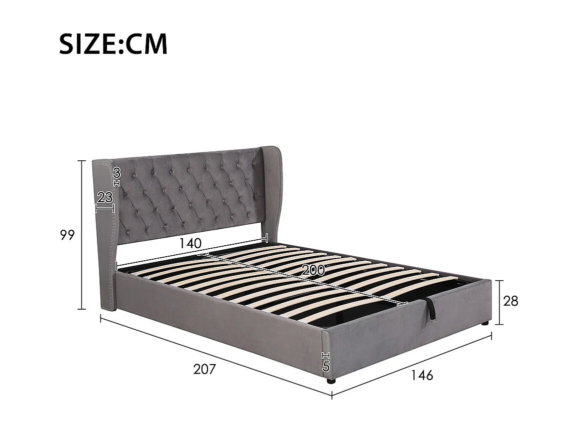 Fluwelen bed met vleugels, decoratieve knopen, hydraulisch met opbergruimte, 140x200 cm, grijs (207x146x99 cm)