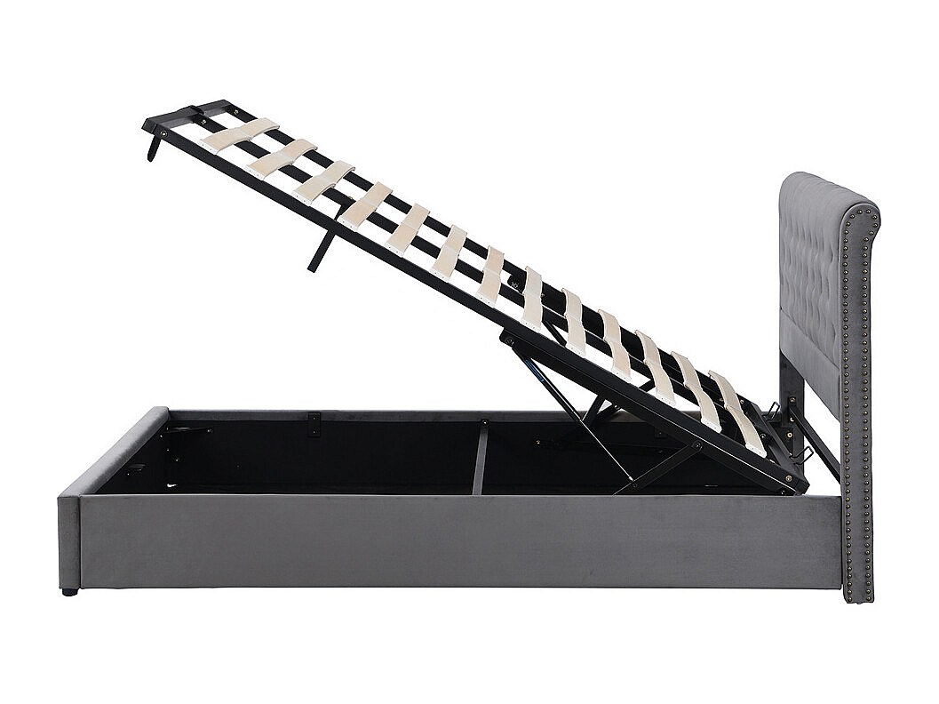 Gestoffeerd kussenvormig bed, fluweel, dubbele rij klinknagels, hydraulische functie met lattenbodem en opbergruimte, 140\190 cm, grijs