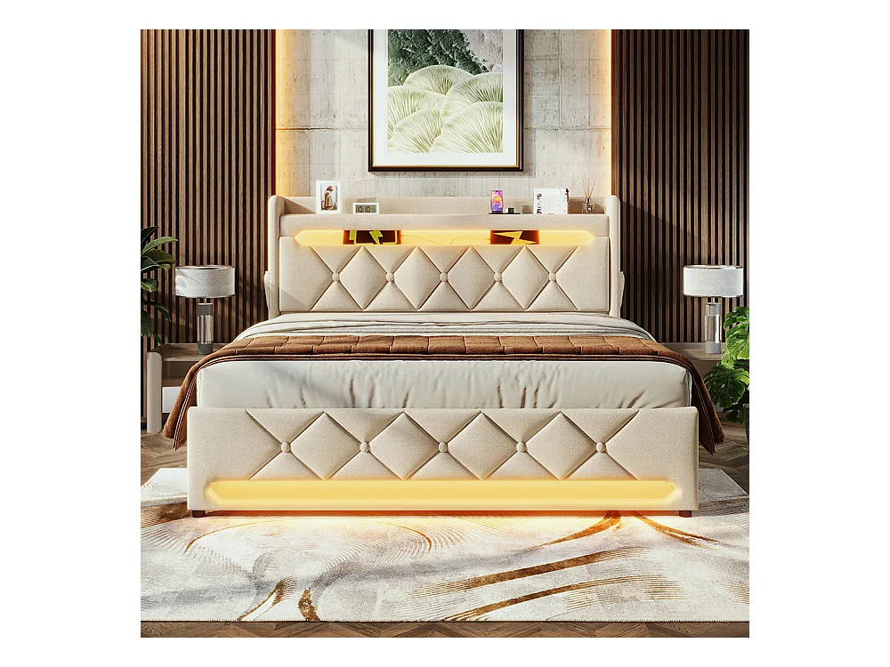 Bed met hydraulische opbergruimte, 180x200 cm, met LED, 2 lades, USB en Type-C, Fluweel, Beige (206,5x295x110 cm)