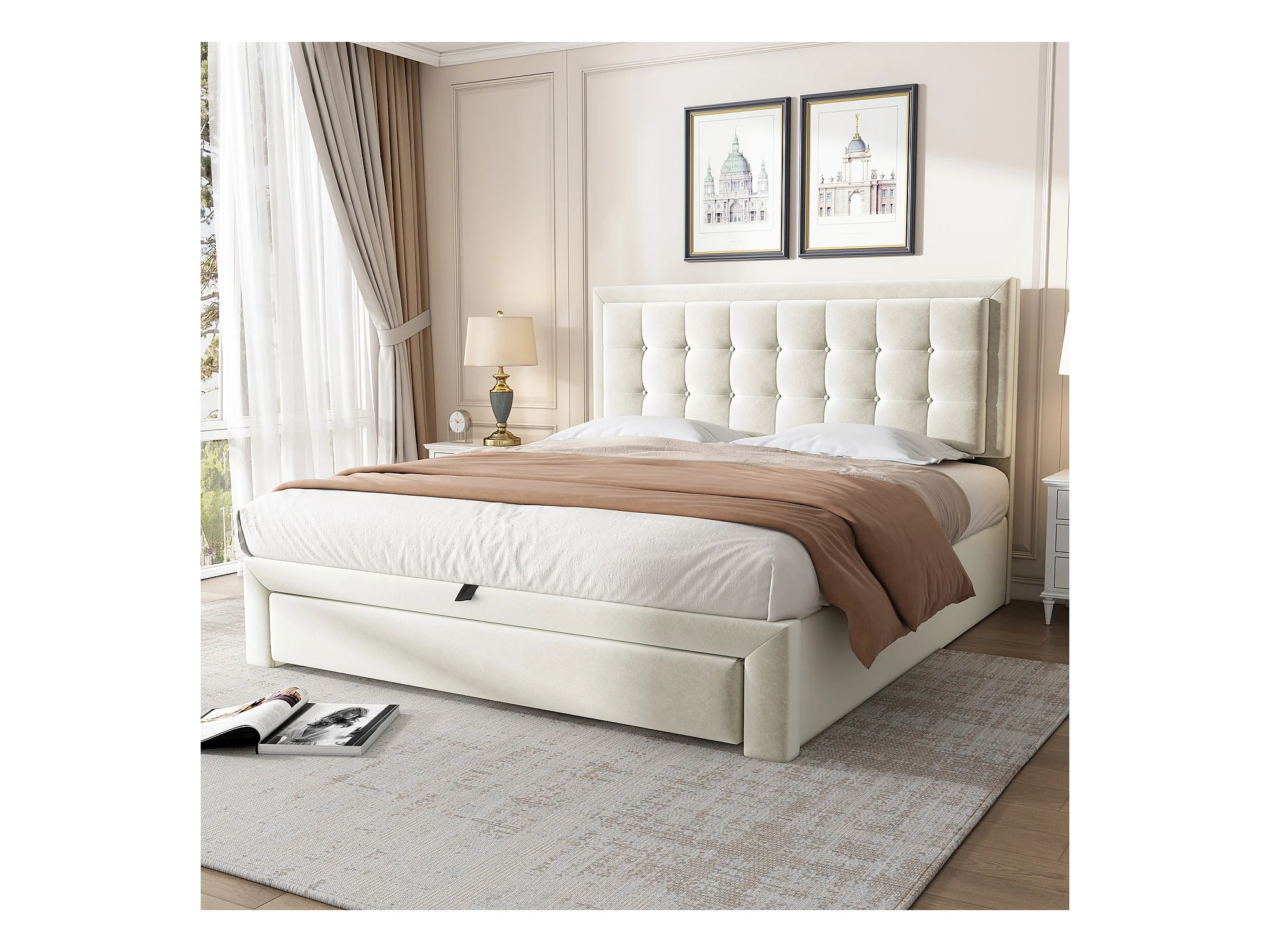 Volwassen opbergbed 140x190 cm met onderstel - 2 lades en in hoogte verstelbaar hoofdeinde - beige fluweel (zonder matras)