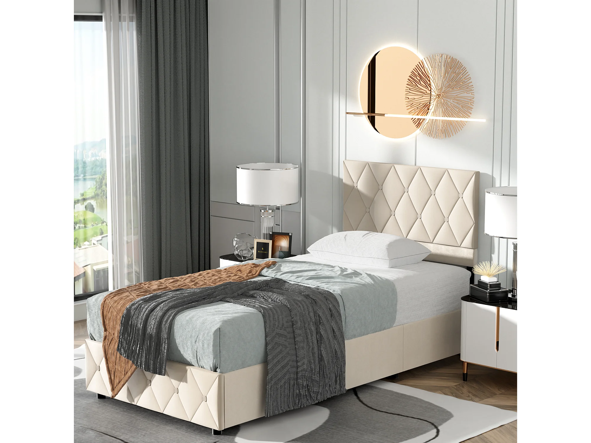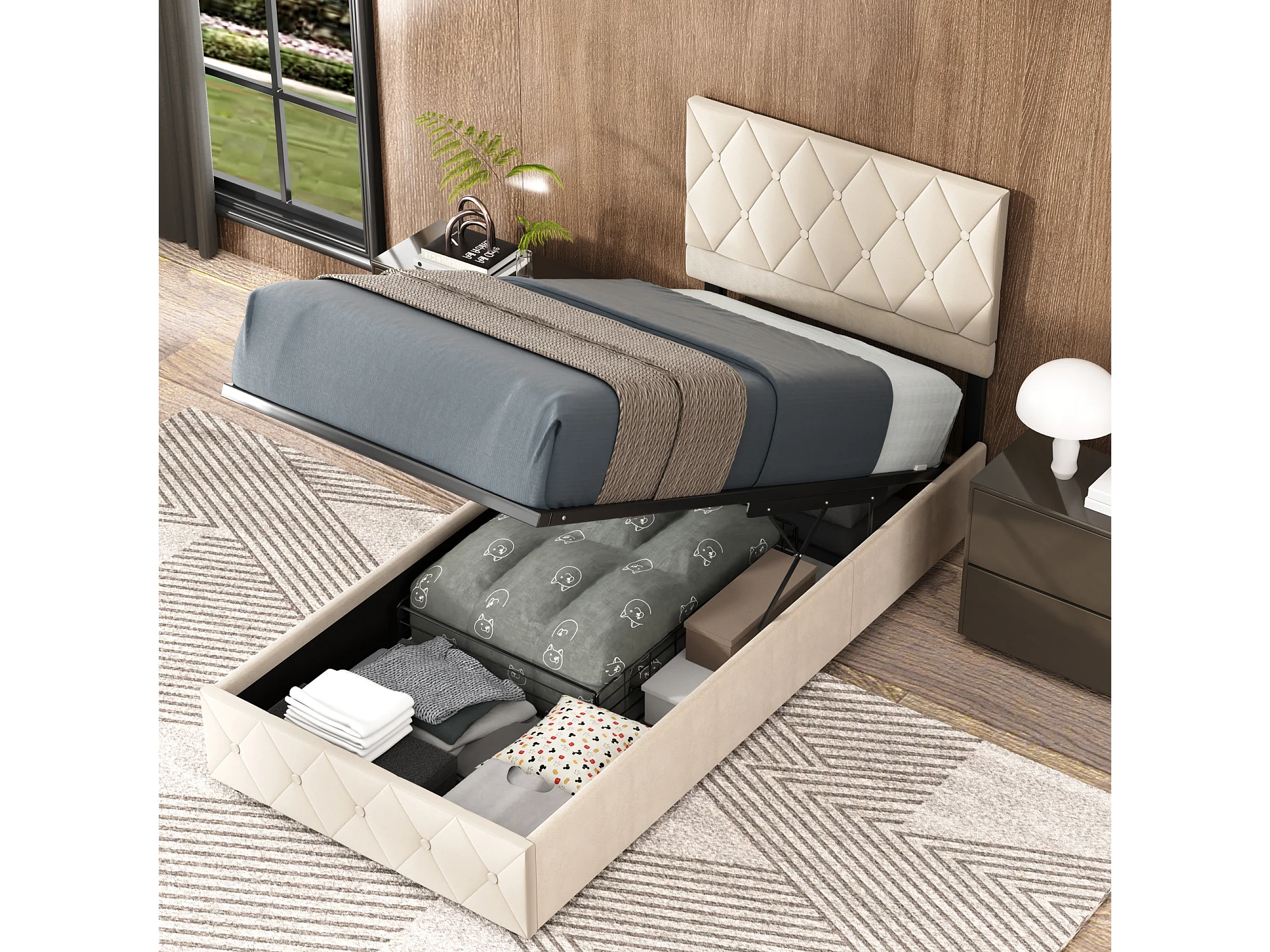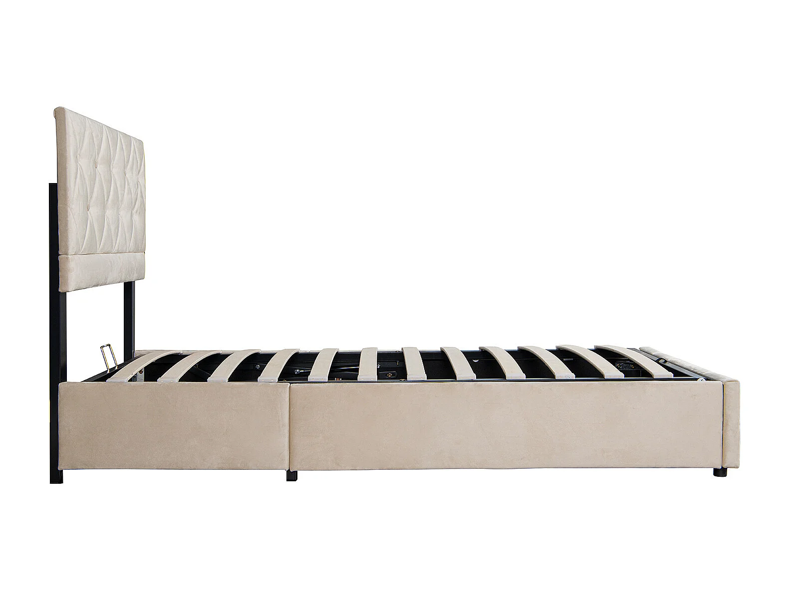 Volwassen opbergbed 90x200 cm, elegant en modern, verstelbaar hoofdeinde en lattenbodem, beige fluweel, matras niet inbegrepen