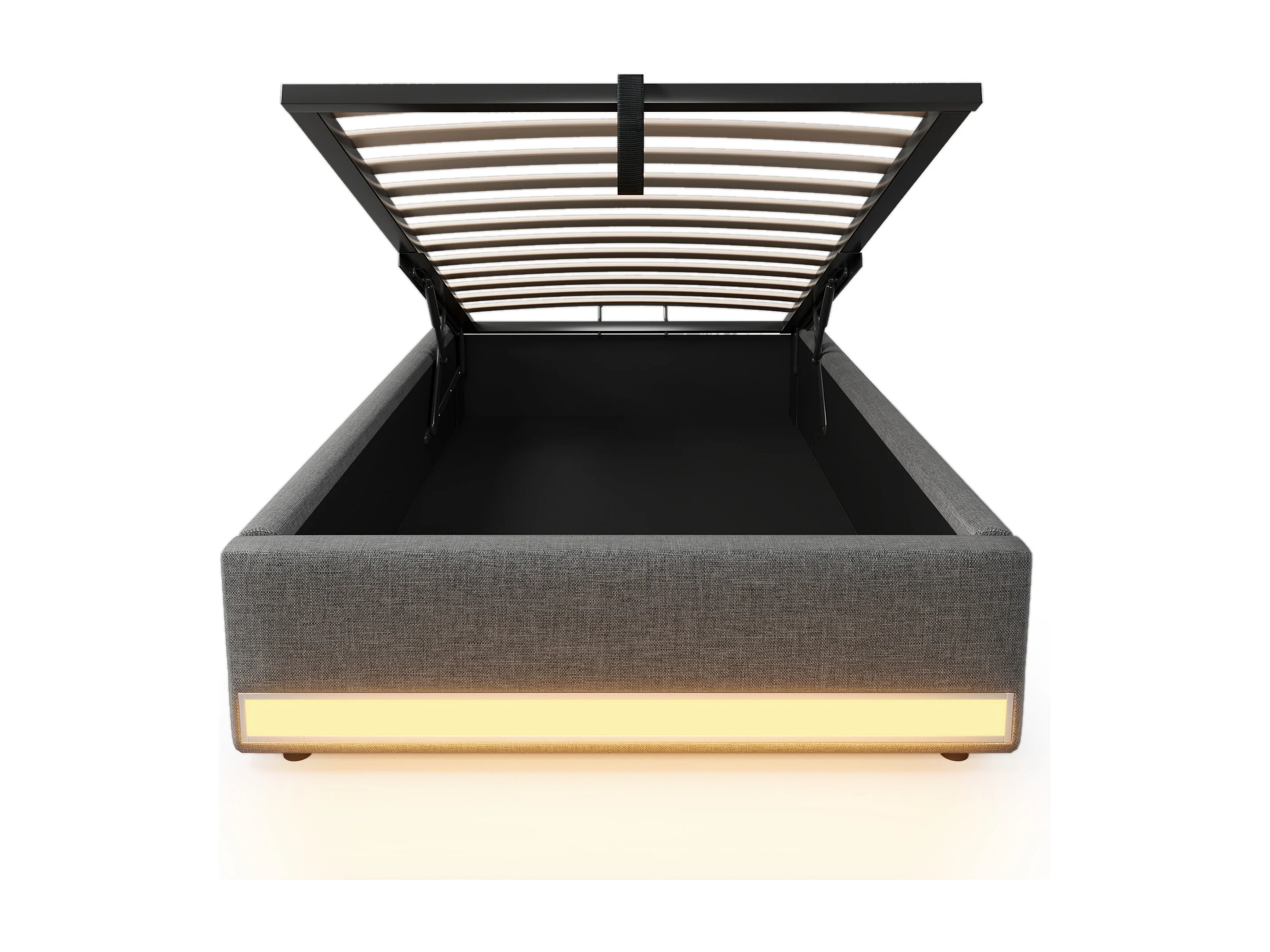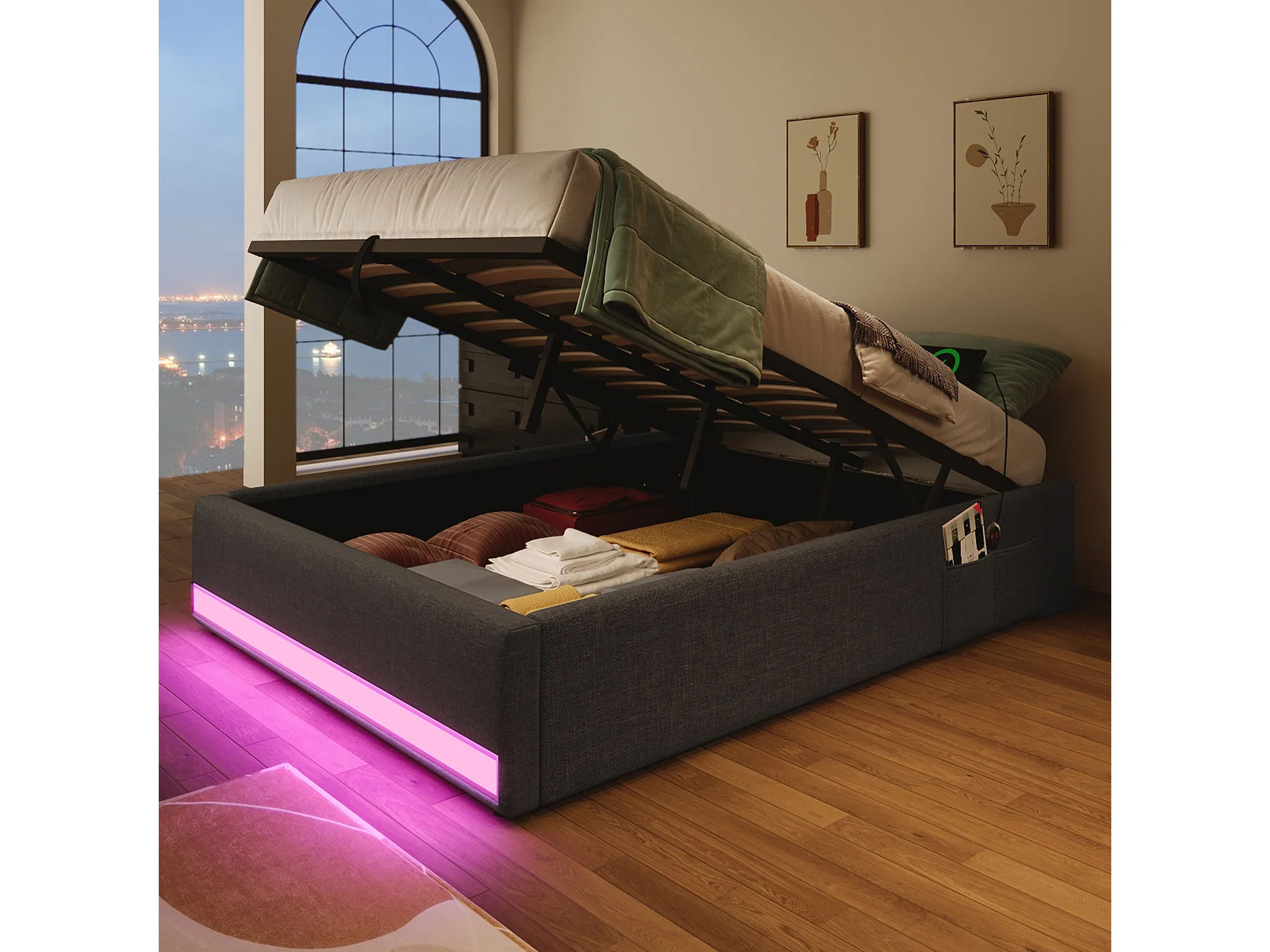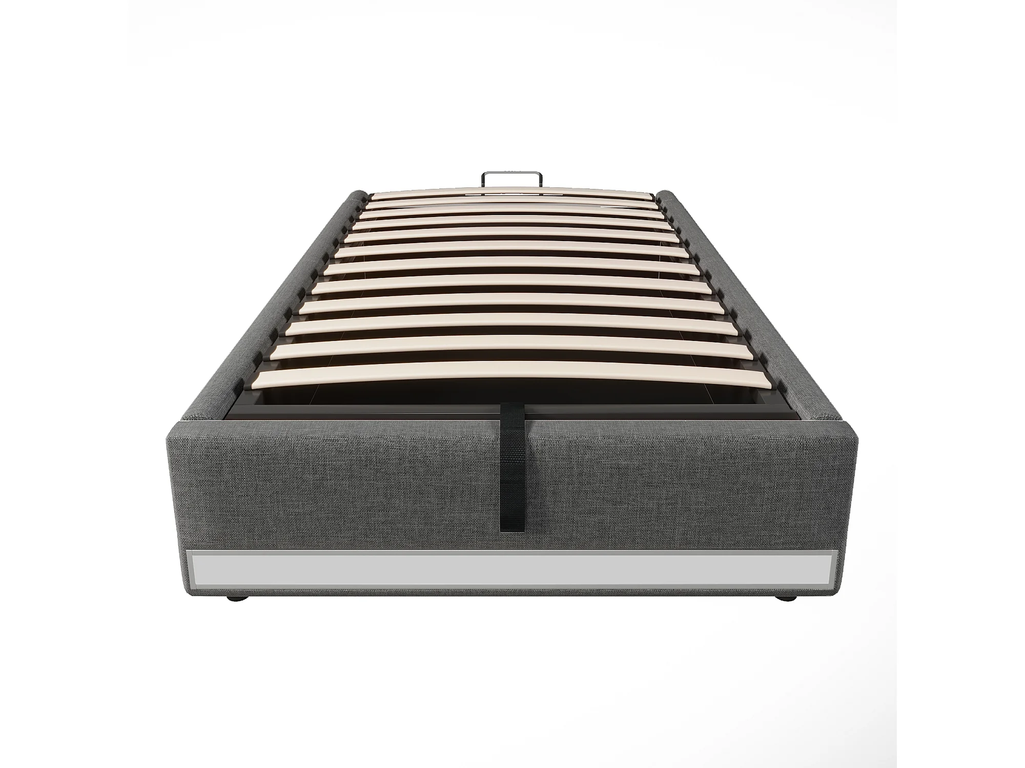 Volwassen opbergbed 90x200cm in grijs linnen, zonder hoofdeinde, LED en USB inbegrepen, zonder matras