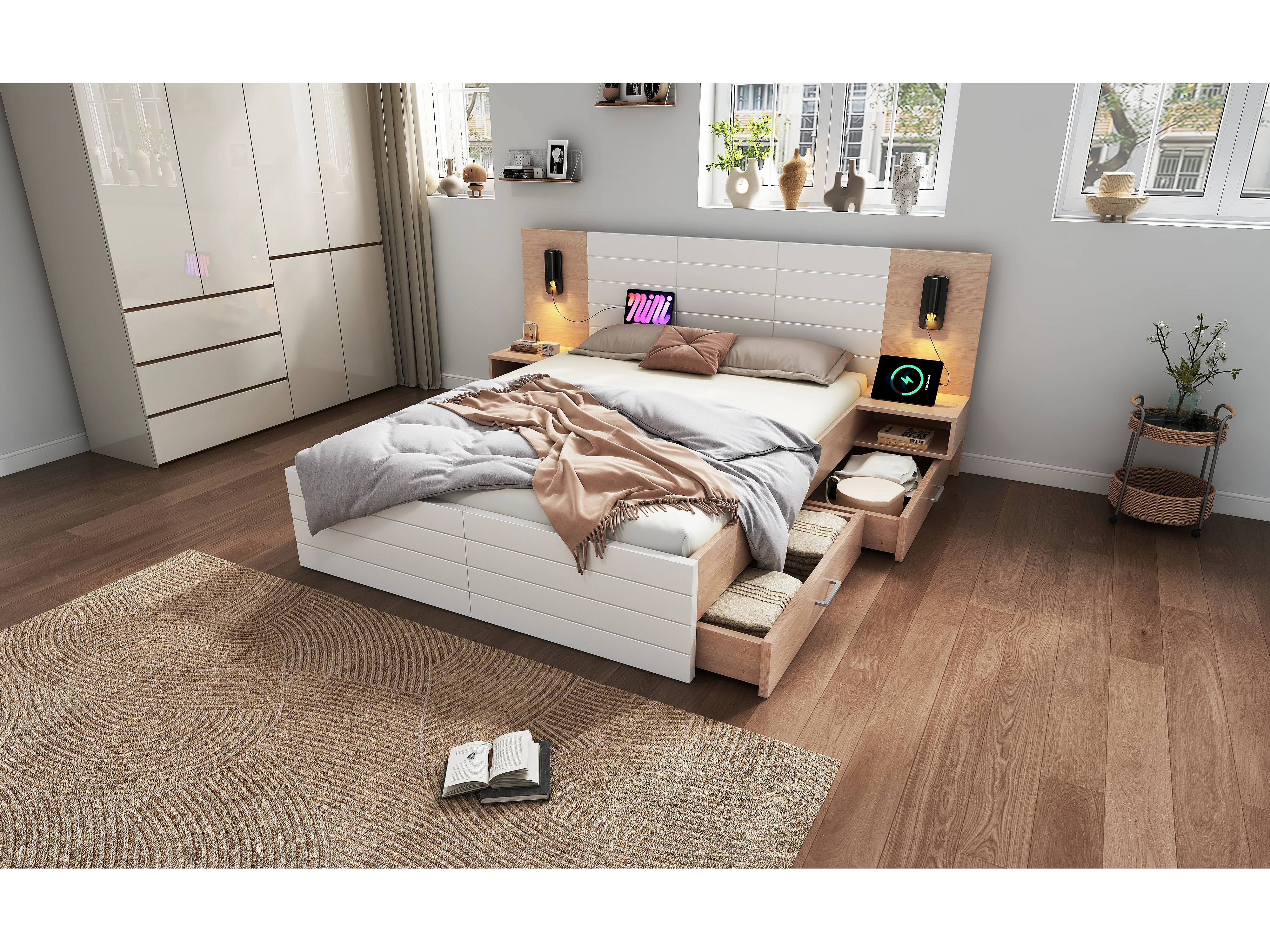 Volwassen tweepersoonsbed 160×200cm met 2 lades, leeslamp, USB-aansluiting en 2 nachtkastjes - Kleur hout en wit