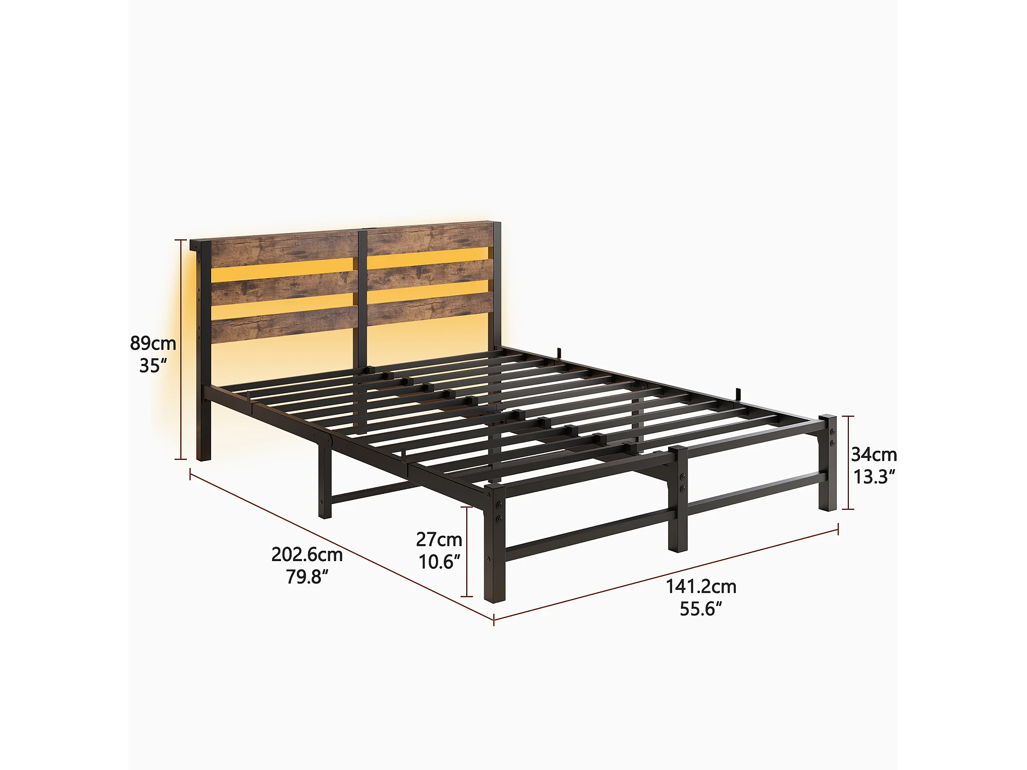 Volwassenenbed 140x190 cm - met LED-verlichting en hoofdbord met opbergruimte - metaal en hout - zwart en bruin - matras niet inbegrepen