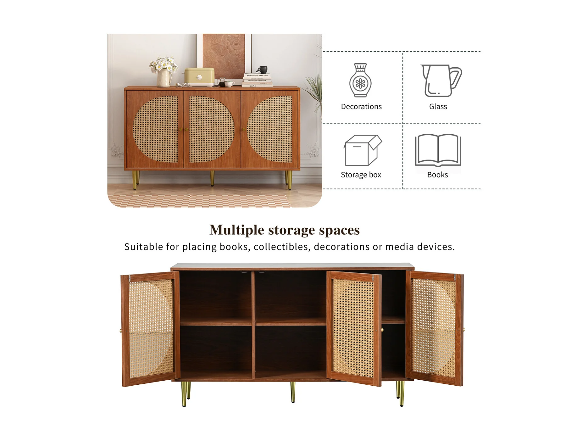 Walnotenhouten dressoir met 3 rotandeuren en metalen handgrepen, 129,8 x 40 x 76 cm