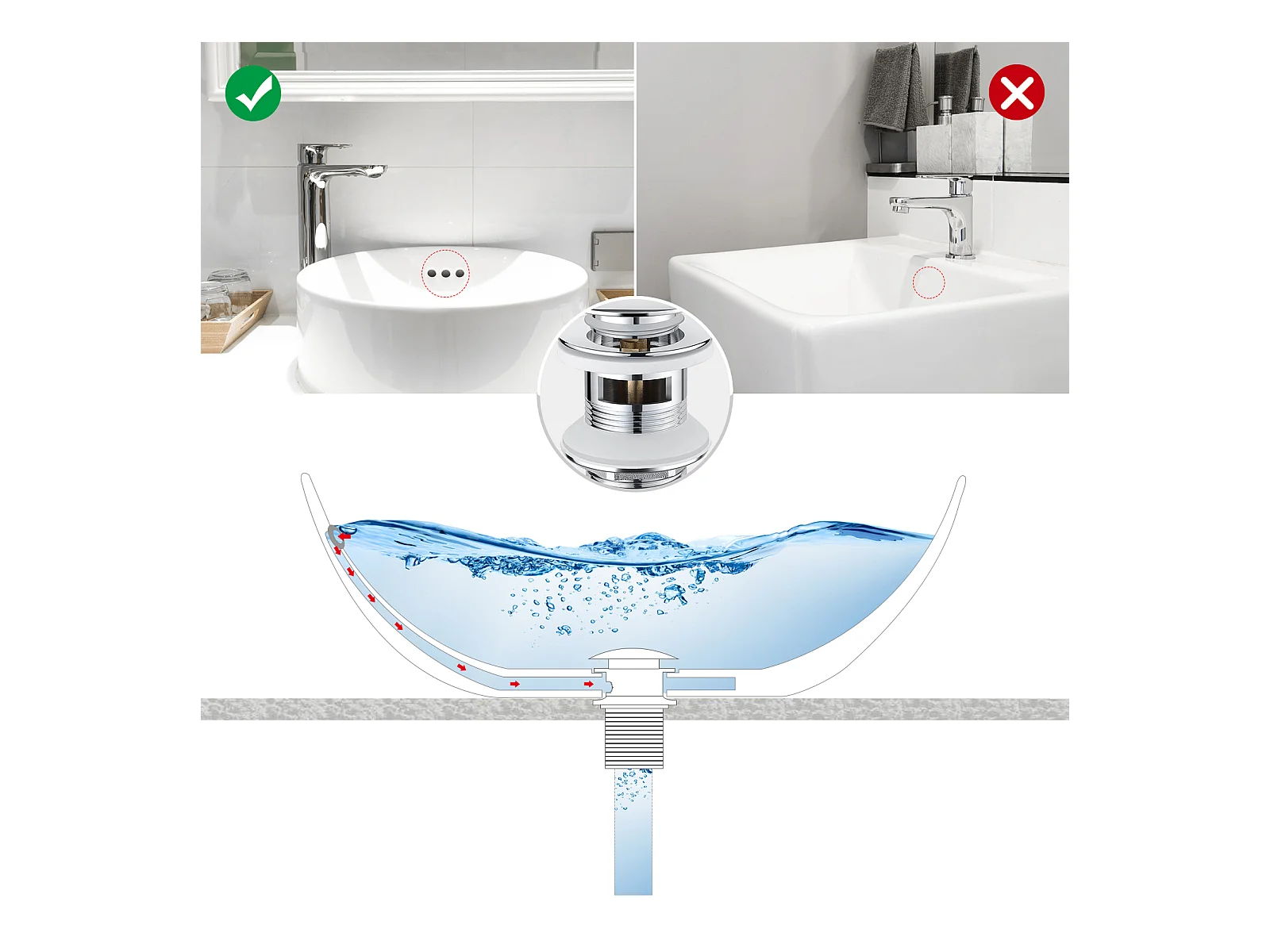 Auralum max Universele Wastafelkraan met Overloop, Pop-Up Wastafelkraan- Messing Afvoerbak (Chroom, met Zeefmand)