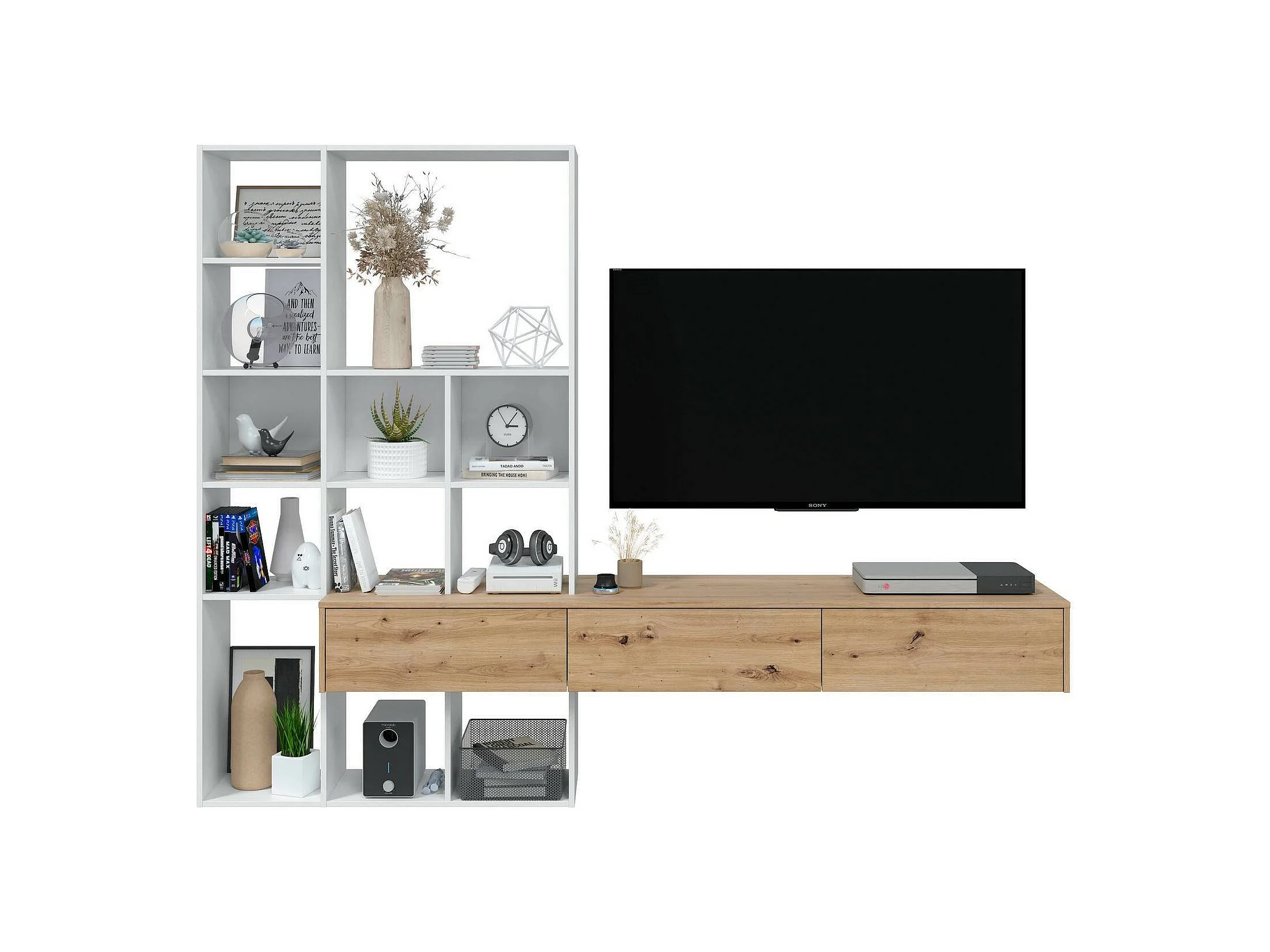 Dmora Wandmeubel Wausau 28x226x173h cm Wit, 3 Laden, 10 Planken, Schuifdeur