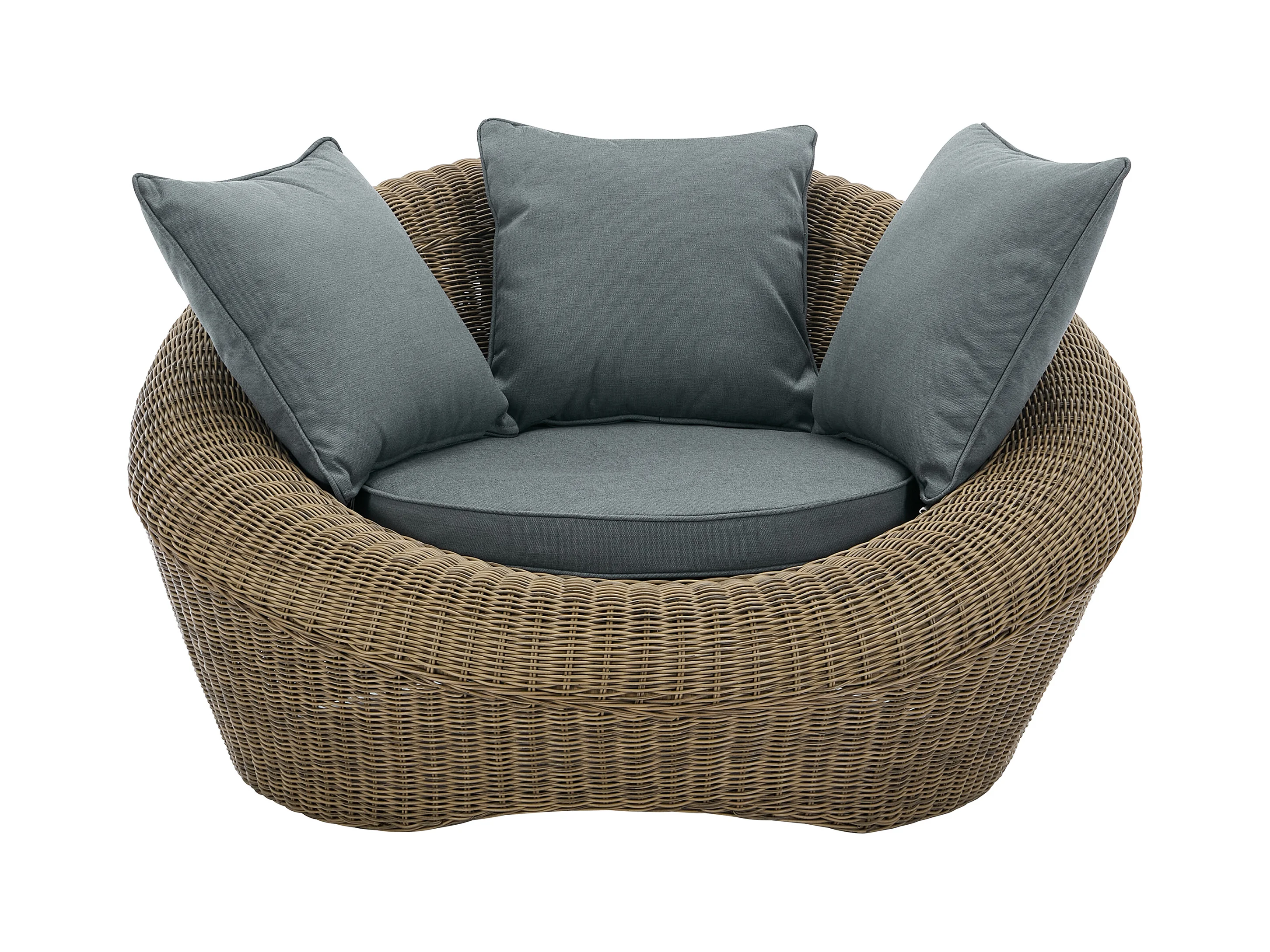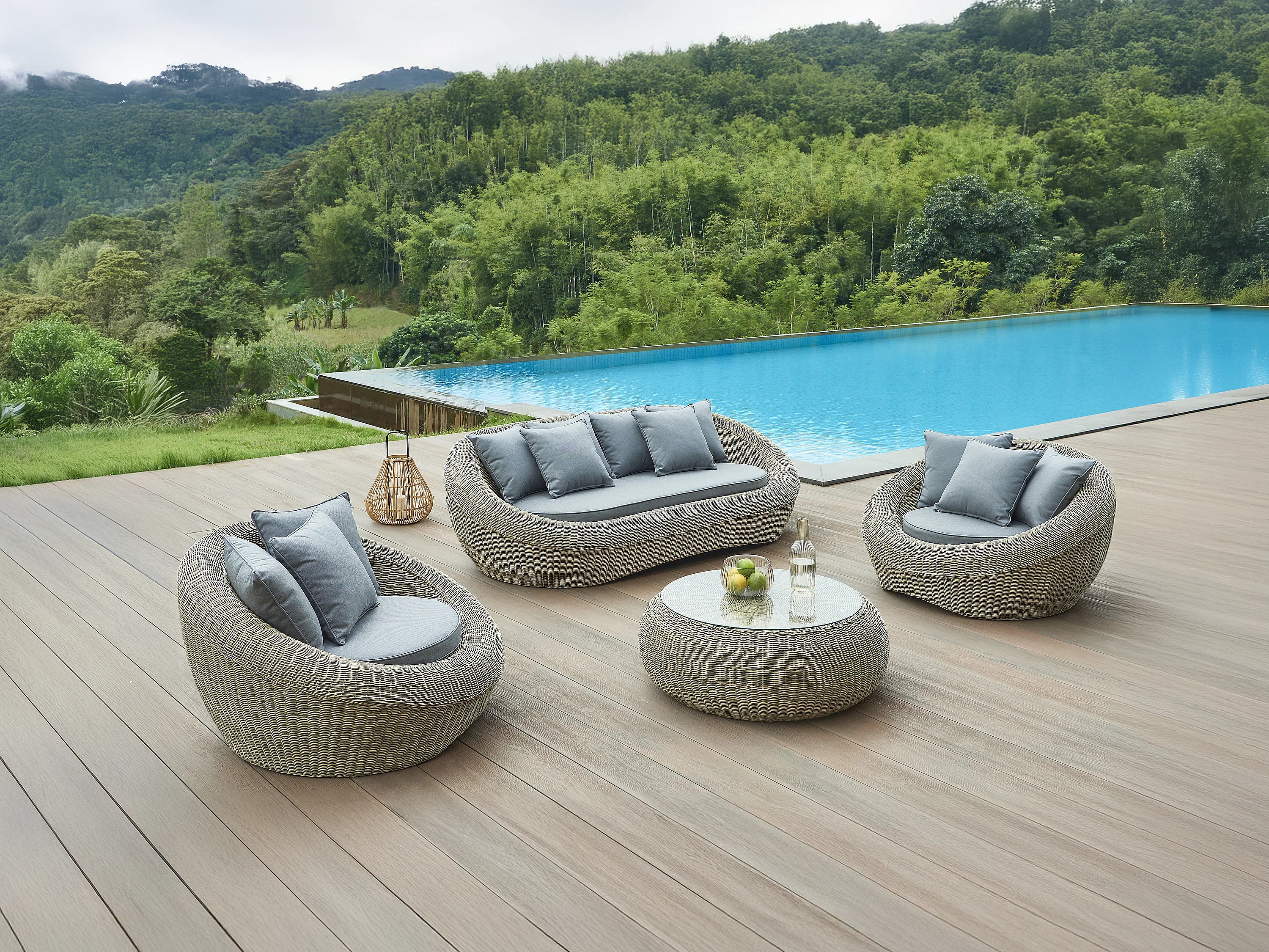 Tuinsalon van donker naturelkleurig gevlochten hars: 1 zitbank, 2 fauteuils en 1 salontafel - WHITEHEAVEN van MYLIA