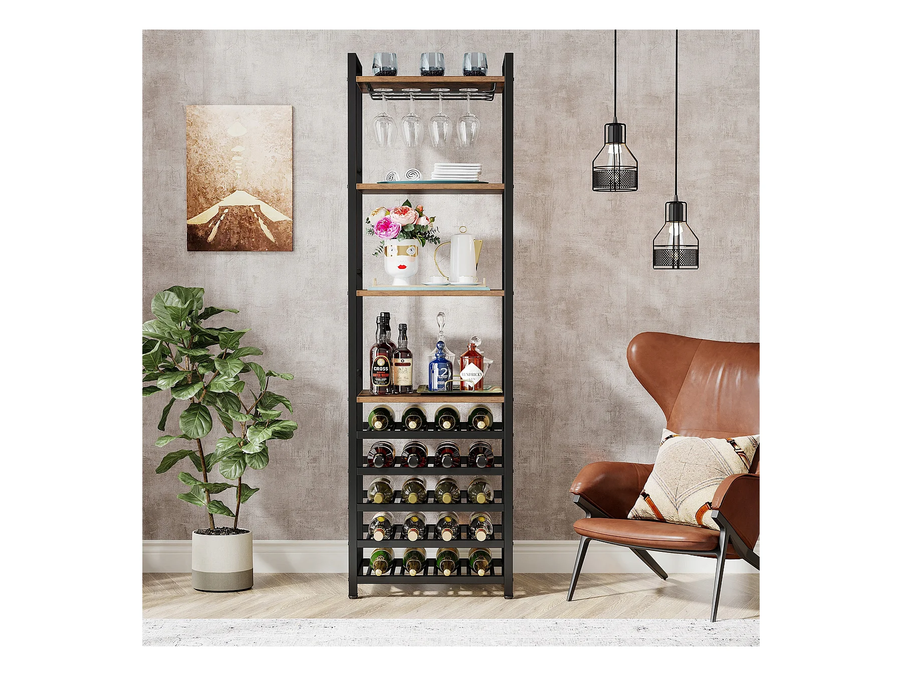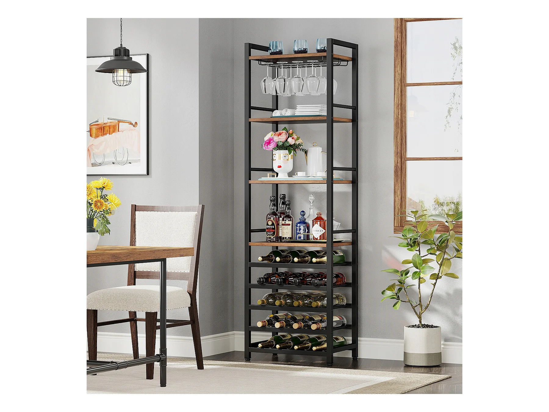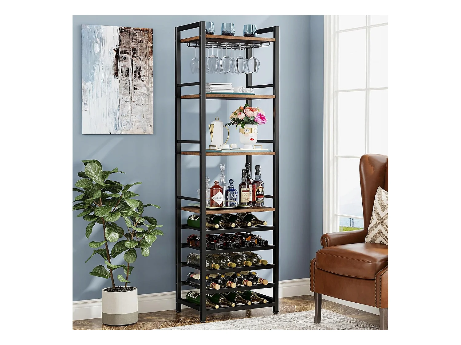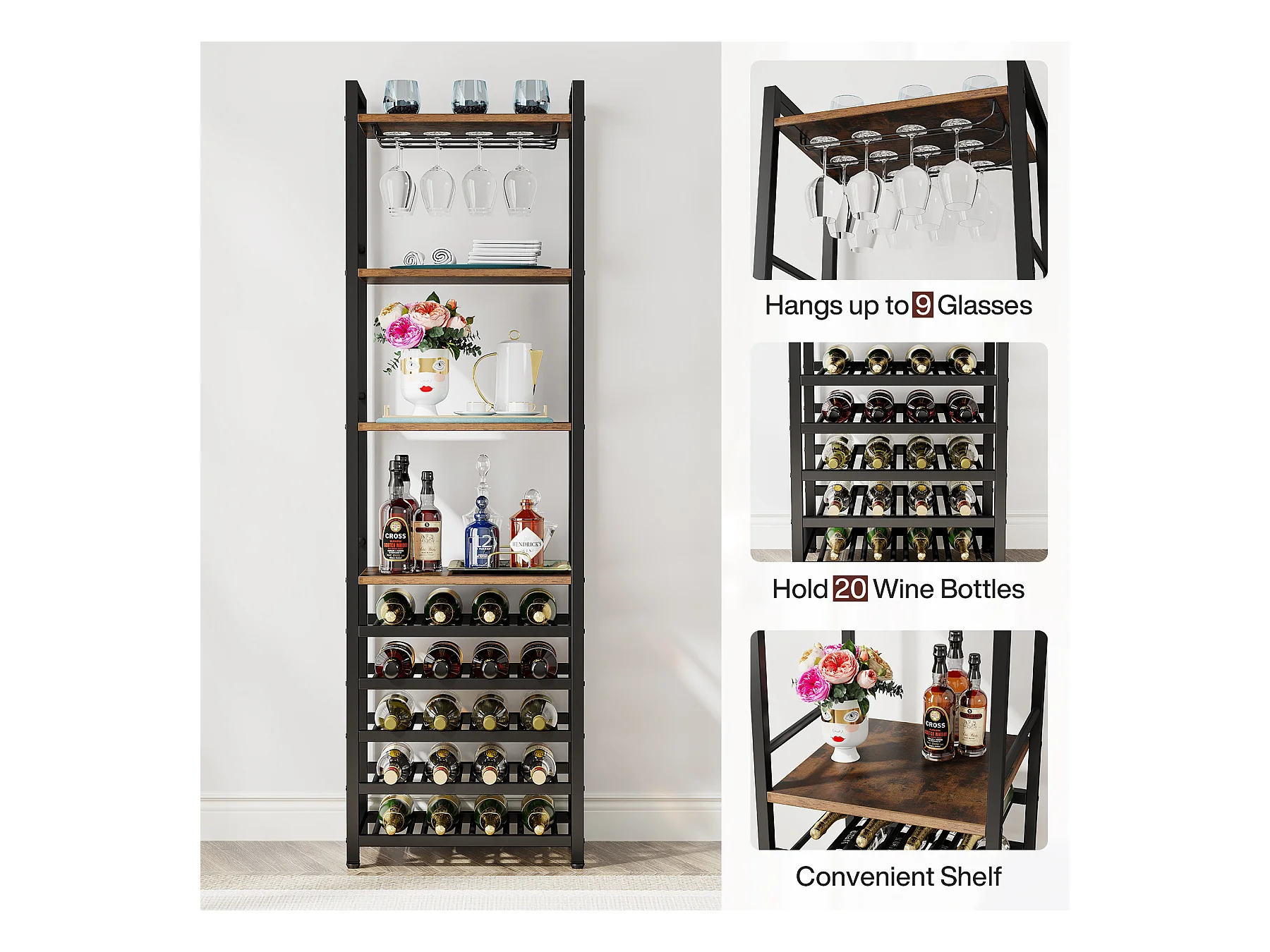 Wijnrek, vrijstaand flessenrek met 9 niveaus, glazenhouder en opbergplanken, wijnflessenrek, rustiek bruin