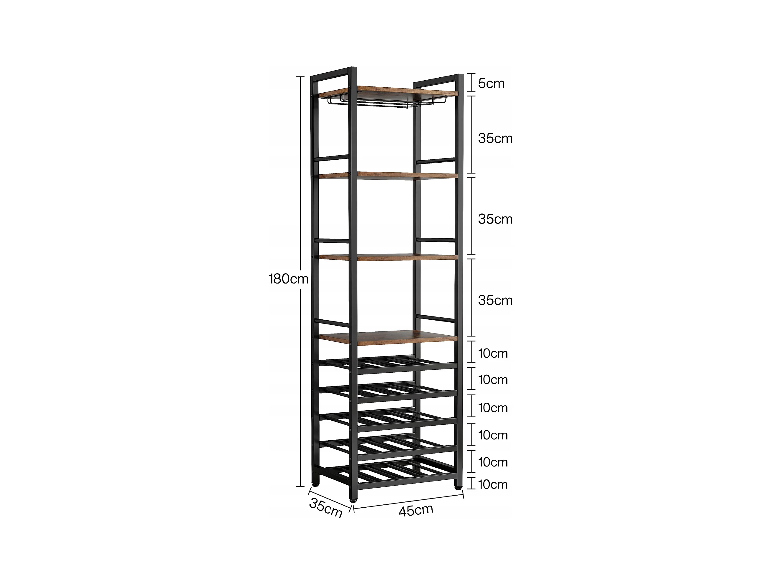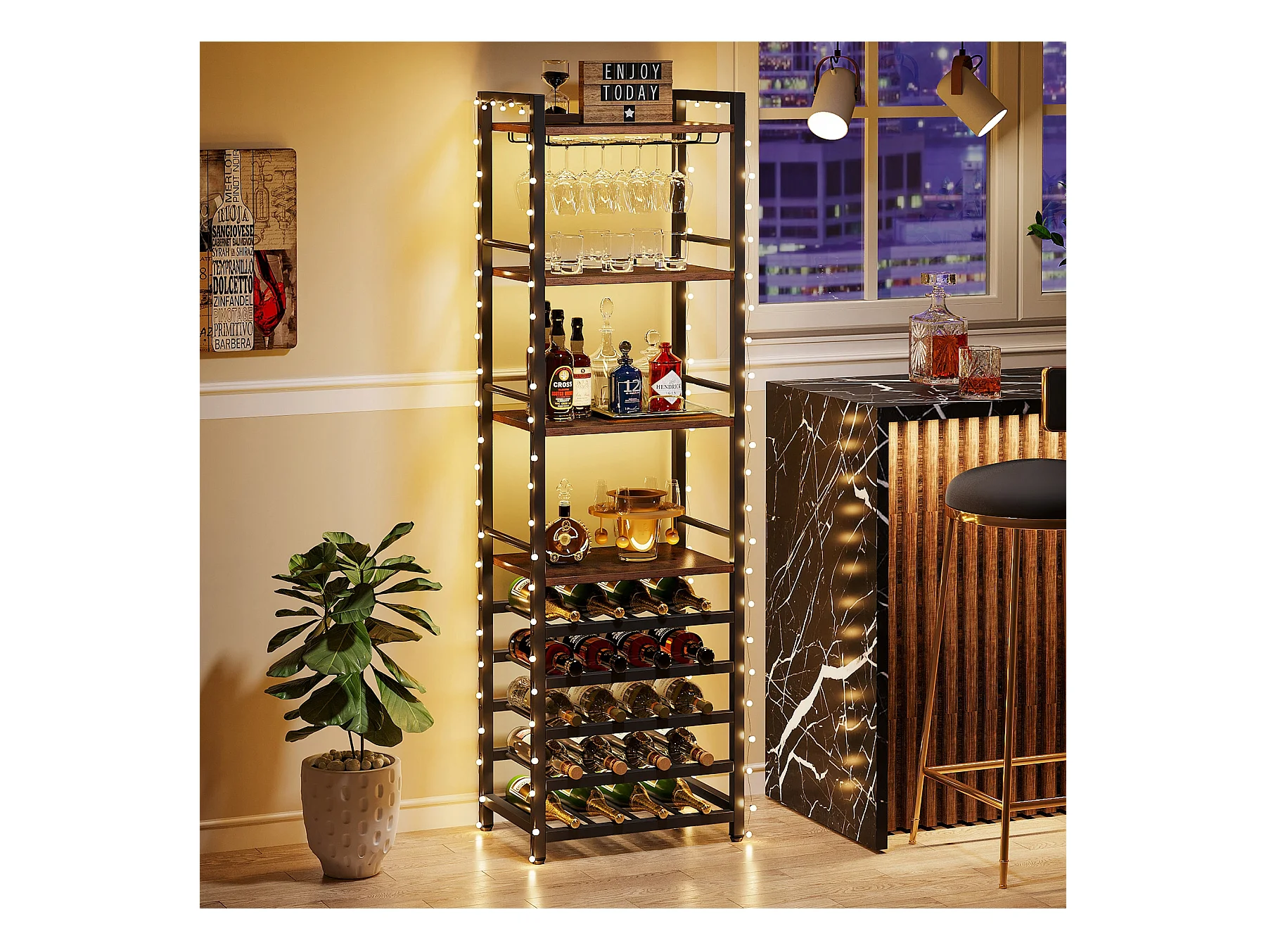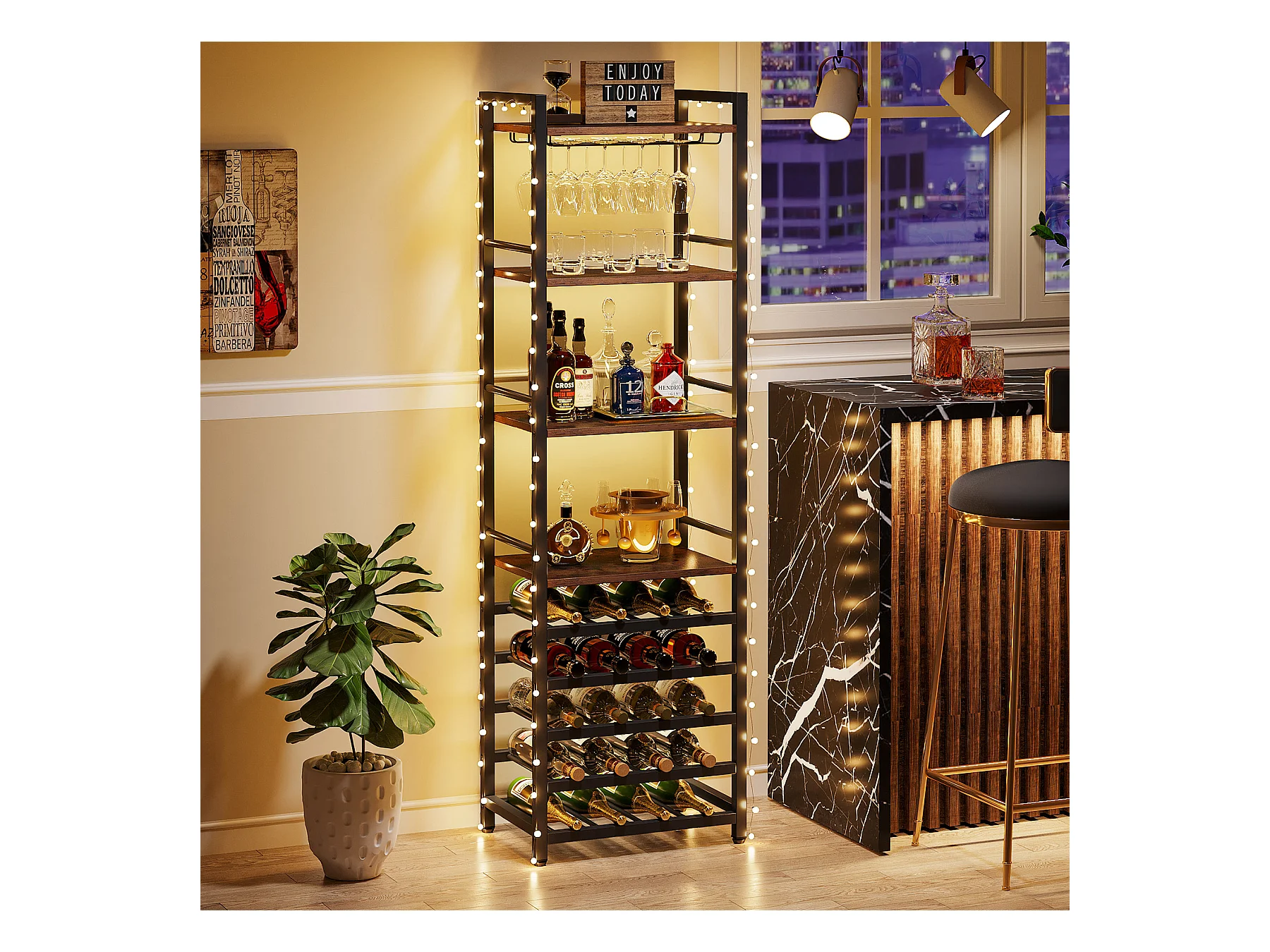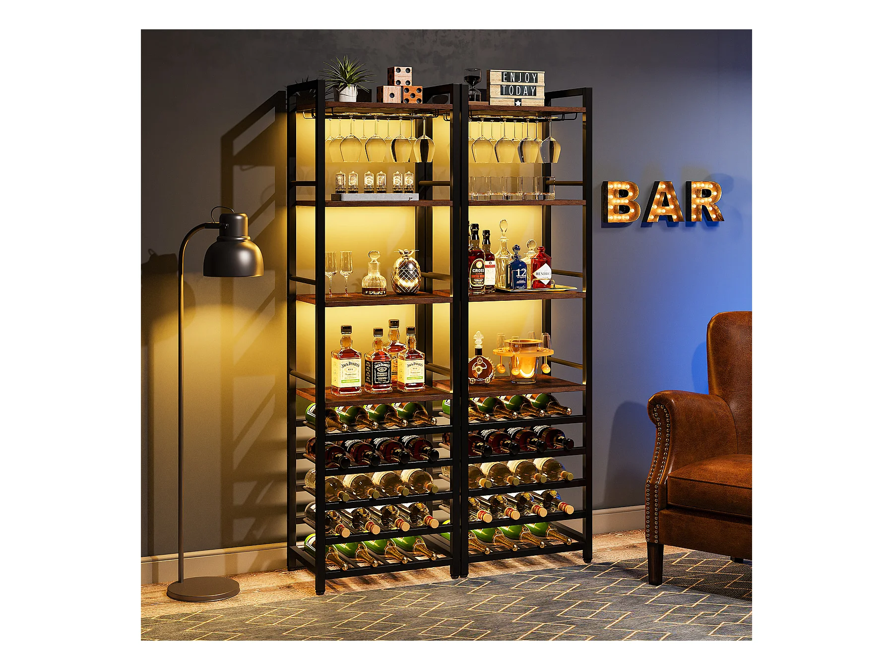 Wijnrek, vrijstaand flessenrek met 9 niveaus, glazenhouder en opbergplanken, wijnflessenrek, rustiek bruin