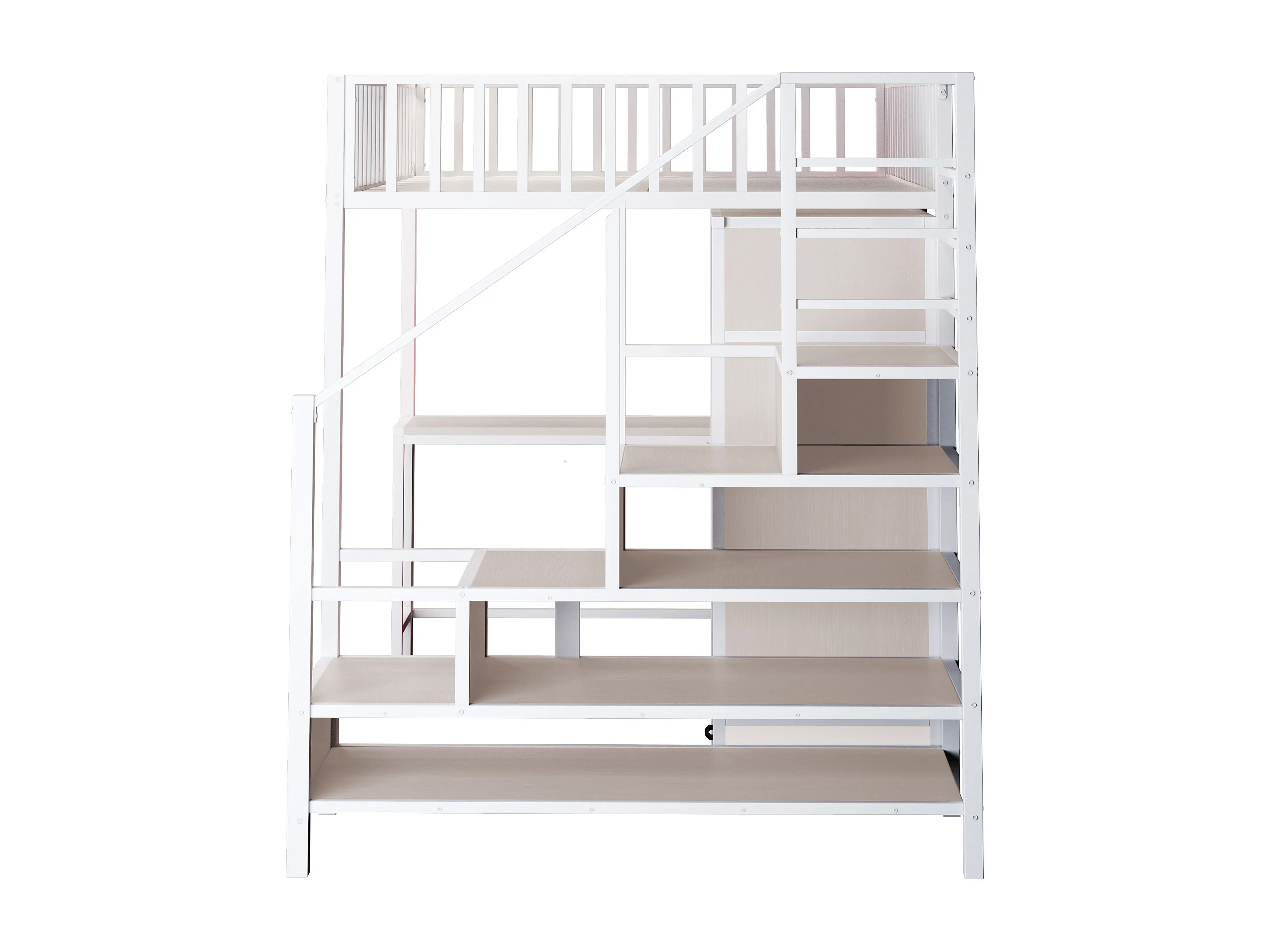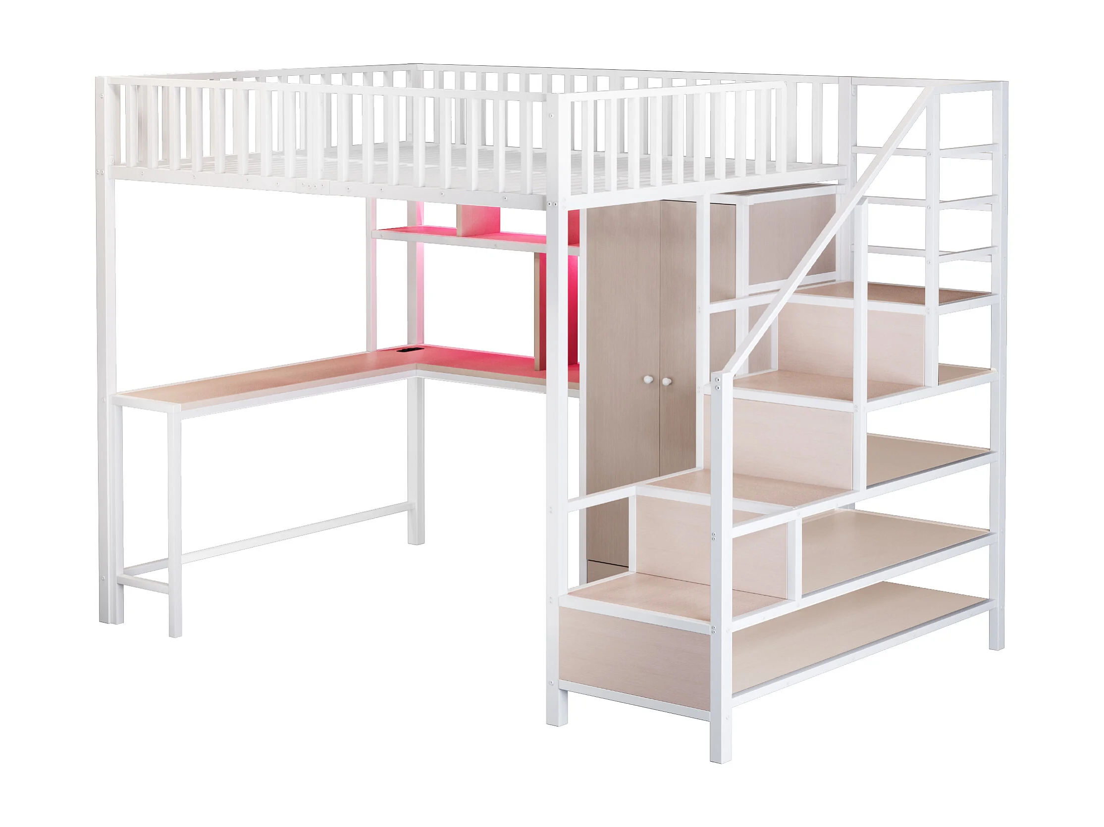 Wit hoogslaper 140 x 200 cm met bureau, plank en kledingkast - Metalen en MDF-bed met oplaadpunt en LED-verlichting