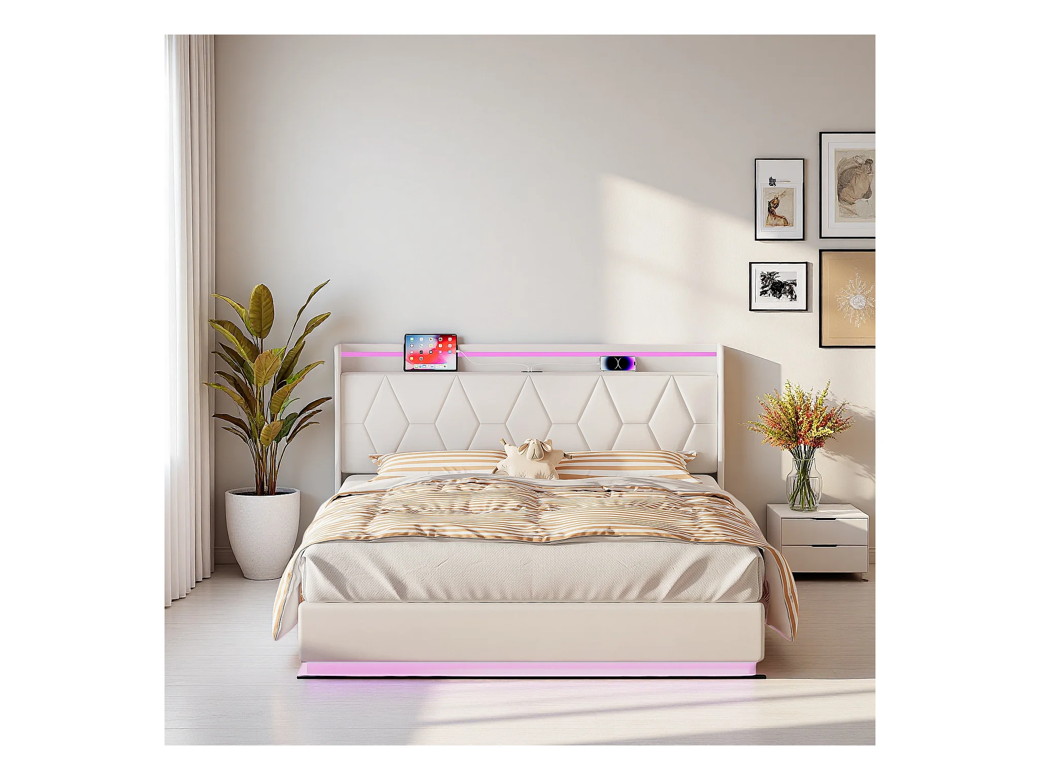 Wit tweepersoonsbed 140x200 cm in fluweel, gestoffeerd hoofdbord met LED, oplaadpoorten, lichtstrips aan 3 zijden
