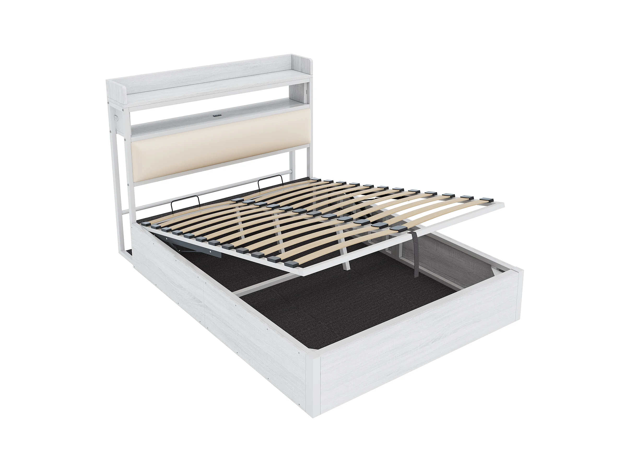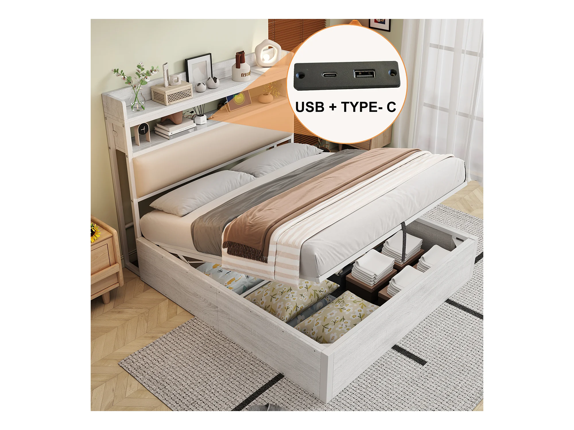 Wit tweepersoonsbed met opbergruimte 140x200cm met PU hoofdbord en USB-aansluiting, MDF (zonder matras)