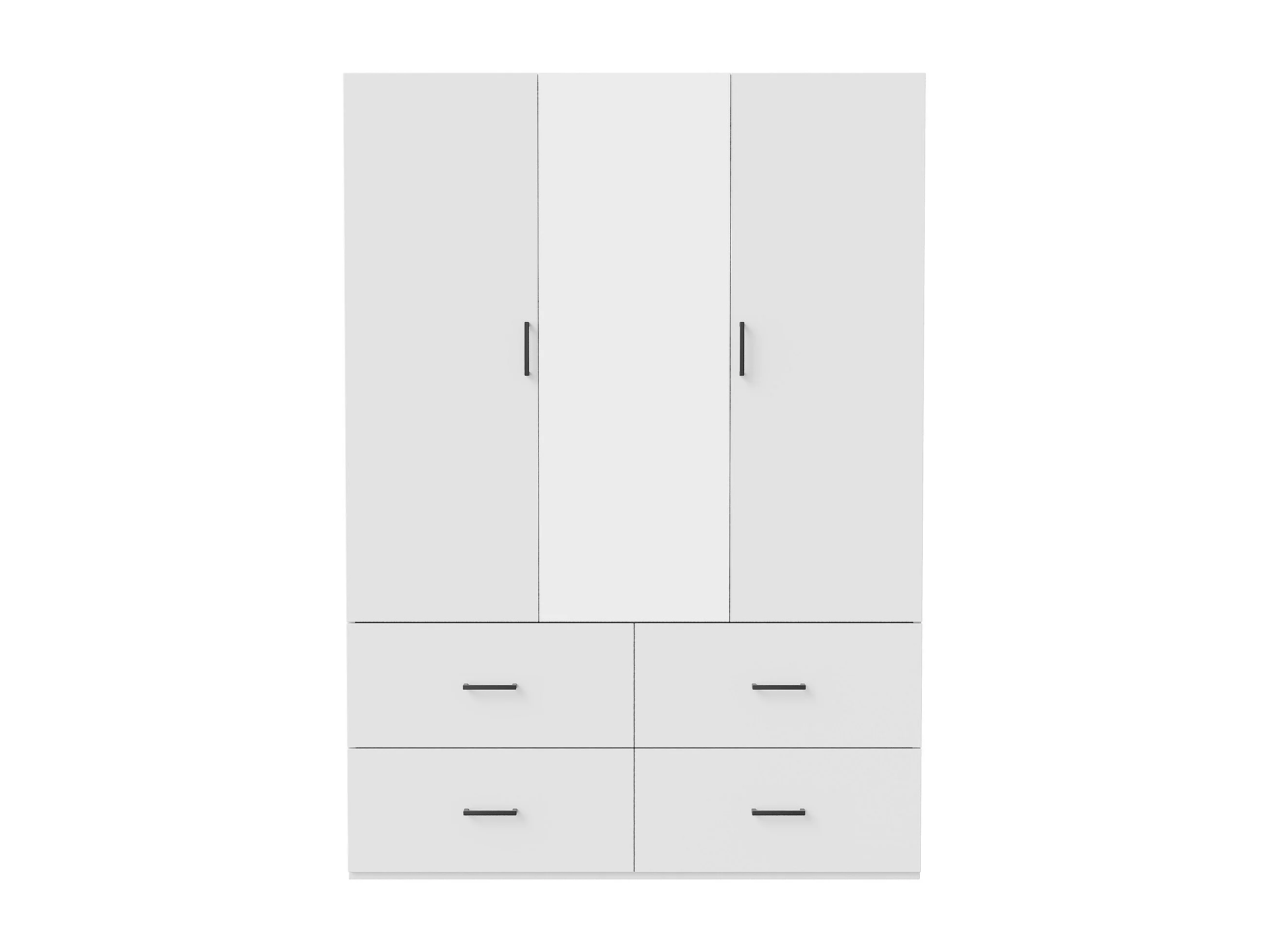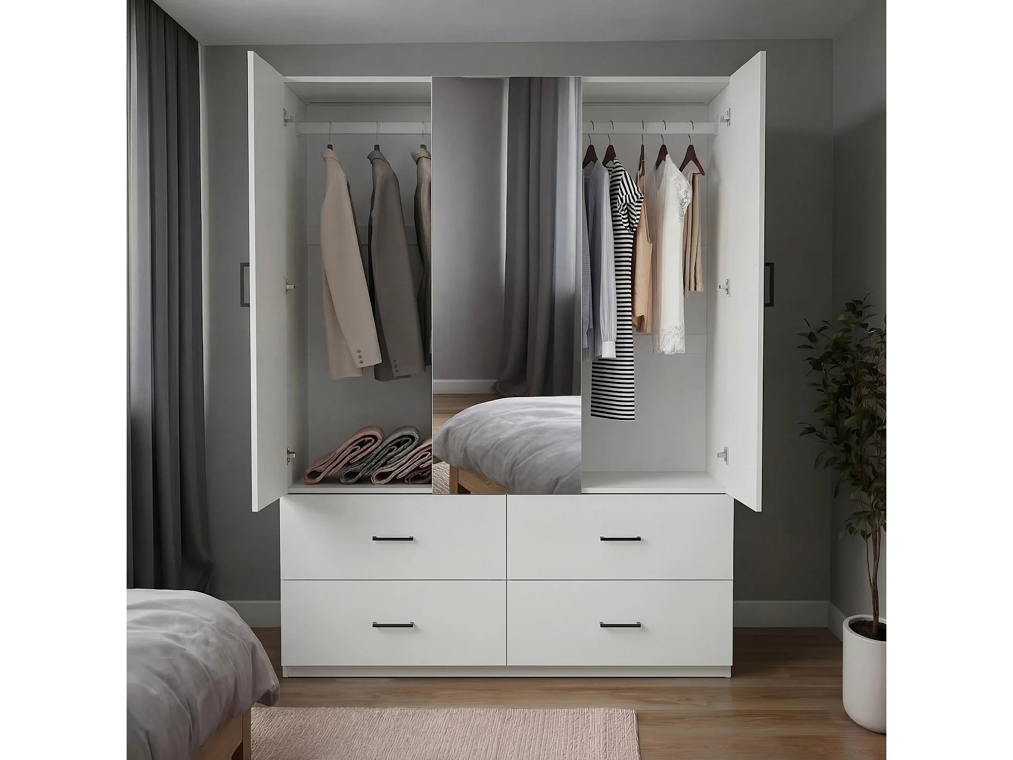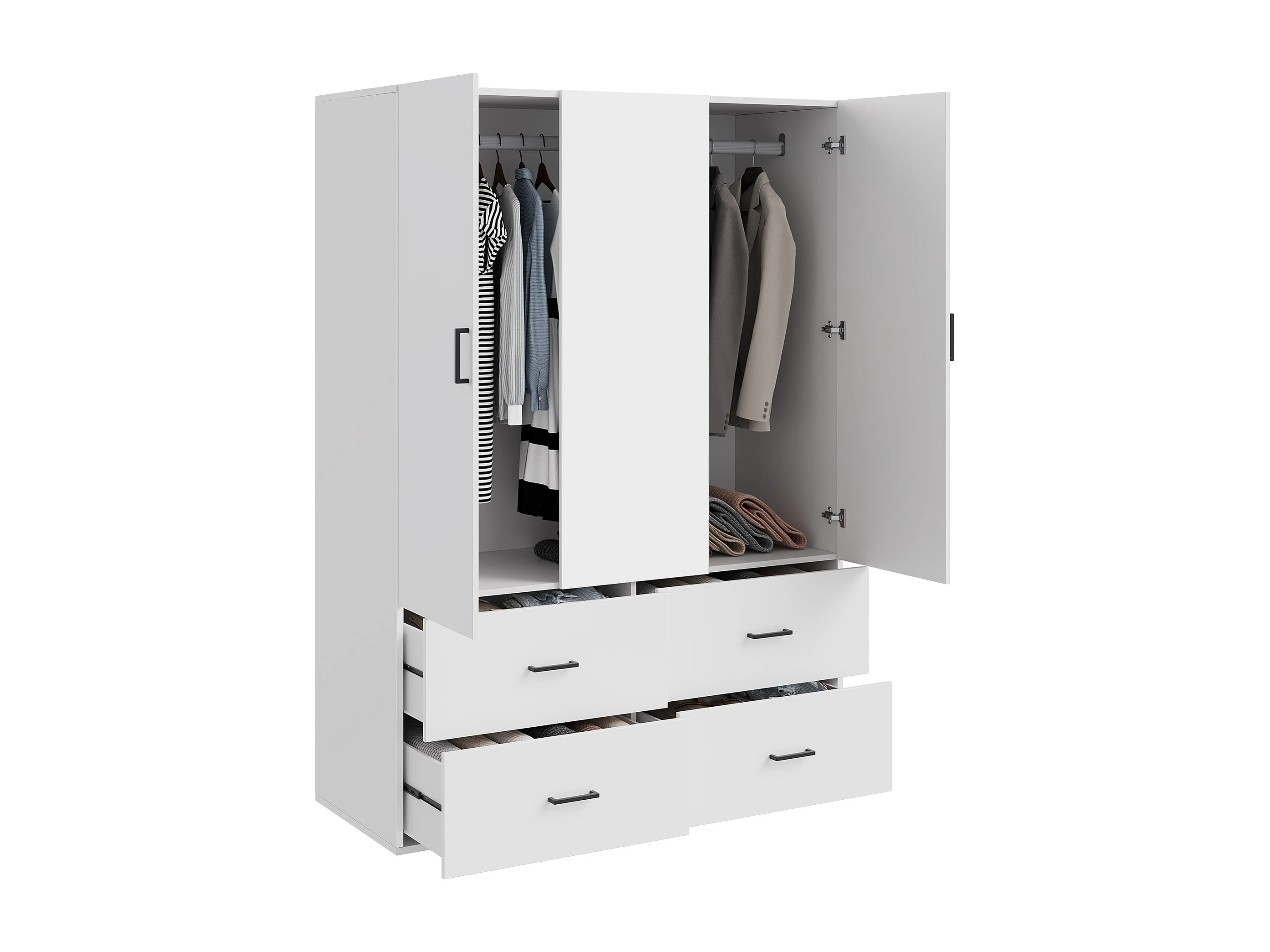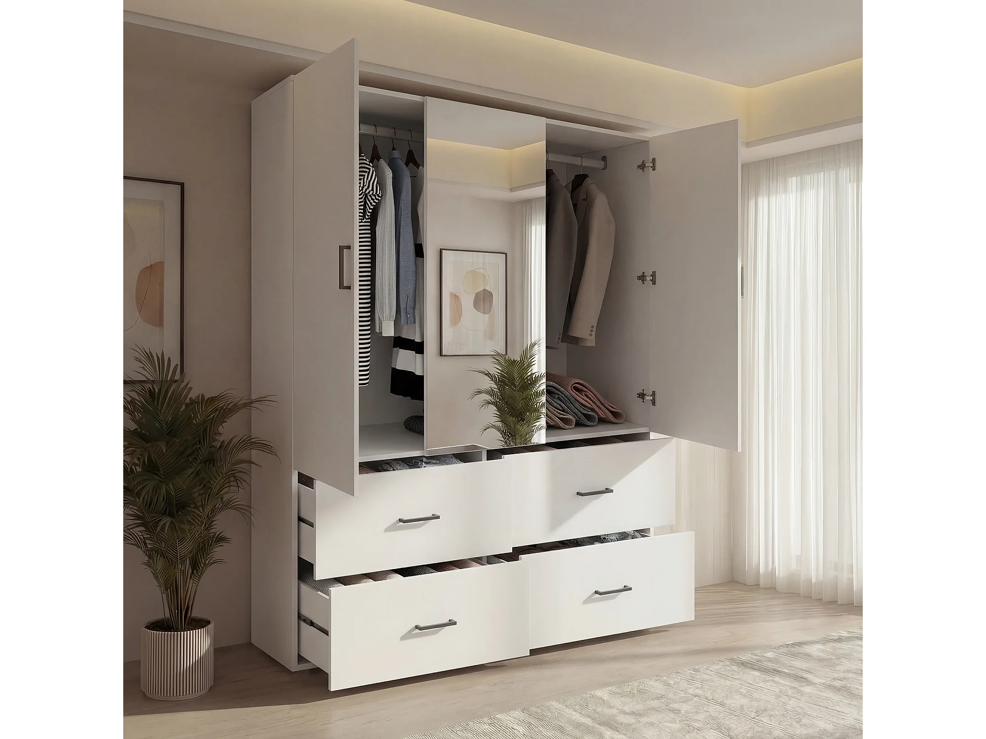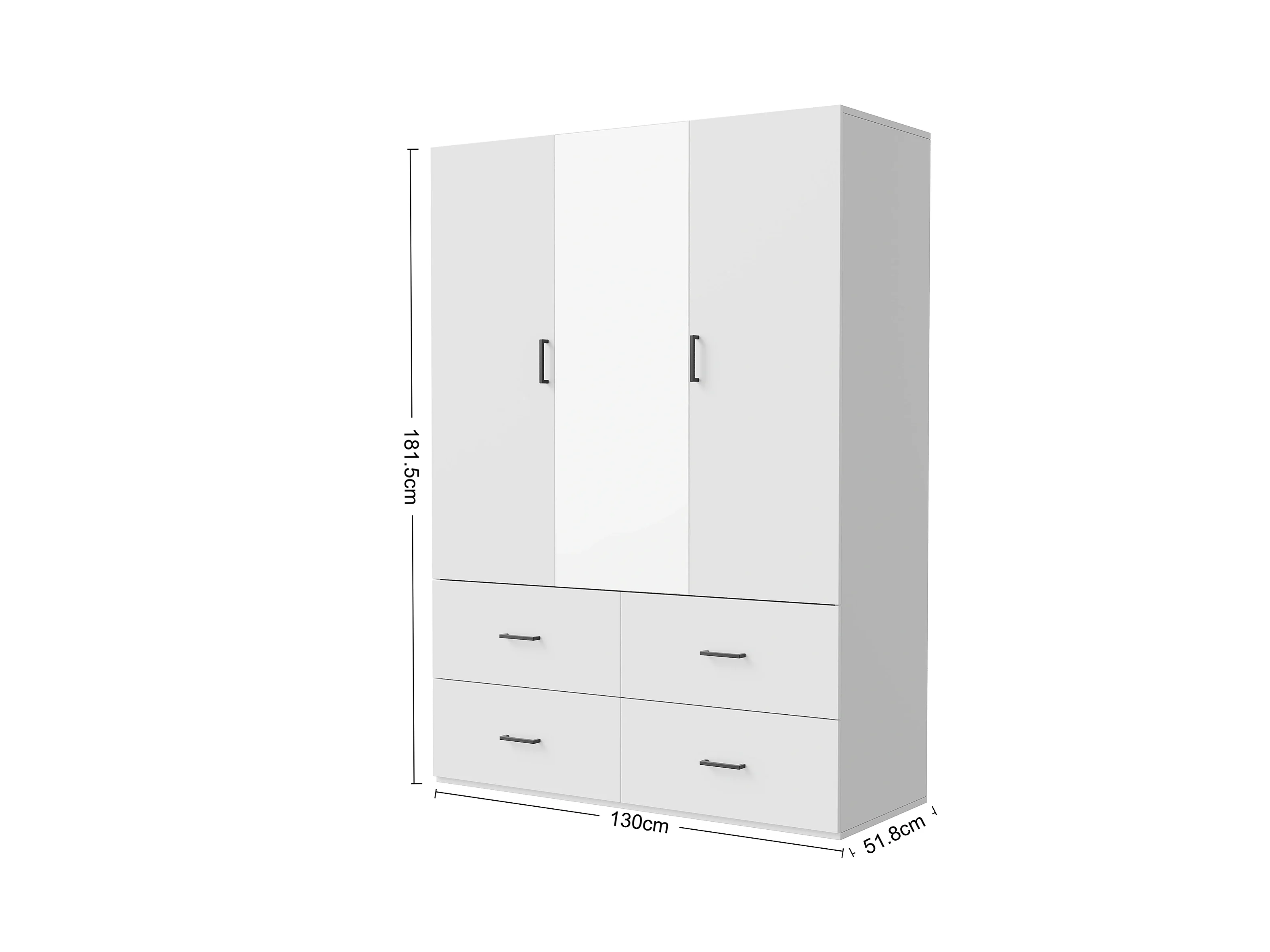 Witte hoekkast met spiegel, 2 deuren, 4 lades, 130x52x182 cm, kledingopslag voor volwassenen