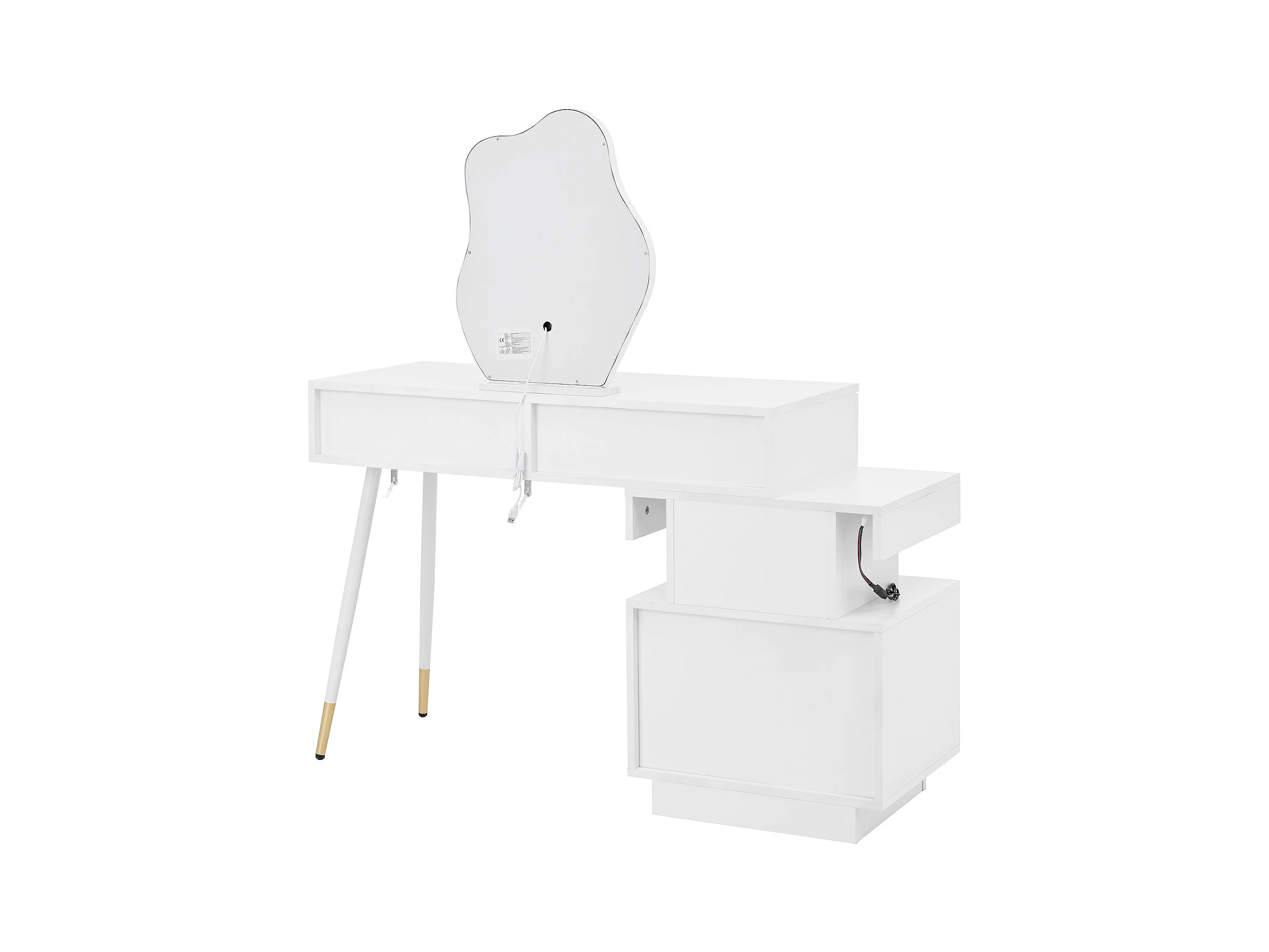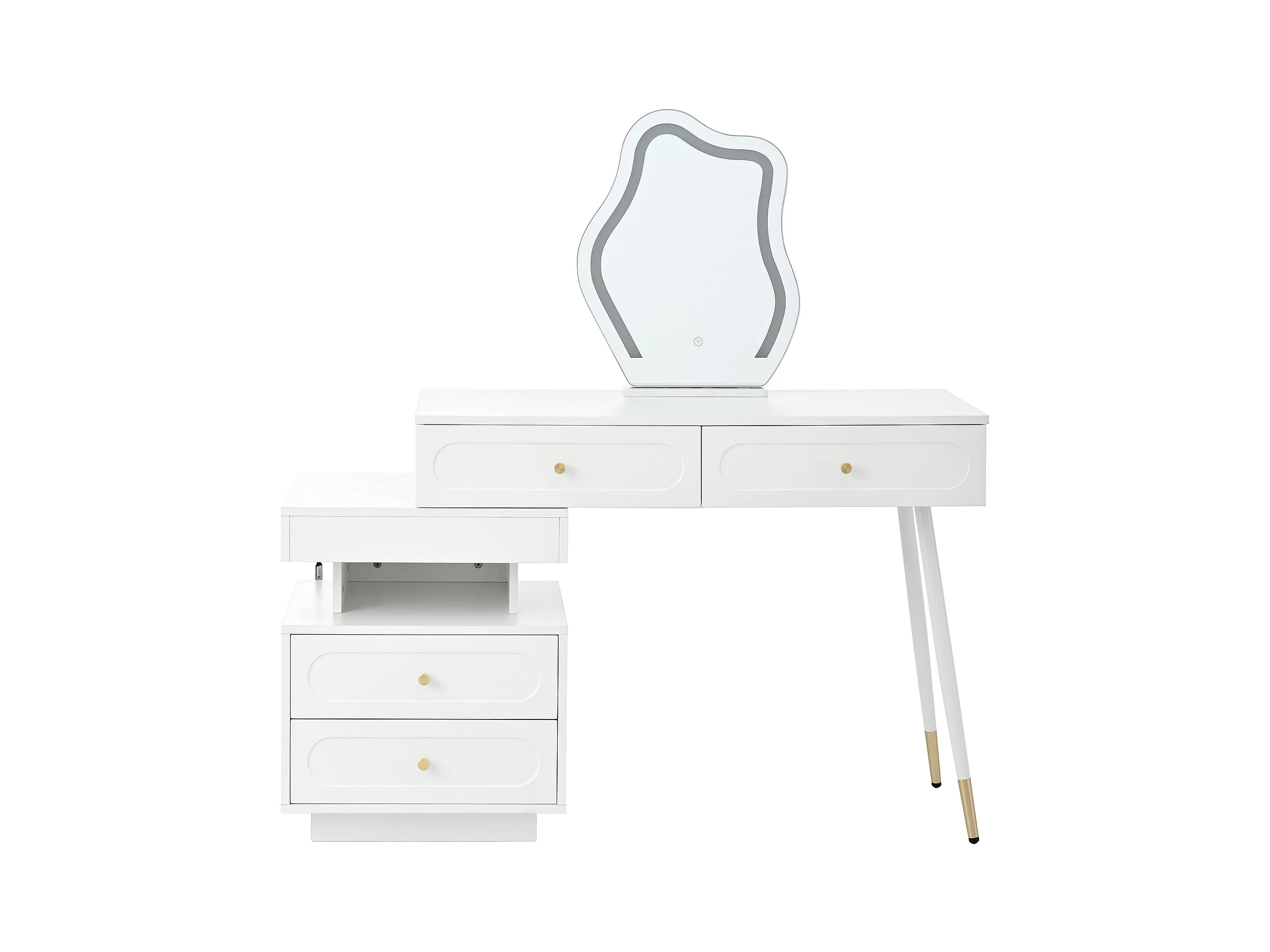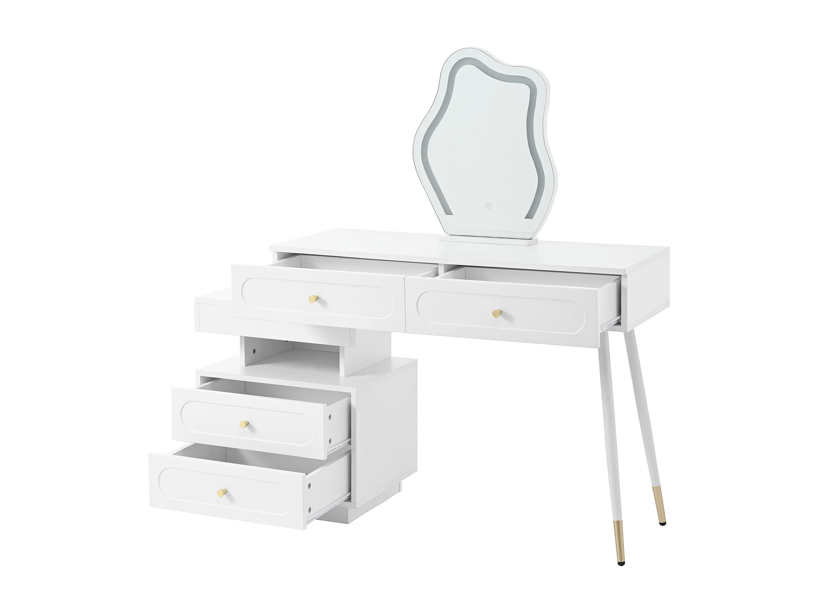 Witte kaptafel met LED-spiegel en 4 lades, gouden handgrepen (zonder kruk)