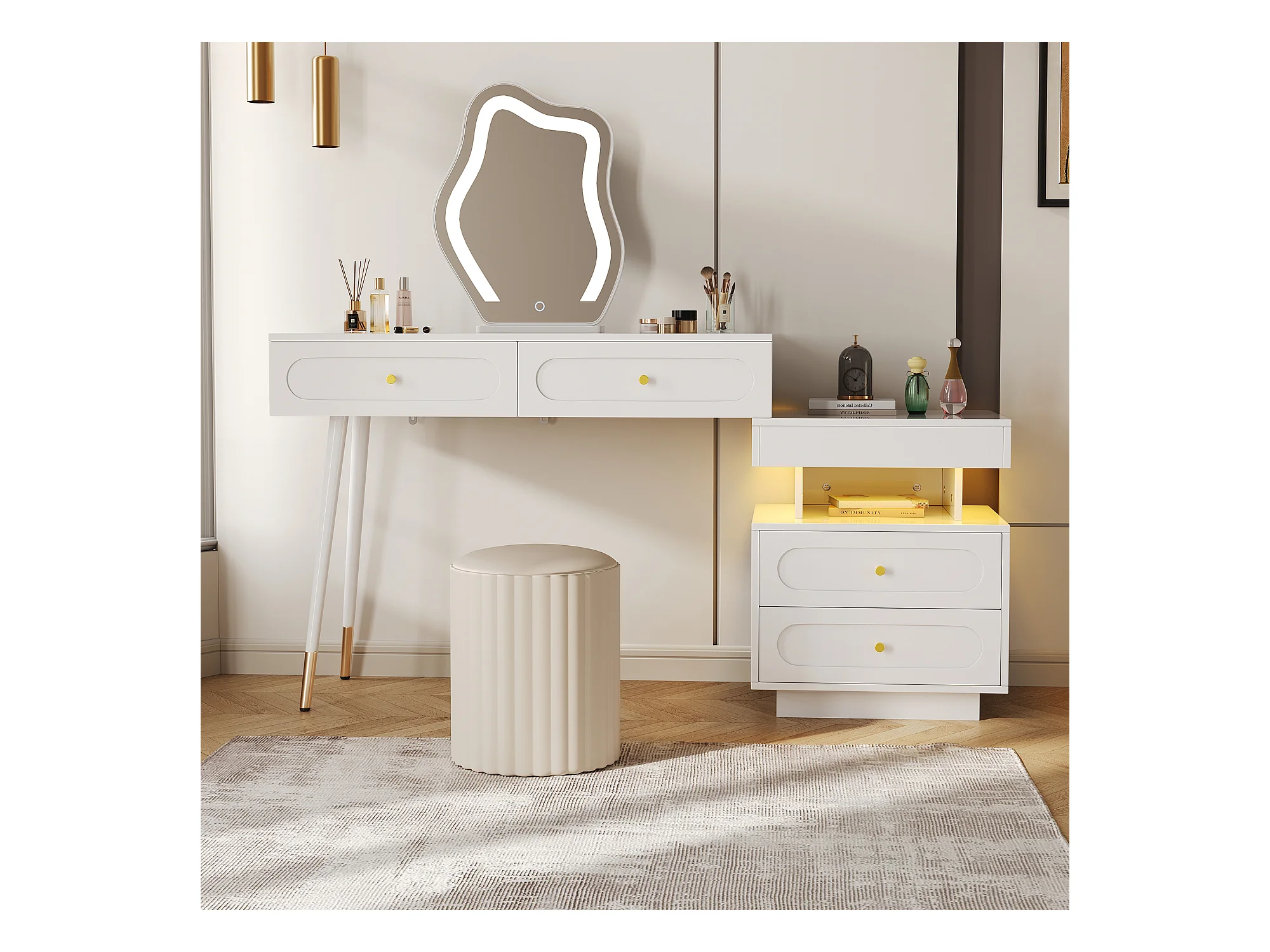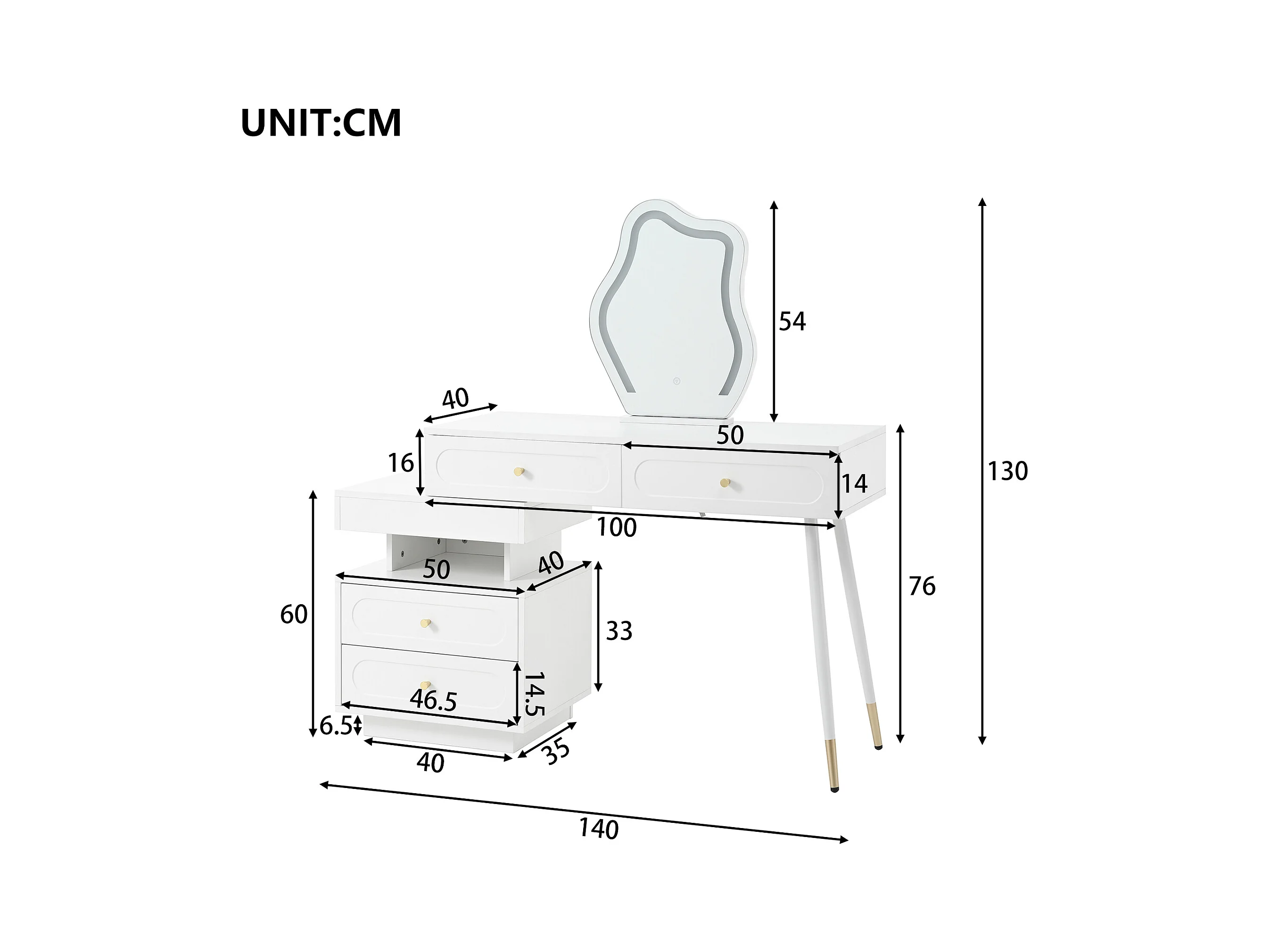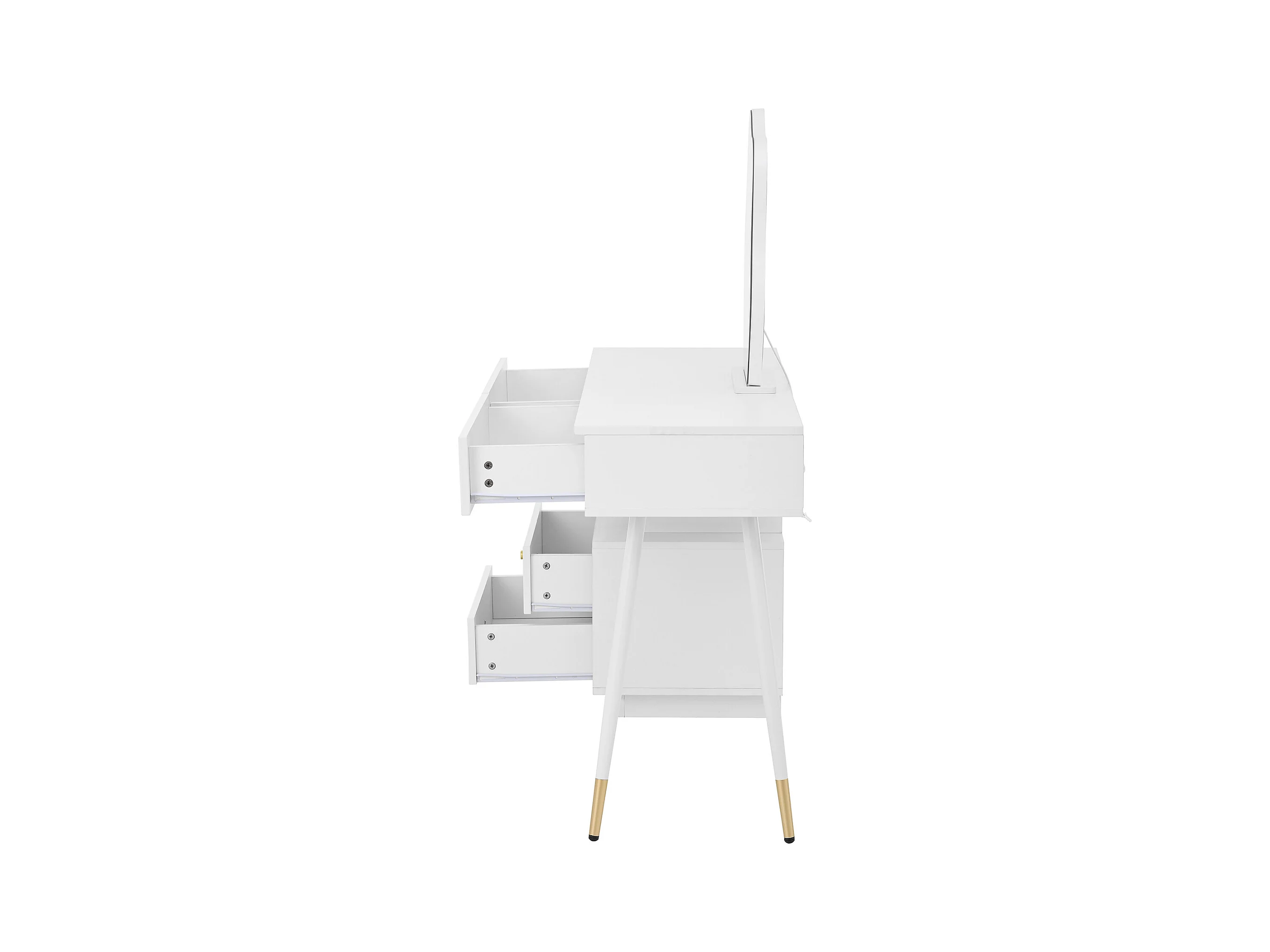 Witte kaptafel met LED-spiegel en 4 lades, gouden handgrepen (zonder kruk)