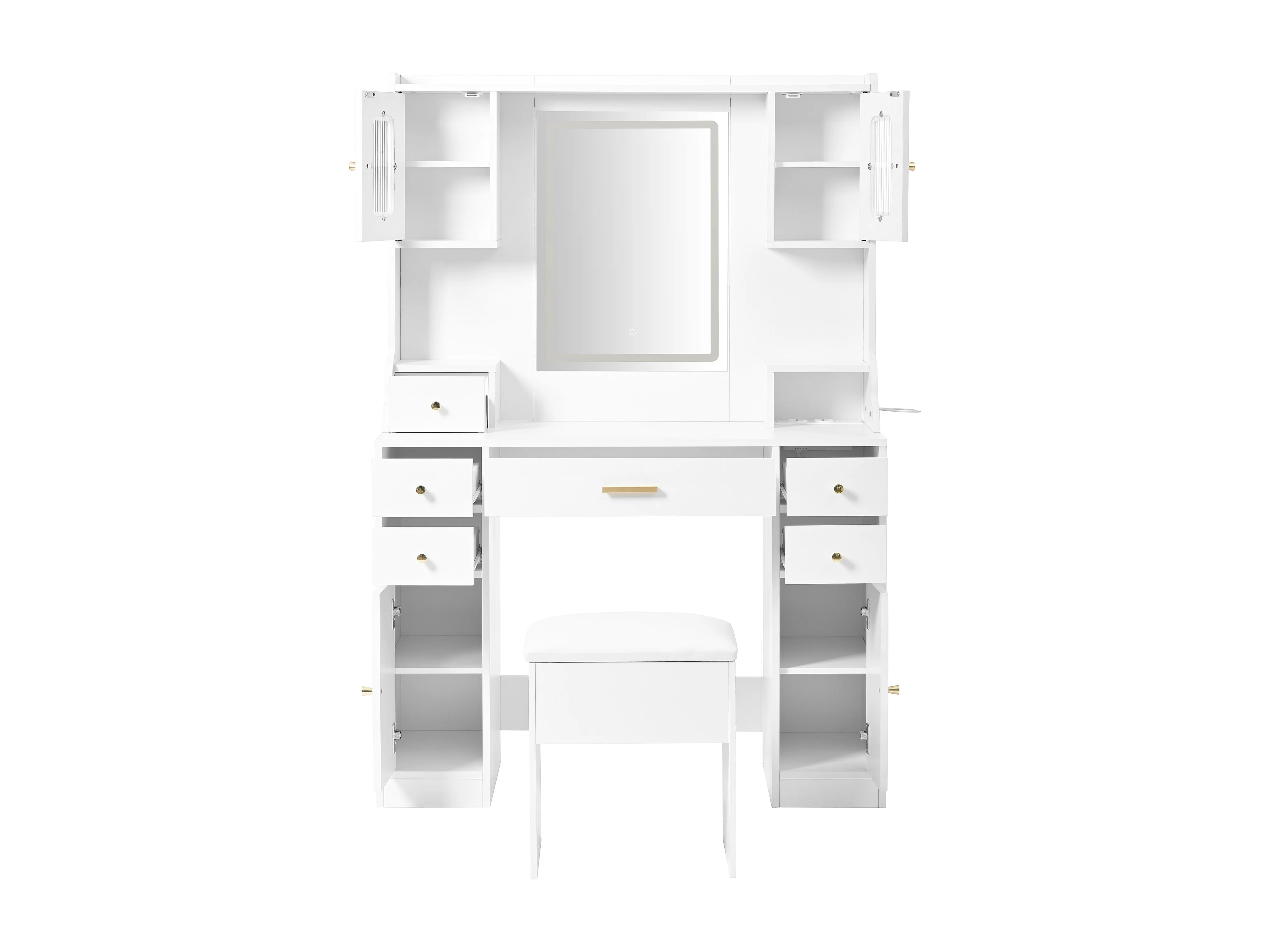 Witte kaptafel met LED-spiegel en stopcontact, 6 lades en 4 deuren - inclusief kruk