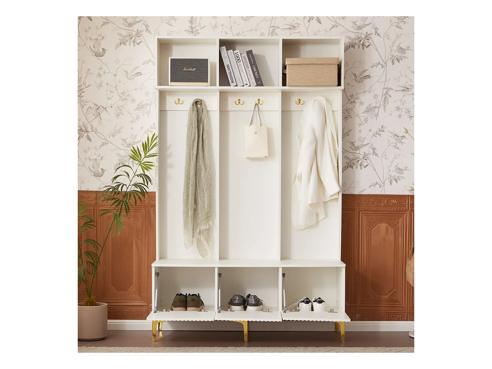 Witte garderobekast met bank, schoenenrek, 3 haken en open opbergruimte 120x40x190 cm