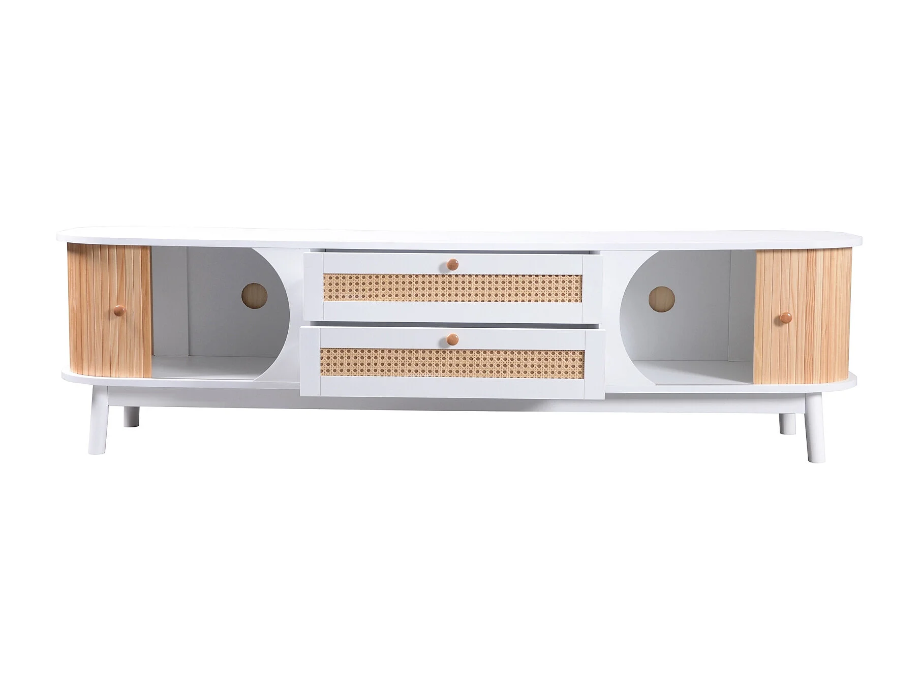 Witte rotan tv-meubel, ladekast met twee deuren en twee lades, wit en hout patchwork