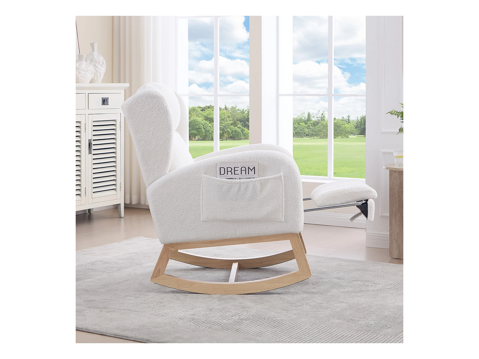 Schommelstoel voor de woonkamer, wit pluche, schommelstoel met uitschuifbare voetensteun, houten frame