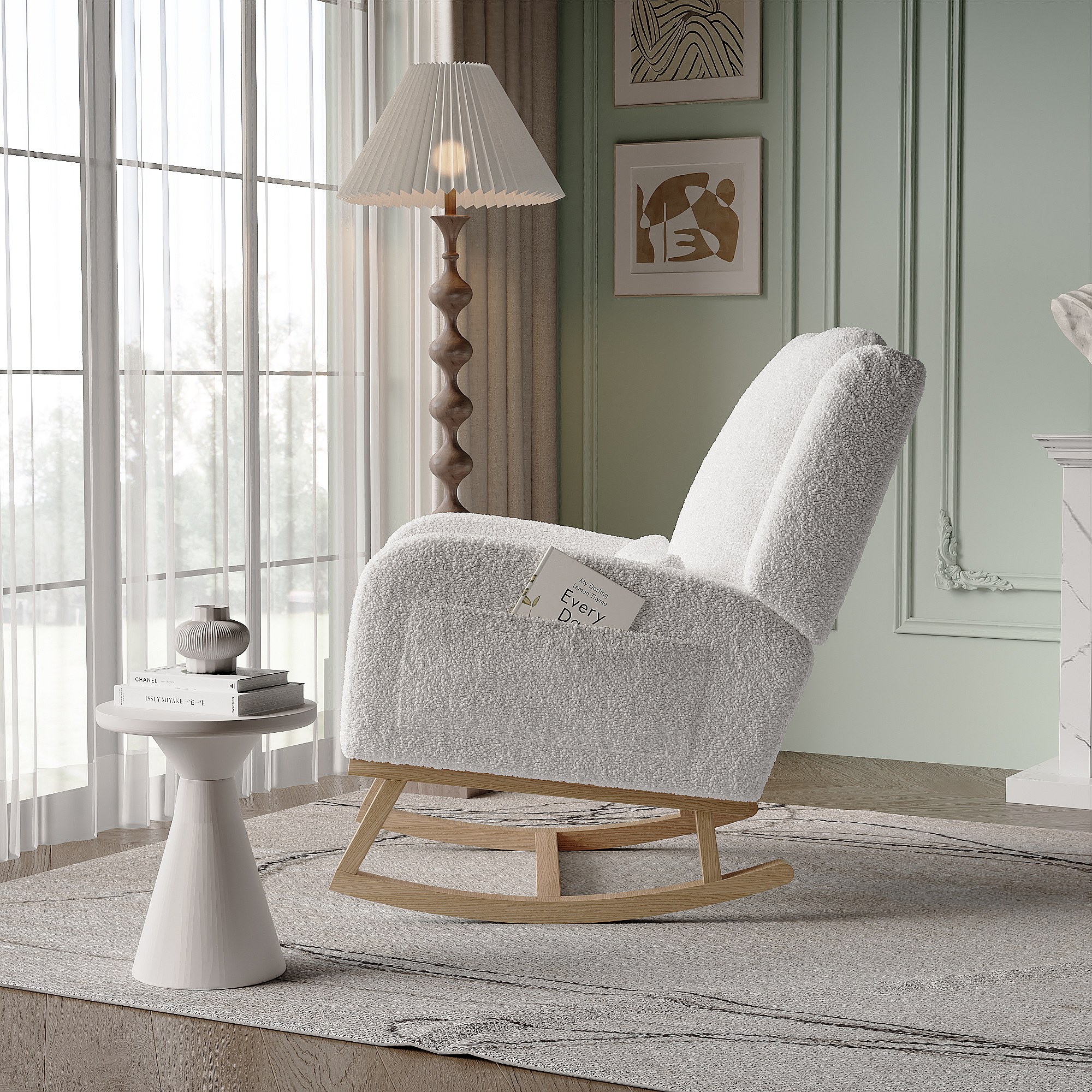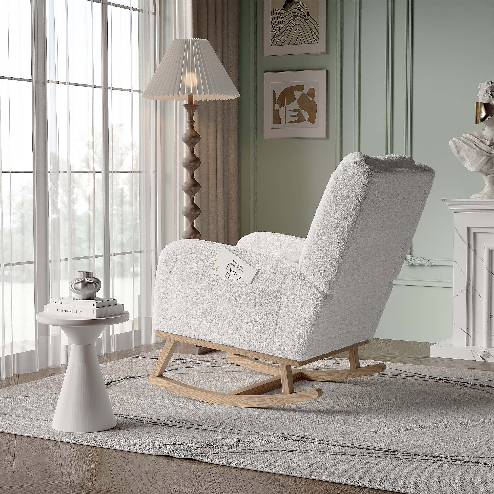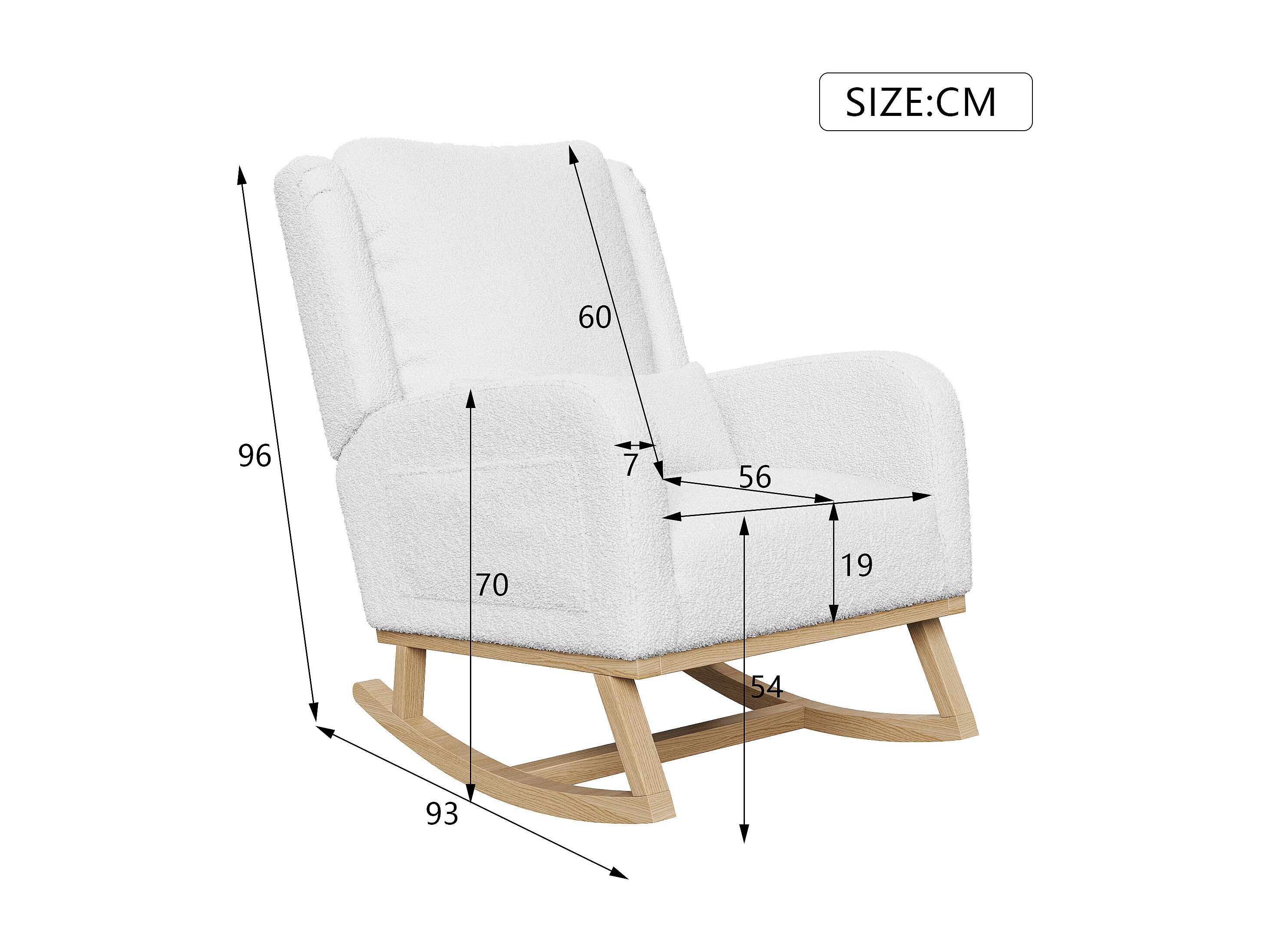 Witte schommelstoel, stoffen schommelstoel met hoge rugleuning, zijvak en lendenkussen, schommelstoel voor binnen en buiten