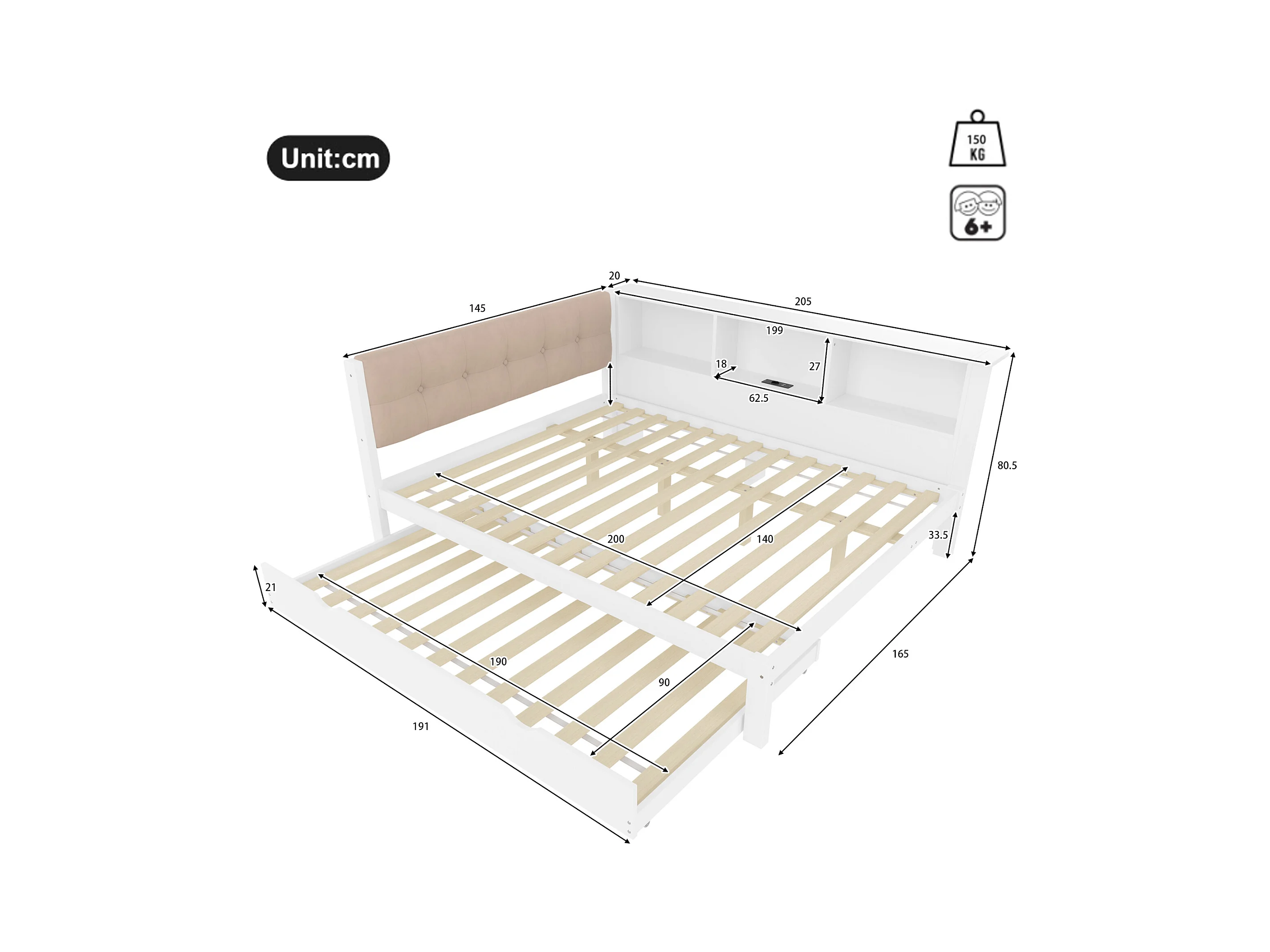 Witte en houten slaapbank 140x200cm met uitschuifbed 90x190cm, meerdere opbergruimtes en oplaadpoort (zonder matras)