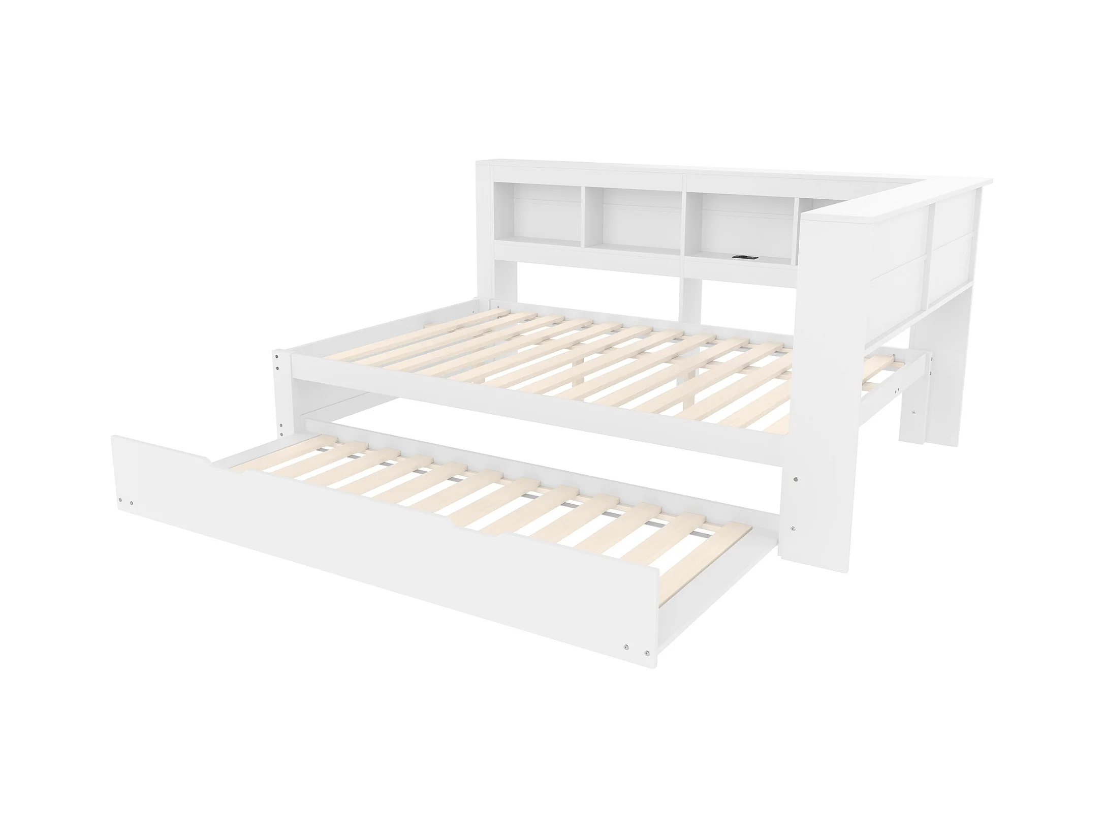 Witte en houten slaapbank 140x200cm met uitschuifbed 90x190cm, meerdere opbergruimtes en oplaadpoort (zonder matras)