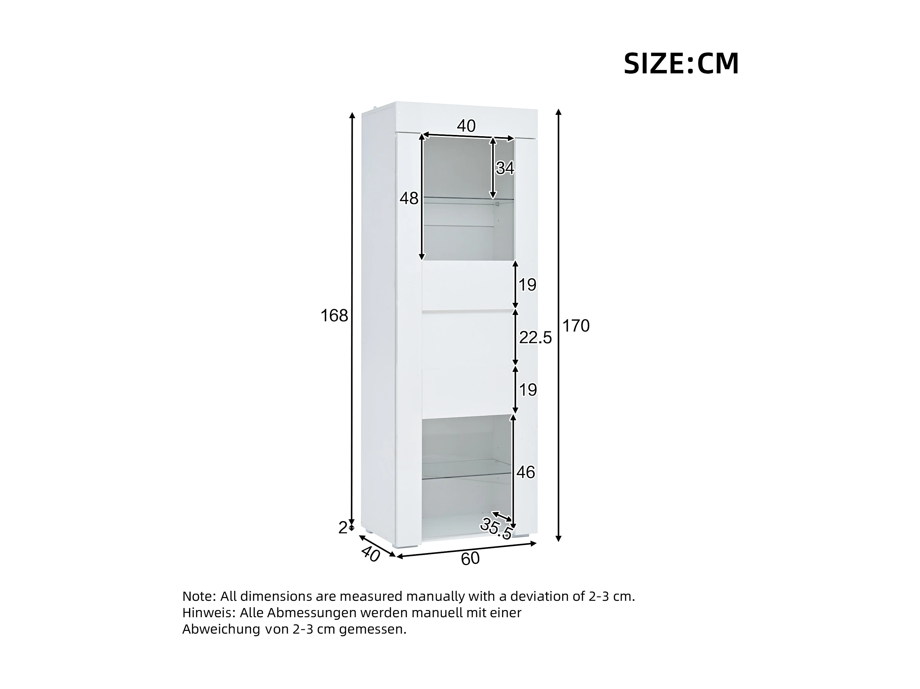 Witte vitrinekast met 1 lade, 4 deuren en LED-verlichting, glazen planken, 55x38x170 cm
