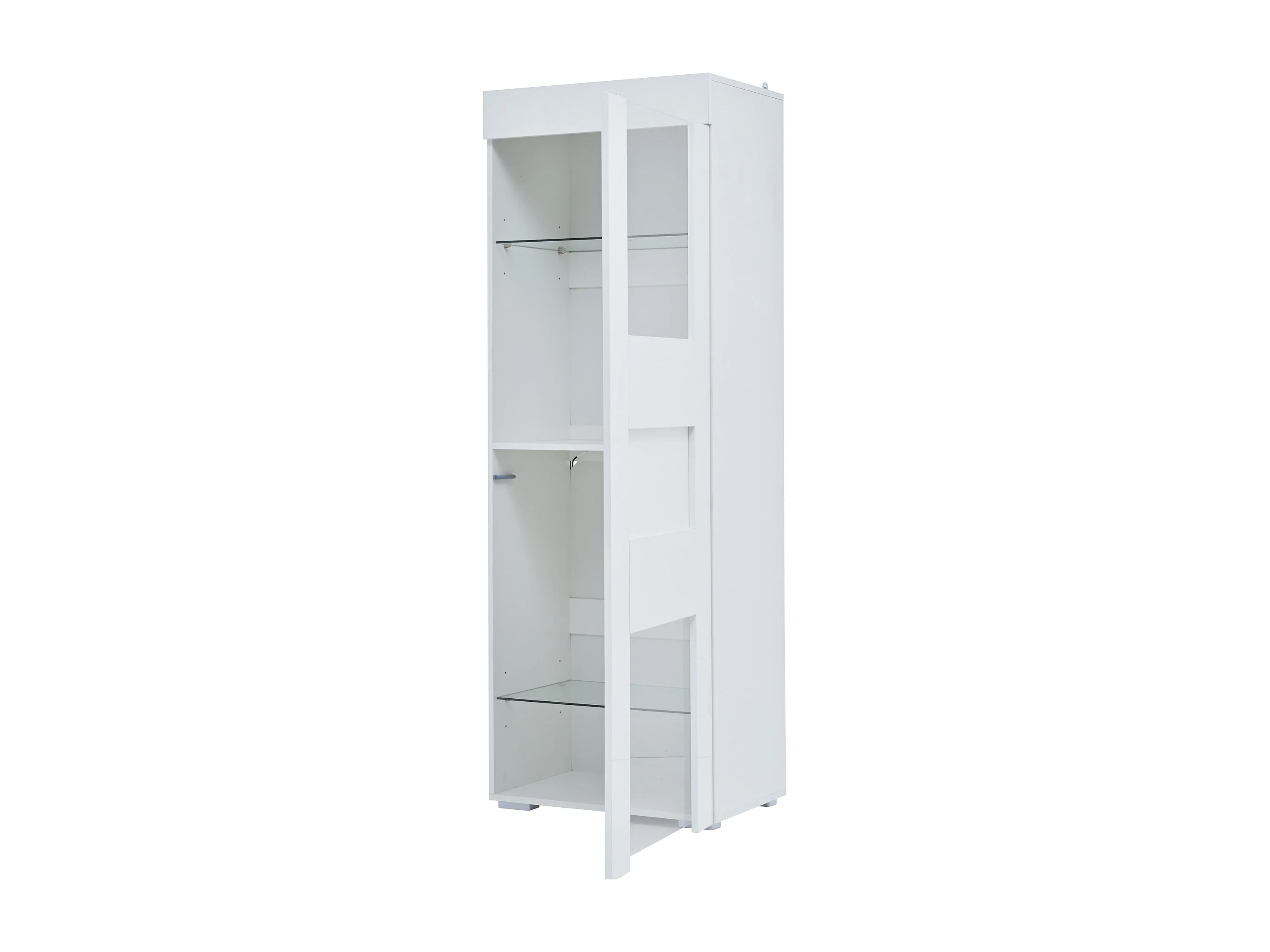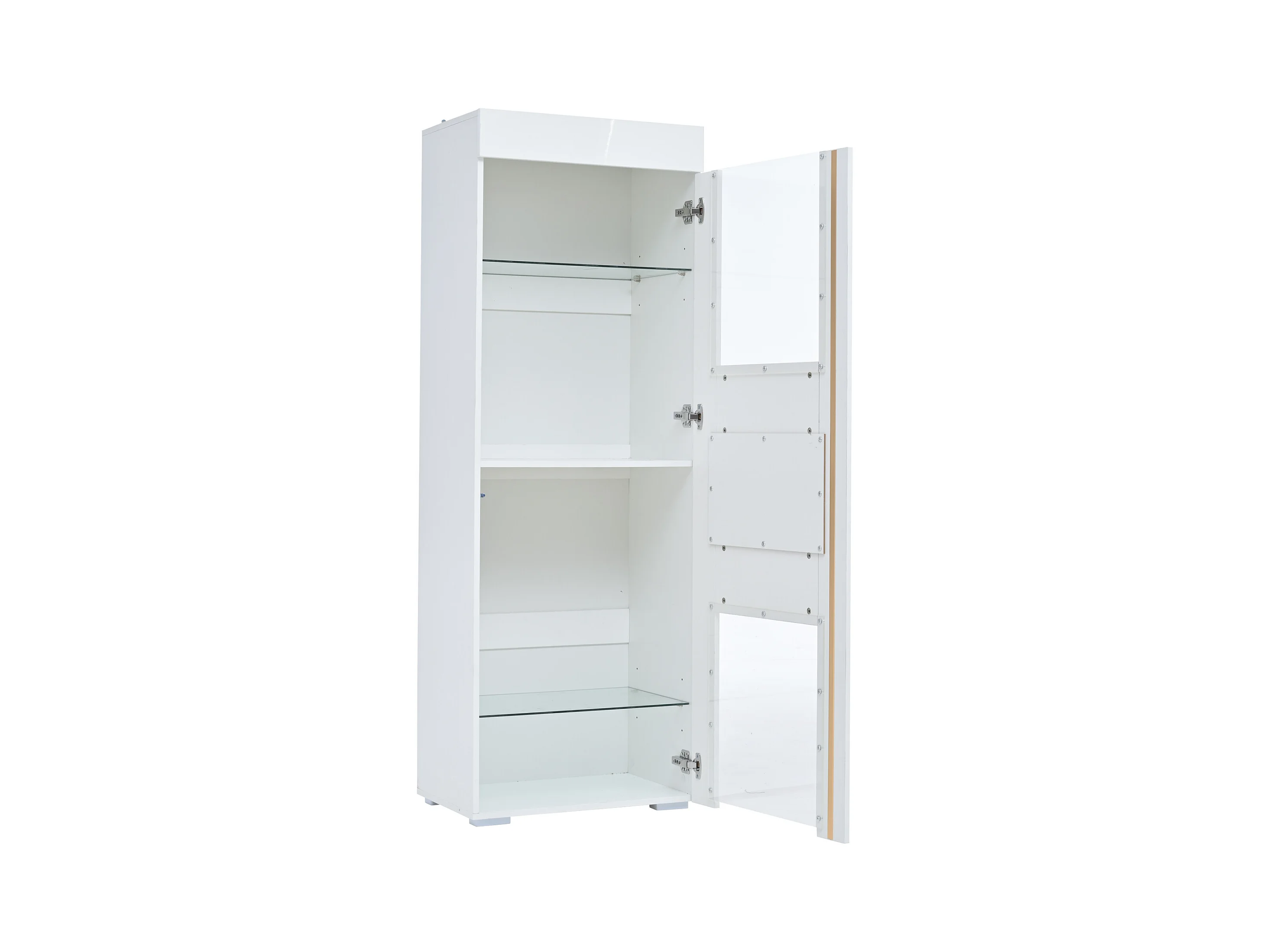 Witte vitrinekast met deur, 2 glazen planken en ledverlichting, meerlaagse opbergruimte