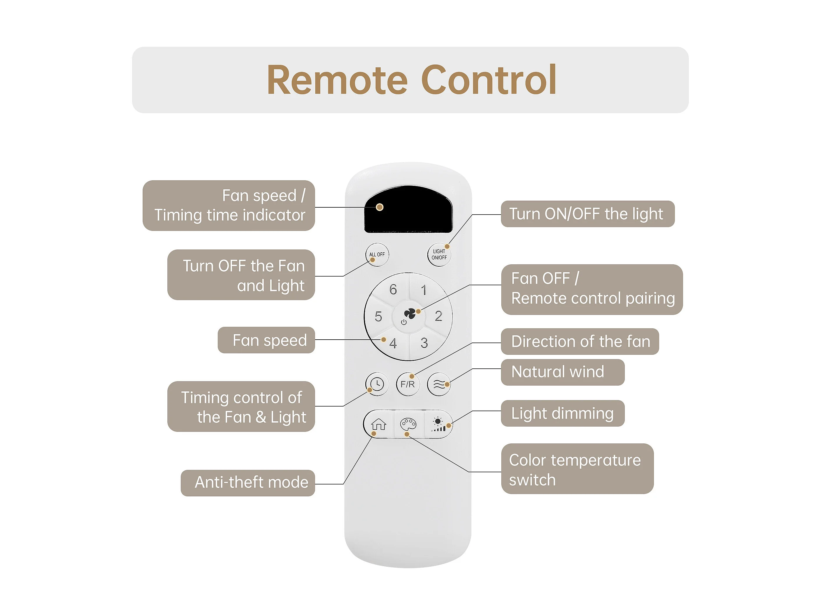 132 cm plafondventilator met 3 gebogen bladen, afstandsbediening, 6 snelheden en timer, omkeerbare DC-motor, natuurlijk licht