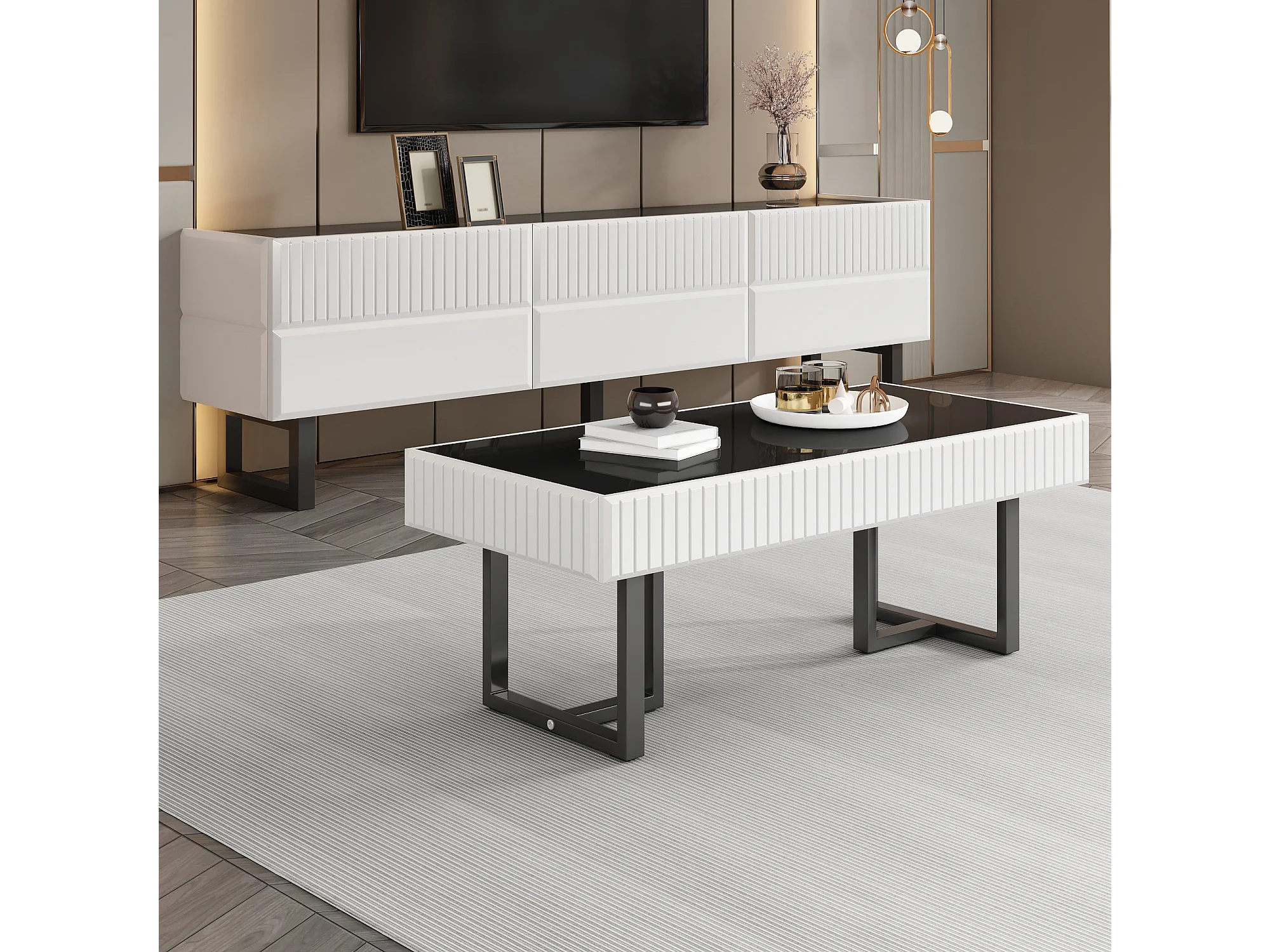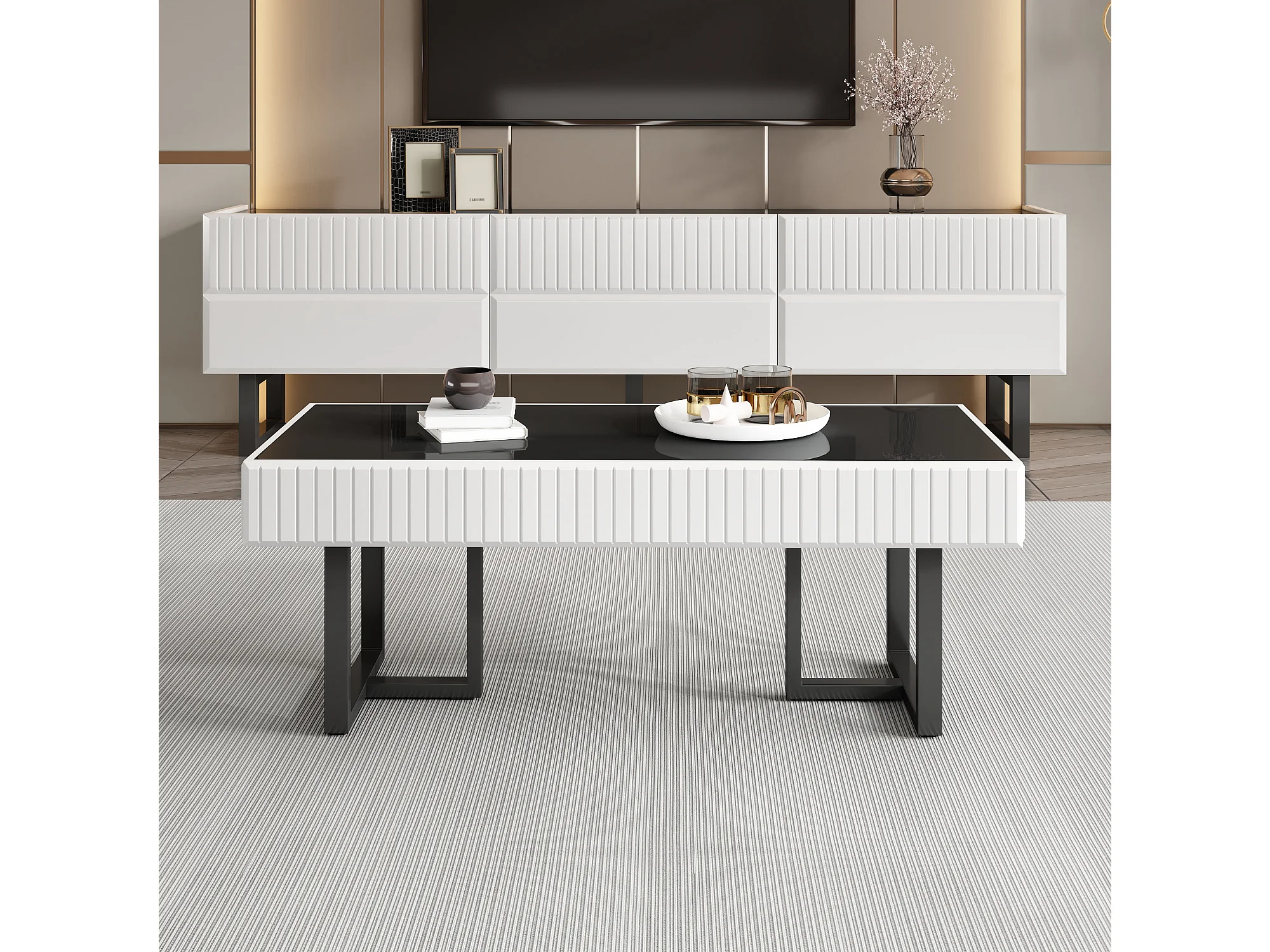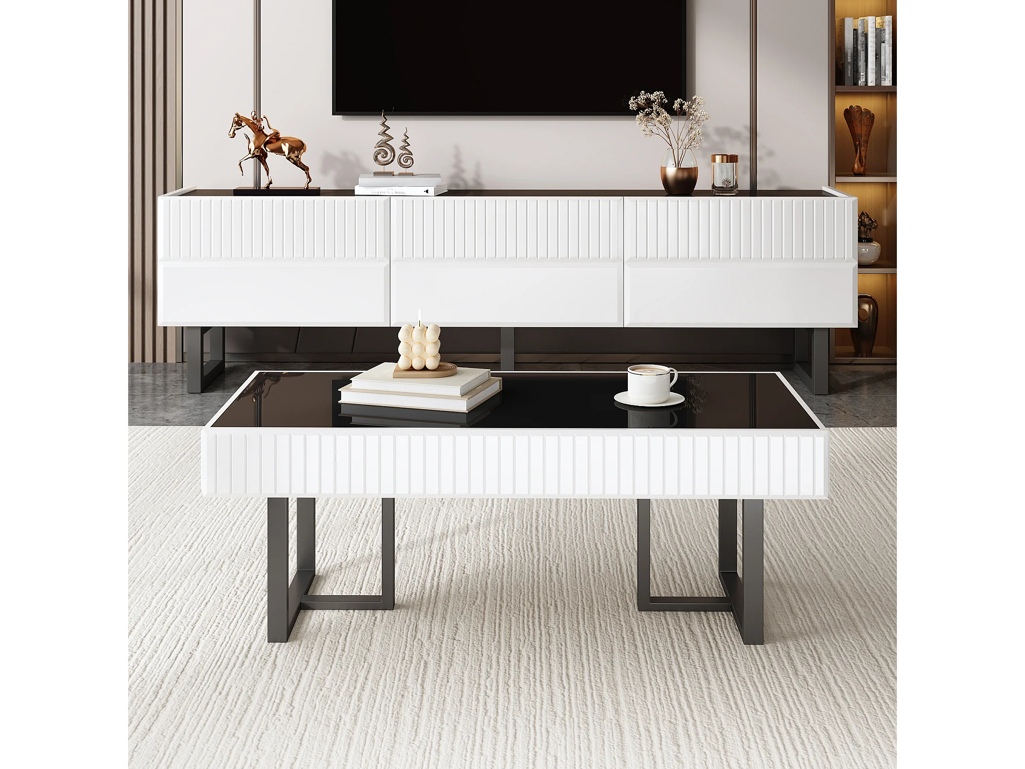 Woonkamermeubelset - salontafel + tv-meubel met 3 lades - MDF + spaanplaat - zwart + wit
